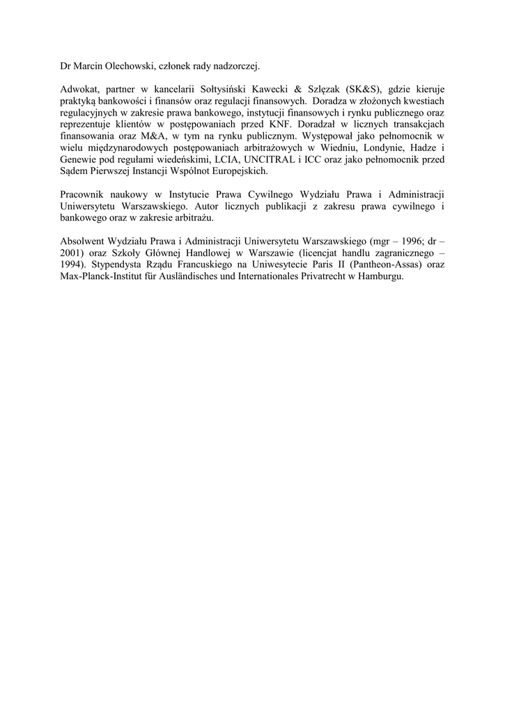Dr Marcin Olechowski, członek rady nadzorczej. Adwokat, partner w kancelarii Sołtysiński Kawecki & Szlęzak (SK&S), gdzie kieruje praktyką bankowości i finansów oraz regulacji finansowych. Doradza w złożonych kwestiach regulacyjnych w zakresie prawa bankowego, instytucji finansowych i rynku publicznego oraz reprezentuje klientów w postępowaniach przed KNF. Doradzał w licznych transakcjach finansowania oraz M&A, w tym na rynku publicznym. Występował jako pełnomocnik w wielu międzynarodowych postępowaniach arbitrażowych w Wiedniu, Londynie, Hadze i Genewie pod regułami wiedeńskimi, LCIA, UNCITRAL i ICC oraz jako pełnomocnik przed Sądem Pierwszej Instancji Wspólnot Europejskich. Pracownik naukowy w Instytucie Prawa Cywilnego Wydziału Prawa i Administracji Uniwersytetu Warszawskiego. Autor licznych publikacji z zakresu prawa cywilnego i bankowego oraz w zakresie arbitrażu. Absolwent Wydziału Prawa i Administracji Uniwersytetu Warszawskiego (mgr – 1996; dr – 2001) oraz Szkoły Głównej Handlowej w Warszawie (licencjat handlu zagranicznego – 1994). Stypendysta Rządu Francuskiego na Uniwesytecie Paris II (Pantheon-Assas) oraz Max-Planck-Institut für Ausländisches und Internationales Privatrecht w Hamburgu.