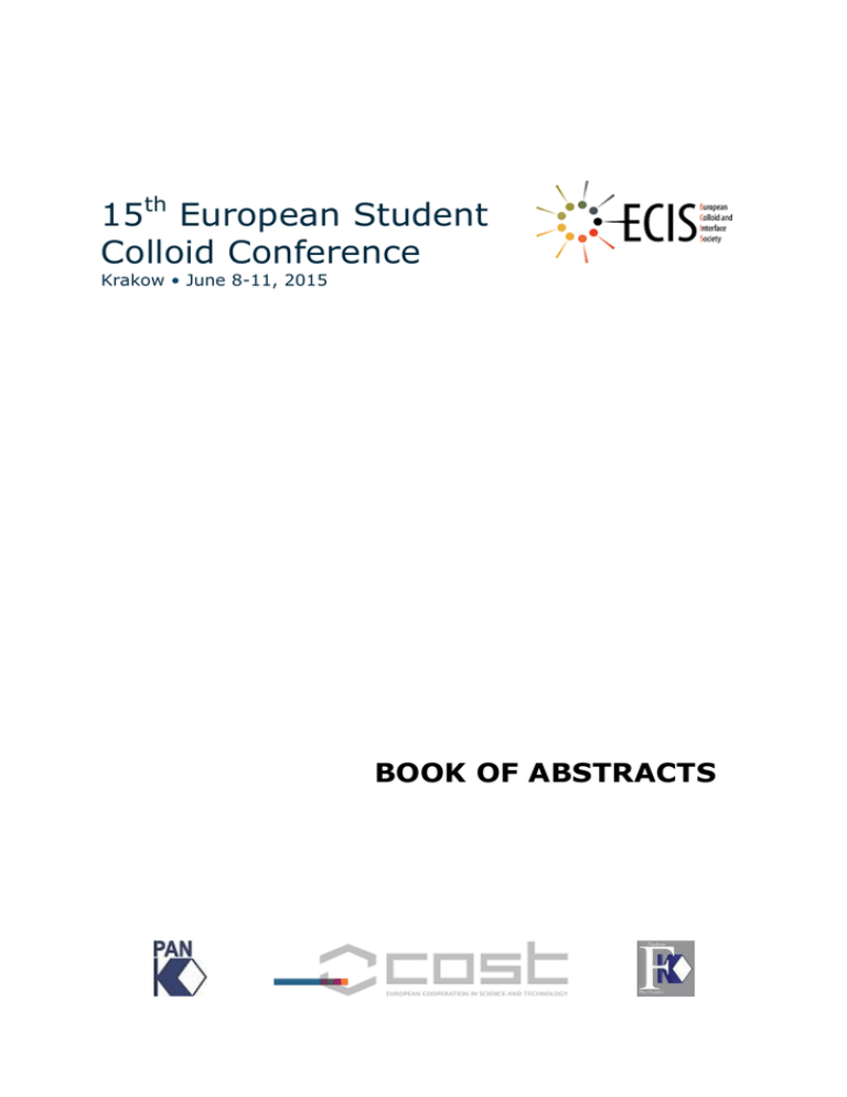ESC 2015 Krakow, June 8-11, 2015 15th European Student Colloid Conference Krakow • June 8-11, 2015 BOOK OF ABSTRACTS ESC 2015 Krakow, June 8-11, 2015 Sponsorship Gold Sponsor Platinium Sponsor 2 ESC 2015 Krakow, June 8-11, 2015 Contents Organizing Committee 4 Conference Programme 5 List of Posters 7 Abstracts 10 Invited lectures 11 Oral presentations 21 Posters 70 List of Conference Participants 114 Authors’ Index 121 3 ESC 2015 Krakow, June 8-11, 2015 Organizing Committee Katarzyna Kilan (chair) Marek Piotrowski (webmaster) Karolina Podgórna (event manager) Magdalena Włodek Marta Łapczyńska Anna Pajor-Świerzy Aneta Kędra Tomasz Kruk Grzegorz Potasiewicz Zofia Krasińska Krzysztof Szczepanowicz Marta Kolasińska-Sojka Magdalena Elżbieciak-Wodka Ewelina Jarek Elżbieta Porębska Supported by: Prof. dr hab. Piotr Warszyński 4 ESC 2015 Krakow, June 8-11,Wednesday, 2015 June 10 Monday, June 8 Tuesday, June 9 10.00 ENRIQUE LOPEZ-CABARCOS (Spain) Entrapment of Enzymes and Drugs within Colloidal Particles for their Application in Health Sciences REINHARD MILLER (Germany) Dynamics of surfactant adsorption layers at water/oil interfaces SZCZEPAN ZAPOTOCZNY (Poland) Micellar multilayer films ZBIGNIEW ADAMCZYK (Poland) Protein Adsorption – a True Story 10:30 coffee coffee coffee coffee 11:00 MARIA CHATZIDAKI (Greece) Formulation and in vitro characterization of W/O colloidal nanodispersions for medical applications JOOYOUNG WON (Germany) β-lactoglobulin adsorption at the water/oil system at different pH and ionic strength MOHMED MULLA (United Kingdom) Preparation of Colloidal Inkjet Inks by Emulsion Polymerisation ALEKSANDRA KEZWOŃ (Poland) The effect of the protein hydrolysis on surface activity and surface dilational rheology of type I collagen 11:20 JOANNA SZAFRANIEC (Poland) Towards Modern Drug Carriers: Nanocapsules Stabilized by Amphiphilic Copolymers WEI LIN (Germany) A thermodynamic study of ligand adsorption to colloidal surfaces demonstrated by means of catechols binding to ZnO QDs MARÍA DEL MAR FERNÁNDEZ MARTÍNEZ-REY (Spain) Effect of the pore size of activated carbon nanoparticles on CDLE (capacitive energy extraction based on double layer expansion) KIRILL EMELYANENKO (Russia) Stability of nanoscale nonionic films atop of discretely charged electrolyte interface 11:40 ANNALISA SALVATORE (Italy) Core-Shell Nanoparticles for DNA Delivery Actuated by Magnetic Fields EMILY JAMES (United Kingdom) Droplet dynamics: Oil droplet attachment and spreading on solid substrates PALOMA ARENAS-GUERRERO (Spain) Anomalous birefringence of planar clay particles GAMON JACINTHE (France) Quantitative determination of anchoring molecules on the surface of ZnO particules and effects on electronical properties 12:00 ROBERTA LIUZZI (Italy) Microstructured fluids at skin interface: biomedical applications TAMAS ONCSIK (Switzerland) Hofmeister Effects in Colloidal Aggregation in Aqueous Solutions of Ionic Liquids 12:20 MARTA KUJDA (Poland) Physicochemical characteristics of albumin dimer and its monolayers on solid surfaces – electrokinetic studies REKA TOTH (France) Silica-ceria interactions during polishing 12:40 KAROLINA PODGÓRNA (Poland) Synthesis of polyelectrolyte nanocapsules with iron oxide nanoparticles for magnetic targeting BRETT SYMONDS (United Kingdom) Quantifying the rainfastness of fluorescently labelled poly(vinyl alcohol) deposits on vicia faba leaf surfaces via fluorescent microscopy 09:00 13:00 13:20 13:40 BIAO LU (France) Evaluation of Cytotoxicity of Biorefinery-derived Amphiphilic Molecules on Multi-scale In-vitro Models VIKTORIA OLIYNYK/ANDREY PANKO (Ukraine) Modification of colloid-chemical and balneological properties of therapeutical muds with nano- and microparticles MARTA ŁAPCZYŃSKA (Poland) Synthesis of the PCL nanoparticles containing neuroprotectants from oil-in-water nanoemulsion by phase inversion emulsification method SŁAWOMIR DROZDEK (Poland) Co-encapsulation of CdSexS1-x/ZnS quantum dots with photosensitizers- colloidal stability and optical properties KATARZYNA KUBIAK (Poland) In situ QCM-D investigation of silver nanoparticle monolayer formation on polycation modified surfaces Thursday, June 11 CHRISTIAN REDEKER (United Kingdom) Surface-confined interactions of lipopolysaccharide layers SEBASTIAN GÖDRICH (Germany) Nanopatterned charge distributions on polyetherimide electret-films MICHAEL MCNALLY (United Kingdom) Nanoparticle Production by Atomic Vapour Deposition on a Liquid Jet MONICA TONELLI (Italy) Investigation of the structural properties of MgObased eco-sustainable cements lunch lunch IDO COOPERSTEIN (Israel) UV Curable Oil-in-Water Emulsions for 3D Functional Printing VAMSEEKRISHNA ULAGANATHAN (Germany) Effect of pH and salt concentration on velocity of rising bubbles in Beta-Lactoglobulin solution ANNA NIECIKOWSKA (Poland) Effect of the bubble dimensions and the shape deformation degrees on its coalescence time at free water surface ESC 2015 Krakow, June 8-11, 2015 14:00 lunch lunch 15:00 CHRISTIAN SCHULZ (The Netherlands) Author workshop – how to successfully publish scientific articles JAN HUPKA (Poland) Filming of bubbles JIRI SMILEK (Czech Republic) Diffusion Techniques as Reactivity Mapping Tool of Biocolloids ANNA LATOWSKA (Poland) Influence of imidazolium ionic liquids structure on aggregation behavior of triton X-100 nonionic surfactant 15.30 16:30 16:50 17:10 MOHSEN MOAZZAMI GUDARZI (Switzerland) Direct Force Measurements Involving Positively and Negatively Charged Colloidal Particles in the Presence of Multivalent Cations SAMUEL SKINNER (Australia) Revisiting Kynchian Analysis of Gravitational and Centrifugal Settling for Strongly Flocculated Suspensions KIRSTY STARK (United Kingdom) Metallic Nanoparticles and their interfacial properties SAOIRSE DERVIN (Ireland) Sol-Gel derived nanostructured materials for thermal insulation applications coffee ANTONIO CARCIATI (Italy) Linear viscoelasticity of human blood 17:50 coffee 18:10 LI
