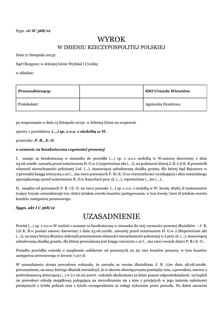 Sygn. akt IC 568/12 WYROK W IMIENIU RZECZYPOSPOLITEJ POLSKIEJ Dnia 27 listopada 2013r. Sąd Okręgowy w Jeleniej Górze Wydział I Cywilny w składzie: Przewodniczący: SSO Urszula Wiewióra Protokolant: Agnieszka Dymitroca po rozpoznaniu w dniu 13 listopada 2013r. w Jeleniej Górze na rozprawie sprawy z powództwa (...) sp. z o.o. z siedzibą w W. przeciwko P. B., E. O. o uznanie za bezskuteczna czynności prawnej I. uznaje za bezskuteczną w stosunku do powódki (...) sp. z o.o.z siedzibą w W.umowę darowizny z dnia 23.06.2008r. zawartą przed notariuszem H. G.w J.(repertorium akt (...)), na podstawie której J. B. (1)i K. B.przenieśli własność nieruchomości położonej J.ul. (...), stanowiącej zabudowaną działkę gruntu, dla której Sąd Rejonowy w J.prowadzi księgę wieczystą o nr (...)na rzecz pozwanych P. B.i E. O.co wierzytelności wynikającej z aktu notarialnego sporządzonego przed notariuszem R. D.w Kancelarii przy ul. (...), repertorium (...)nr (...), II. zasądza od pozwanych P. B. i E. O. na rzecz powoda (...) sp. z o.o. z siedzibą w W. kwotę 18383 zł (osiemnaście tysięcy trzysta osiemdziesiąt trzy złote) tytułem zwrotu kosztów postępowania, w tym kwotę 7200 zł tytułem zwrotu kosztów zastępstwa procesowego. Sygn. akt I C 568/12 UZASADNIENIE Powód (...) sp. z o.o.w W.wniósł o uznanie za bezskuteczną w stosunku do niej czynności prawnej dłużników – J. B. (1)i K. B.w postaci umowy darowizny z dnia 23.06.2008r. zawartej przed notariuszem H. G.w J.(Repertorium akt (...)), na mocy której dłużnicy dokonali przeniesienia własności nieruchomości położonej w J.przy ul. (...), stanowiącej zabudowaną działkę gruntu, dla której prowadzona jest księga wieczysta o nr (...)na rzecz swoich dzieci P. B.i E. O.. Ponadto powódka wniosła o zasądzenie solidarnie od pozwanych na jej rzec kosztów procesu, w tym kosztów zastępstwa procesowego w kwocie 7.217 zł. W uzasadnieniu strona powodowa wskazała, że zawarła ze swoim dłużnikiem J. B. (1)w dniu 28.08.2008r. porozumienie, na mocy którego dłużnik oświadczył, że w okresie obowiązywania pomiędzy nim, a powodem, umowy z podwykonawcą dotyczącej (...) w J.z 16.02.2007r. wskutek okoliczności za które ponosi odpowiedzialność, wyrządził on powodowi szkodę majątkową polegającą na nierozliczeniu się z nim z przyjętych w jego imieniu należności pieniężnych z tytułu pobrań oraz z tytułu wynagrodzenia za usługi wykonane przez powoda. Na dzień zawarcia porozumienia wysokość szkody poniesionej przez powoda wynosiła 260.115,54 zł na którą składały się należności z tytułu pobrań i wynagrodzenia za usługi za okres 30.01.2008-31.07.2008 wraz z odsetkami ustawowymi. Małżonka dłużnika K. B.zaakceptowała treść porozumienia i poręczyła wynikające z niego zobowiązanie męża. W związku z porozumieniem dłużnicy złożyli w formie aktu notarialnego oświadczenia o poddaniu się egzekucji. Część należności dłużników objętych porozumieniem w kwocie 36.814,86 zł została rozliczona poprzez potrącanie przez powoda wzajemnych należności stron wynikających po stronie powoda z zawartego porozumienia, a po stronie dłużnika z tytułu świadczonych przez niego na rzecz powódki usług. Dłużnicy nie spłacali kolejnych rat w ustalonych terminach, co skutkowało wystąpieniem w 2009r. przez powoda do Sądu Rejonowego w J.o nadanie klauzuli wykonalności wskazanemu wyżej aktowi notarialnemu oraz wszczęciem postępowania egzekucyjnego przeciwko dłużnikom. W toku postępowania egzekucyjnego okazało się, że dłużnicy nie posiadają majątku z którego wierzyciel mógłby się zaspokoić. Jednocześnie strona powodowa ustaliła, że dłużnicy w dniu 23.06.2008r. darowali swoim dzieciom zabudowaną nieruchomość położoną w J.. W ocenie powoda, skoro zobowiązanie dłużników powstało przed datą zawarcia przez nich z pozwanymi umowy darowizny, działali oni z zamiarem jego pokrzywdzenia. Podnosił, że wskutek tej umowy pozwani będący dziećmi dłużników, to jest osobami pozostającymi z nimi w bliskim stosunku, uzyskali korzyść majątkową w postaci własności nieruchomości, co w konsekwencji spowodowało niewypłacalność dłużników. W ocenie powódki wskazane okoliczności uzasadniały wystąpienie z powództwem opartym na art. 527 § 1 k.c. Dodał, że w sprawie znajdują zastosowanie domniemania prawne określone w art. 527 § 3, 528 oraz 529 k.c. Pozwany P. B. w odpowiedzi na pozew wniósł o oddalenie powództwa w całości oraz zasądzenie na jego rzecz od pozwanego kosztów postępowania w kwocie 7.217 zł (k. 77-80). Zaprzeczył, aby dłużnicy działali ze świadomością pokrzywdzenia wierzycieli. Podniósł, że jego ojciec, J. B. (1), od wielu lat współpracował z powódką, tworzył sieć magazynów (J., W.), a także zapewniał stałą obsługę przewozów transportowych przesyłek (...) przekazywanych przez powoda. Dodał, że jego dzienne obroty oscylowały w granicach 200.000 zł, a dochody miesięczne w granicach 300.000 zł. Podkreślał, że w dacie zawarcia umowy darowizny sytuacja finansowa dłużnika była bardzo dobra. Wskazał, że umowa darowizny nie została dokonana z zamiarem pokrzywdzenia wierzycieli, a była podyktowana koniecznością zapewnienia opieki rodzicom dłużnika, zamieszkującym w nieruchomości przy ul. (...)w J.. Dłużnik wraz z żoną nie byli wstanie zapewnić im właściwej opieki, z uwagi na obciążające ich obowiązki związane z pracą zawodową, między innymi w związku z rozszerzeniem działalności na W., dlatego darowali nieruchomość swoim dzieciom. Ponadto pozwany wskazał, że darowizna została dokonana w czerwcu 2008r., kiedy to powód nie był jeszcze wierzycielem J. B. (1)– nie miał żadnych roszczeń względem ojca obdarowanych. W ocenie pozwanego, do zadłużenia J. B. (1)doszło dopiero po zerwaniu z nim współpracy przez powoda, na początku grudnia 