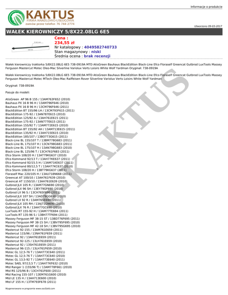 Informacje o produkcie Utworzono 09-03-2017 WAŁEK KIEROWNICZY 5/8X22.08LG 6E5 Cena : 234,55 zł Nr katalogowy : 4049582740733 Stan magazynowy : niski Średnia ocena : brak recenzji Wałek kierowniczy traktorka 5/8X22.08LG 6E5 738-0919A MTD AtisGreen Bauhaus BlackEdition Black-Line Efco Floraself Greencat Gutbrod LuxTools Massey Ferguson Mastercut Motec Oleo-Mac Silverline Variolux Verts Loisirs White Wolf Yardman Oryginał: 738-0919A Oryginał: 738-0919A Pasuje do modeli: eK AK TU AtisGreen AP 96 B 155 / 13AM763F652 (2010) Bauhaus PX 16 B 96 H / 13AM796F646 (2010) Bauhaus PX 16 B 96 H / 13CM796F646 (2011) BlackEdition BT 155/96 LH / 13CM793F615 (2011) BlackEdition 175-92 / 13AN787E615 (2010) BlackEdition 125/92 A / 13AH761E615 (2011) BlackEdition 175-92 / 13AN777E615 (2011) BlackEdition 155/92 T / 13AM772E615 (2010) BlackEdition BT 155/92 AH / 13AM713E615 (2011) BlackEdition 135/92 H / 13AH715E615 (2010) BlackEdition 185/107 / 13BO773G615 (2011) Black-Line BL 155/107 T / 13BM778G683 (2011) Black-Line BL 175/107 H / 13CN798G683 (2011) Black-Line BL 175/107 H / 13AN798G683 (2010) Black-Line BL 125/96 T / 13CH761F683 (2011) Efco Storm 108/20 H / 13AT79KG637 (2010) Efco Kommand 92/13 T / 13AH77KE637 (2011) Efco Kommand 92/15.5 H / 13AM71KE637 (2011) Efco Kommand 80/12,5 T / 13AH77KC637 (2010) Efco Storm 108/20 H / 13BT79KG637 (2011) Floraself Mac 220/105 H / 13AU718N668 (2011) Greencat AT 100/10 / 13AH761F639 (2010) Greencat AT 1150/10 / 13AH761E639 (2010) Gutbrod JLX 105 R / 13AM77GN690 (2010) Gutbrod JLX 96 SH / 13EY79GF690 (2010) Gutbrod LX 96 S / 13CH765F690 (2011) Gutbrod JLX 107 SH / 13AD79GG690 (2010) Gutbrod LX 92 R / 13AM765E690 (2011) Gutbrod JLX 105 RH / 13AJ71GN690 (2010) Gutbrod JLX 76 R / 13AH77GC690 (2010) LuxTools RT 155-92 H / 13AM77TE694 (2011) LuxTools RT 135-96 S / 13BH77TF694 (2011) Massey Ferguson MF 38-15 ST / 13BD776F695 (2011) Massey Ferguson MF 38-15 SH / 13BV795F695 (2010) Massey Ferguson MF 42-18 SH / 13BV795G695 (2010) Mastercut 92-155 / 13AM761E659 (2011) Mastercut 115/96 / 13NH761F659 (2011) Mastercut 92 / 13AH761E659 (2011) Mastercut 92-125 / 13LH761E659 (2010) Mastercut 92 / 13SH761E659 (2011) Mastercut 96-115 / 13LH761F659 (2010) Motec GL 12,5-76 T / 13AH773C640 (2011) Motec GL 12,5-76 T / 13AH773C640 (2010) Motec GL 13,5-92 T / 13AH773E640 (2011) Motec SAEL 97/13,5 T / 13AH77KF632 (2010) Mtd Ranger 1 (155/96 T) / 13AM778F661 (2010) Mtd RS 125/96 B / 13CH761F600 (2011) Mtd Racing 155-107 / 13EM761G600 (2010) Mtd LE 135 H / 13AH713E600 (2010) Mtd LF 155 H / 13TM793F678 (2011) S Wałek kierowniczy traktorka 5/8X22.08LG 6E5 738-0919A MTD AtisGreen Bauhaus BlackEdition Black-Line Efco Floraself Greencat Gutbrod LuxTools Massey Ferguson Mastercut Motec MTech Oleo-Mac Raiffeisen Rover Silverline Variolux Verts Loisirs White Wolf Yardman Wygenerowano w programie www.oscGold.com eK S AK TU Mtd LN 155 / 13RM773N600 (2011) Mtd Racing 175-107 H / 13EN791G600 (2010) Mtd LG 175 / 13RN773G600 (2010) Mtd LN 155 / 13RM773N600 (2010) Mtd LF 125 / 13RH773F600 (2010) Mtd LF 155 T / 13CM763F600 (2011) Mtd LG 175 H / 13EN793G600 (2010) Mtd Ranger 2 (20/107 T) / 13BT778G661 (2011) Mtd Racing 125-96 / 13EH761F676 (2010) Mtd LE 135 / 13RH773E600 (2010) Mtd Ranger 2 (20/107 T) / 13AT778G661 (2010) Mtd Ranger 2 H (20/10... / 13BT798G661 (2011) Mtd LA 125 / 13RH773A600 (2010) MTech M 200/105 H / 13AT715N605 (2011) MTech M 175/107 T / 13AN765G605 (2010) Oleo-Mac Krosser 92/13,5 T / 13AH77KE636 (2010) Oleo-Mac Tornado 95/11,5 T / 13BH768F636 (2011) Oleo-Mac Tornado 95/11,5 T / 13AH768F636 (2010) Oleo-Mac Tornado 97/13 T / 13BH77KF636 (2011) Oleo-Mac Krosser 80/12,5 T / 13AH77KC636 (2010) Oleo-Mac Krosser 80/12,5 T / 13AH77KC636 (2011) Oleo-Mac Krosser 92/15.5 H / 13AM71KE636 (2011) Raiffeisen RMH 7125-76 T / 13AH777C628 (2011) Raiffeisen RMS 7145-96 T / 13BM777F628 (2011) Raiffeisen RMS 7145-96 T / 13AM777F628 (2010) Raiffeisen RMH 7200-105 H / 13AT717N628 (2010) Rover Raider 14/38" / 13AM76TF333 (2011) Silverline SC 125/92 / 13AH761E677 (2011) Variolux 96-125 / 13AH761F620 (2010) Verts Loisirs VL 92 HBA / 13AM71TE617 (2011) Verts Loisirs VL 96 H / 13CM79TF617 (2011) Verts Loisirs VL 92 BA / 13AH761E617 (2011) Verts Loisirs VL 96 H / 13AM79TF617 (2010) Verts Loisirs VL 92 BA / 13AH761E617 (2010) Verts Loisirs VL 92 HBA / 13AM71TE617 (2010) White 105-175 / 13AN761N680 (2010) White 155/96 / 13BM761F680 (2011) White 115-96 / 13BH761F680 (2011) White 92-135 / 13LH761E680 (2010) Wolf Ambition 107.175 H / 13TN79RG650 (2011) Wolf Select 105.155 T / 13RM77RN650 (2011) Wolf Select 76.125 T / 13AH76RC650 (2011) Wolf Select 107.175 T / 13TN77RG650 (2011) Yardman TE 7130 / 13BH77YE643 (2011) Yardman HG 7175 / 13CD79YG643 (2011) Yardman RF 7125 / 13CH775F643 (2011) Yardman TG 7155 / 13EM77YG643 (2010) Yardman HE 7155 / 13AD71YE643 (2010) Yardman RS 7125 / 13CH765F643 (2011) Yardman TC 7125 / 13AH77YC643 (2010)