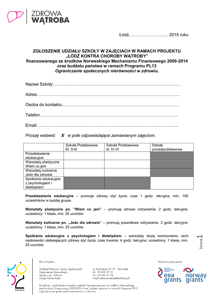 Łódź, …………………….. 2015 roku ZGŁOSZENIE UDZIAŁU SZKOŁY W ZAJĘCIACH W RAMACH PROJEKTU „ŁÓDŹ KONTRA CHOROBY WĄTROBY” finansowanego ze środków Norweskiego Mechanizmu Finansowego 2009-2014 oraz budżetu państwa w ramach Programu PL13 Ograniczanie społecznych nierówności w zdrowiu. Nazwa Szkoły:………………………………….………………………………………… Adres: ….………………………………………………………………………………….. Osoba do kontaktu:……………………………………………………………………… Telefon………………..………………………………………………………………….. Email: …………………………………………………………………………………….. Proszę wstawić X w pole odpowiadające zamawianym zajęciom. Szkoła Podstawowa Kl. 0-III Szkoła Podstawowa kl. IV-VI Szkoła ponadpodstawowa Przedstawienie edukacyjne Warsztaty plastyczne Wiem co jem Warsztaty kulinarne Jedz dla zdrowia Spotkania edukacyjne z psychologiem i dietetykiem Przedstawienie edukacyjne – promuje zdrowy styl życia; czas 1 godz. lekcyjna; min. 100 uczestników w każdej grupie. Warsztaty plastyczne pn. ”Wiem co jem” – promują zdrowe odżywianie; 2 godz. lekcyjne, uczestnicy: 1 klasa, min. 25 uczniów. Strona Spotkania edukacyjne z psychologiem i dietetykiem – warsztaty służą wzmocnieniu cech osobowości ułatwiających zdrowy styl życia; czas trwania: 4 godz. lekcyjne; uczestnicy: 1 klasa, min. 25 uczniów. 1 Warsztaty kulinarne pn. „Jedz dla zdrowia” – promują prawidłowe odżywianie; 3 godz. lekcyjne; uczestnicy: 1 klasa, min. 25 uczniów. W związku ze zgłoszeniem szkoły …………………………………………………………. (nazwa szkoły) do udziału w zajęciach w ramach projektu „Łódź kontra choroby wątroby” finansowanego ze środków Norweskiego Mechanizmu Finansowego 2009-2014 oraz budżetu państwa w ramach Programu PL13 Ograniczanie społecznych nierówności w zdrowiu, oświadczam, że zapoznałam/łem się z Zasadami współpracy ze szkołami w ramach projektu „Łódź kontra choroby wątroby” oraz zobowiązuję się do wywiązania z obowiązków szkoły związanych z przeprowadzeniem zajęć w ramach ww. projektu. ……………………………………… ……………………………………. Pieczątka szkoły data i podpis Dyrektora szkoły Strona 2 .
