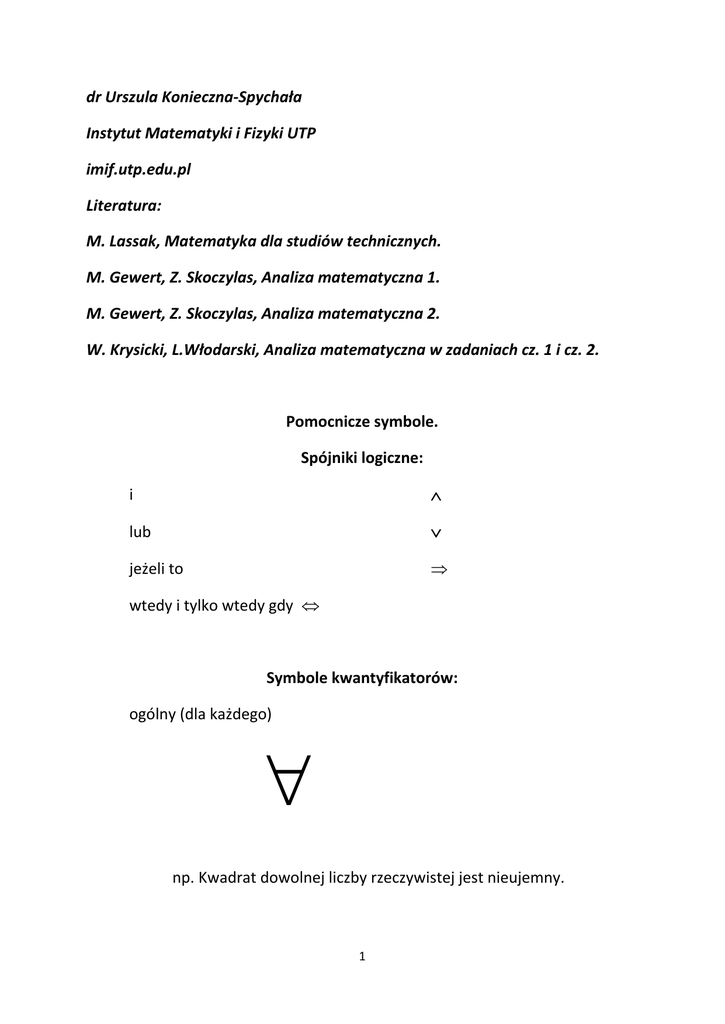 dr Urszula Konieczna-Spychała Instytut Matematyki i Fizyki UTP imif.utp.edu.pl Literatura: M. Lassak, Matematyka dla studiów technicznych. M. Gewert, Z. Skoczylas, Analiza matematyczna 1. M. Gewert, Z. Skoczylas, Analiza matematyczna 2. W. Krysicki, L.Włodarski, Analiza matematyczna w zadaniach cz. 1 i cz. 2. Pomocnicze symbole. Spójniki logiczne: i lub jeżeli to wtedy i tylko wtedy gdy Symbole kwantyfikatorów: ogólny (dla każdego) np. Kwadrat dowolnej liczby rzeczywistej jest nieujemny. 1 x 2 0 xR szczególny ( istnieje ) np. Nierówność x2-9>0 ma rozwiązanie. 2 x 9 0 x R Funkcje jednej zmiennej. Podstawowe definicje. Def.1 Funkcją rzeczywistą określoną na zbiorze XR o wartościach ze zbioru YR nazywamy przyporządkowanie każdemu elementowi xX dokładnie jednego elementu yY. Oznaczenie: f: XY, y=f(x), 2 Def.2. Dziedziną funkcji f:XY nazywamy zbiór X i oznaczamy Df. Zbiór Y nazywamy przeciwdziedziną. Z kolei zbiór Wf. nazywamy zbiorem wartości funkcji f i oznaczamy Def.3. Wykresem funkcji f, f: XY nazywamy zbiór . Wybrane własności funkcji Def.4. Funkcja f: XR jest okresowa jeżeli istnieje taka wartość T0, że (x+T)X oraz f(x)=f(x+T). Inaczej x T X f ( x T ) f ( x) T 0 xX Def.5. Funkcja f: XR jest parzysta jeżeli x X f ( x) f ( x) . x X Wykres funkcji parzystej jest symetryczny względem osi Oy. Funkcja f: XR jest nieparzysta jeżeli 3 x X f ( x) f ( x) . xX Wykres funkcji nieparzystej jest symetryczny względem punktu (0,0). Def.6. Funkcja f jest rosnąca na zbiorze ADf , jeżeli x x1 , x2 A 1 x2 f ( x1 ) f ( x2 ) . Def.7 Funkcja f jest malejąca na zbiorze ADf , jeżeli x x1 , x2 A 1 x2 f ( x1 ) f ( x2 ) . Def.8. Niech X, Y, Z, W będą podzbiorami zbioru R przy czym YZ oraz niech f: XY, g: ZW. Złożeniem funkcji g i f nazywamy funkcję g f: XW określoną wzorem: . Def.9. Funkcja f jest różnowartościowa na zbiorze ADf jeżeli x x1 , x2 A 1 x2 f ( x1 ) f ( x2 ) 4 . Uwaga: Jeżeli funkcja jest rosnąca lub malejąca na zbiorze A to jest na nim różnowartościowa. Def.10. Niech funkcja f: XY będzie różnowartościowa na swojej dziedzinie . Funkcję odwrotną do f nazywamy funkcję f-1:YX określoną przez warunek: Wykres funkcji odwrotnej x=f-1(y) otrzymujemy z wykresu funkcji y=f(x) odwzorowując go symetrycznie względem prostej y=x. Funkcja odwrotna do funkcji rosnącej także jest rosnąca. Funkcja odwrotna do funkcji malejącej także jest malejąca. Def.11. Podstawowymi funkcjami elementarnymi nazywamy funkcje: stałe, potęgowe, wykładnicze, logarytmiczne, trygonometryczne i cyklometryczne. Funkcje, które można otrzymać z podstawowych funkcji elementarnych za pomocą skończonej liczby działań arytmetycznych oraz operacji złożenia funkcji nazywamy funkcjami elementarnymi. Przegląd funkcji elementarnych. Funkcja stała wykresem jest prosta równoległa do osi Ox 5 Funkcja liniowa a-współczynnik kierunkowy a>0 funkcja rosnąca a<0 funkcja malejąca Funkcja kwadratowa Wyróżnik: brak miejsc zerowych Postać iloczynowa: Postać kanoniczna: , Wykresem jest parabola, -to wierzchołek paraboli Wielomian W(x) 6 n- stopień wielomianu, miejsca zerowe W(x)=0 Równanie algebraiczne: W(x)=0 tzn. Tw.( Bézouta). Liczba a jest pierwiastkiem równania jeżeli wielomian W(x) jest podzielny przez dwumian (x-a). Tw. Jeżeli liczba wymierna (ułamek nieskracalny) jest pierwiastkiem równania algebraicznego o współczynnikach całkowitych (przy czym ana00) to p jest dzielnikiem wyrazu wolnego a0, a q jest dzielnikiem współczynnika an. Wniosek: Pierwiastków całkowitych równania algebraicznego o współczynnikach całkowitych wystarczy szukać wśród dzielników wyrazu wolnego a0. 7 Schemat Hornera: anxn+an-1xn-1+...+a1x+a0= (x-x0)( bn-1 xn-1+bn-2xn-2+...+b1x+b0) gdzie współczynniki bi wyznaczamy w tabeli: x0 an an-1 an-2 bn-1=an bn-2=x0bn-1+an-1 bn-3=x0bn-2+an-2 ... a1 a0 b0=x0∙b1+a1 x0b0+a0=0 Uwaga: Jeśli w ostatniej kolumnie wartość jest różna od 0 to x0 nie jest pierwiastkiem wielomianu Funkcja wymierna , to wielomiany o różnych miejscach zerowych Ułamki proste: I rodzaju II rodzaju , dla trójmianu w mianowniku 8 Funkcja potęgowa. Dziedzina i własności zależą od wykładnika: Funkcja pierwiastkowa Dziedzina zależy od parzystości stopnia n. Jeśli n jest parzyste to Jeśli n jest nieparzyste to 9