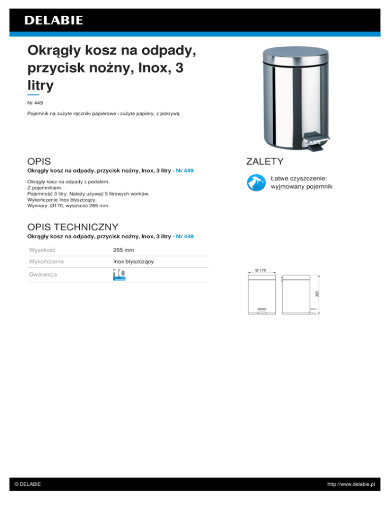 Okrągły kosz na odpady, przycisk nożny, Inox, 3 litry Nr 449 Pojemnik na zużyte ręczniki papierowe i zużyte papiery, z pokrywą OPIS ZALETY Okrągły kosz na odpady, przycisk nożny, Inox, 3 litry - Nr 449 Okrągły kosz na odpady z pedałem. Z pojemnikiem. Pojemność 3 litry. Należy używać 5 litrowych worków. Wykończenie Inox błyszczący. Wymiary: Ø170, wysokość 265 mm. Łatwe czyszczenie: wyjmowany pojemnik OPIS TECHNICZNY Okrągły kosz na odpady, przycisk nożny, Inox, 3 litry - Nr 449 Wysokość 265 mm Wykończenie Inox błyszczący Gwarancja © DELABIE http://www.delabie.pl