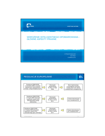 WDROŻENIE INTELIGENTNEGO OPOMIAROWANIA GŁÓWNE ASPEKTY PRAWNE dr Paweł Grzejszczak DLA Piper 23 MARCA 2010 REGULACJE EUROPEJSKIE Dyrektywa 2006/32/WE z 5 kwietnia 2006 w sprawie efektywności wykorzystania energii i usług energetycznych Obowiązek implementacji do dnia 17 maja 2008 Dyrektywa 2009/72/WE z 13 lipca 2009 dotycząca wspólnych zasad rynku wewnętrznego energii elektrycznej Obowiązek implementacji do dnia 3 marca 2011 Dyrektywa 2009/73/WE Z 13 lipca 2009 dotycząca wspólnych zasad rynku wewnętrznego gazu ziemnego Obowiązek implementacji do dnia 3 marca 2011 dr Paweł Grzejszczak Brak implementacji w wymaganym terminie. Trwają prace nad ustawą o efektywności energetycznej. Ocena ekonomiczna do 3 września 2012 Ocena ekonomiczna do 3 września 2012 2 REGULACJE EUROPEJSKIE - Dyrektywa 2006/32/WE Obowiązek państwa członkowskiego zapewnienia odbiorcom końcowym energii elektrycznej, gazu lub CO możliwości nabycia po konkurencyjnych cenach indywidualnych liczników dokładnie oddających rzeczywiste zużycie energii i informujących o rzeczywistym czasie korzystania z energii: zawsze i bezwarunkowo w razie podłączenia nowych liczników w nowych budynkach lub przy wykonywaniu ważniejszych renowacji + w przypadku wymiany liczników, chyba, że jest to technicznie niewykonalne lub nieopłacalne w stosunku do szacowanych potencjalnych oszczędności w perspektywie długoterminowej + w innych sytuacjach, o ile jest to technicznie wykonalne, uzasadnione finansowo i proporcjonalne do potencjalnych oszczędności energii Î Brak konieczności nałożenia obowiązku instalacji inteligentnego opomiarowania, nie wyklucza możliwości nałożenia takiego obowiązku w ustawie, np. na OSD. Î Nie można interpretować Dyrektywy 2006/32/WE w sposób zakładający wprowadzenie inteligentnego opomiarowania wyłącznie w drodze zakupu liczników przez odbiorców końcowych. Î Obowiązek państwa członkowskiego zapewnienia, aby wystawiane rachunki opierały się na rzeczywistym zużyciu energii, aby były sformułowane w sposób jasny i zrozumiały, oraz aby były wystawiane dostatecznie często dla umożliwienia odbiorcy regulowania zużycia energii. dr Paweł Grzejszczak 3 REGULACJE EUROPEJSKIE - Dyrektywa 2009/72/WE Î Warunkowy obowiązek wdrożenia przez państwa członkowskie inteligentnych systemów pomiarowych, które pozwolą na aktywne uczestnictwo konsumentów w rynku dostaw energii elektrycznej. Î Wdrożenie można uzależnić od: ekonomicznej oceny wszystkich długoterminowych kosztów i korzyści dla rynku lub indywidualnego konsumenta lub oceny, która forma inteligentnego pomiaru jest uzasadniona z ekonomicznego punktu widzenia i najbardziej opłacalna oraz w jakim czasie ich dystrybucja jest wykonalna Î Ocena ma zostać przeprowadzona do 3 września 2012. Î Obowiązek przygotowania harmonogramu wdrożenia z terminem docelowym nie przekraczającym 10 lat (niezależnie od przeprowadzonej oceny). Î W przypadku pozytywnej oceny - do 2020 r. w inteligentne systemy pomiarowe ma być wyposażonych co najmniej 80% konsumentów. Î W trakcie wdrożenia trzeba zapewnić interoperacyjność systemów na danym terytorium oraz uwzględnić stosowanie odpowiednich standardów i najlepszych praktyk, a także znaczenie rozwoju rynku wewnętrznego energii elektrycznej. dr Paweł Grzejszczak 4 REGULACJE EUROPEJSKIE - Dyrektywa 2009/73/WE Warunkowy obowiązek wdrożenia inteligentnych systemów pomiarowych, które pozwolą na aktywne uczestnictwo konsumentów w rynku dostaw gazu. Wdrożenia można uzależnić od: ekonomicznej oceny wszystkich długoterminowych kosztów i korzyści dla rynku lub indywidualnego konsumenta lub oceny, która forma inteligentnego pomiaru jest uzasadniona z ekonomicznego punktu widzenia i najbardziej opłacalna oraz w jakim czasie ich dystrybucja jest wykonalna Î Ocena ma być przeprowadzona do 3 września 2012. Î Obowiązek przygotowania harmonogramu wdrożenia, ale bez konieczności uwzględnienia określonego limitu czasowego. Î Brak obowiązku w zakresie wyposażenia w inteligentne systemy pomiarowe określonej listy odbiorców w ściśle określonym terminie. Î W trakcie wdrożenia trzeba zapewnić interoperacyjność systemów na danym terytorium oraz uwzględnić stosowanie odpowiednich standardów i najlepszych praktyk, oraz znaczenie rozwoju rynku wewnętrznego gazu ziemnego. dr Paweł Grzejszczak 5 POLITYKA ENERGETYCZNA POLSKI DO 2030 ROKU Î "Polityka" nie przesądza sposobu wdrożenia inteligentnego systemu pomiarowego. Î W ramach działania 1.9. przewiduje się stopniowe wprowadzenie obowiązku stosowania liczników elektronicznych umożliwiających przekazywanie sygnałów cenowych odbiorcom energii - od 2011r. Î "Polityka" nie przesądza, czy obowiązek ten ma dotyczyć zarówno rynku energii elektrycznej, ciepła, jak i gazu ziemnego, czy tylko niektórych z tych rynków. Î W ramach działania 5.2. przewiduje się wprawdzie rozpowszechnienie stosowania elektronicznych liczników tylko dla energii elektrycznej, ale nie oznacza to, że wdrożenie nie będzie dotyczyło liczników gazu i ciepła. Î Działanie 5.2. wskazuje na konieczność wprowadzenia do 2012 roku ogólnopolskich standardów dotyczących cech technicznych, instalowania i odczytu elektronicznych liczników energii elektrycznej. Î Do 2011 roku przewiduje się wprowadzenie zasady, że operator sieci jest właścicielem wszystkich liczników dla wszystkich odbiorców. dr Paweł Grzejszczak 6 Î OBOWIĄZUJĄCE W POLSCE PRZEPISY NIE PRZEWIDUJĄ OBECNIE OBOWIĄZKU INSTALACJI INTELIGENTNYCH URZĄDZEŃ POMIAROWYCH W ŻADNYM Z PODSEKTORÓW. Î OBOWIĄZUJĄCE PRZEPISY NIE DEFINIUJĄ "INTELIGENTNEGO URZĄDZENIA POMIAROWEGO", JAK RÓWNIEŻ NIE OKREŚLAJĄ JEGO FUNKCJONALNOŚCI, CZY TEŻ PARAMETRÓW TECHNICZNYCH. Î DOTYCHCZAS NIE PRZESĄDZONO W JAKI SPOSÓB MA NASTĄPIĆ IMPLEMENTACJA W PRAWIE POLSKIM REGULACJI DOTYCZĄCYCH INTELIGENTNYCH URZĄDZEŃ POMIAROWYCH. Î IDEA JED