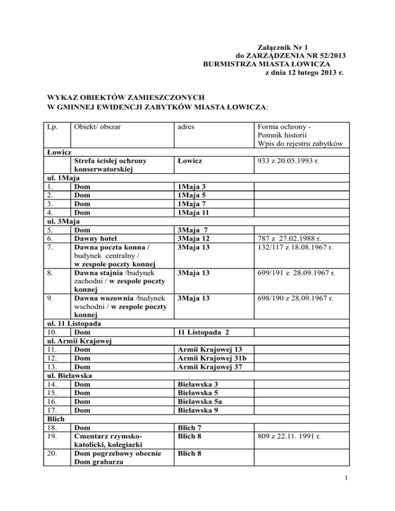 Załącznik Nr 1 do ZARZĄDZENIA NR 52/2013 BURMISTRZA MIASTA ŁOWICZA z dnia 12 lutego 2013 r. WYKAZ OBIEKTÓW ZAMIESZCZONYCH W GMINNEJ EWIDENCJI ZABYTKÓW MIASTA ŁOWICZA: Lp. Obiekt/ obszar adres Forma ochrony Pomnik historii Wpis do rejestru zabytków Łowicz 933 z 20.05.1993 r. Łowicz Strefa ścisłej ochrony konserwatorskiej ul. 1Maja 1. Dom 2. Dom 3. Dom 4. Dom ul. 3Maja 5. Dom 6. Dawny hotel 7. Dawna poczta konna / budynek centralny / w zespole poczty konnej 8. Dawna stajnia /budynek zachodni / w zespole poczty konnej 9. Dawna wozownia /budynek wschodni / w zespole poczty konnej ul. 11 Listopada 10. Dom ul. Armii Krajowej 11. Dom 12. Dom 13. Dom ul. Bielawska 14. Dom 15. Dom 16. Dom 17. Dom Blich 18. Dom 19. Cmentarz rzymskokatolicki, kolegiacki 20. Dom pogrzebowy obecnie Dom grabarza 1Maja 3 1Maja 5 1Maja 7 1Maja 11 3Maja 7 3Maja 12 3Maja 13 787 z 27.02.1988 r. 132/117 z 18.08.1967 r. 3Maja 13 699/191 z 28.09.1967 r. 3Maja 13 698/190 z 28.09.1967 r. 11 Listopada 2 Armii Krajowej 13 Armii Krajowej 31b Armii Krajowej 37 Bielawska 3 Bielawska 5 Bielawska 5a Bielawska 9 Blich 7 Blich 8 809 z 22.11. 1991 r. Blich 8 1 21. kaplica grobowa Rodziny Laskowskich 22. Zespół 6-ciu budynków (budynek mieszkalny z warsztatem szkolnym, budynek mieszkalny z wgłębnym portykiem, magazyn zbożowy, chlewnia, obora stajnia) 23. Zespół 6-ciu budynków Szkoły Rolniczej / chlewnia / 24. Zespół 6-ciu budynków Szkoły Rolniczej /budynek mieszkalny z warsztatem szkolnym 25. Zespół 6-ciu budynków Szkoły Rolniczej /budynek mieszkalny z wgłębnym portykiem/ 26. Zespół 6-ciu budynków Szkoły Rolniczej / obora/ 27. Zespół 6-ciu budynków Szkoły Rolniczej/ magazyn zbożowy/ 28. Zespół 6-ciu budynków Szkoły Rolniczej /stajnia/ 29. Budynek szkolny w zespole 6-ciu budynków 30. Dom ul. Boczna 31. Cmentarz ewangelickoaugsburski 32. Kaplica grobowa rodziny Saxów ul. Bolimowska 33. Dom ul. Długa 34. Kościół p. w. św. Ducha i św. Małgorzaty 35. Cmentarz przykościelny Kapliczka na cmentarz przykościelnym 36. Dom 37. Kapliczka Kaliska 38. Kościół p. w. św. Leonarda i Małgorzaty 39. Cmentarz Przykościelny. Blich 8 Blich 10 nr 634 z 29. 08.1983 r. Blich 10 634 z 29. 08.1983 r. Blich 10 634 z 29. 08.1983 r. Blich 10 634 z 29. 08.1983 r. Blich 10 634 z 29. 08.1983 r. Blich 10 634 z 29. 08.1983 r. Blich 10 634 z 29. 08.1983 r. Blich 10 Blich 11 Boczna 9 808 z 20.11.1991 r. Boczna 9 Bolimowska 55 Długa 1 125/110 z 10.08. 1967 r. Długa 1 Długa 1 996 z 24.08.1995 r. Długa 22 Długa 31 Kaliska 2 127/112 z 18.08 1967 r. Kaliska 2 2 św. Leonarda i Małgorzaty 40. Przepompownia wodociągu kolejowego 41. Dworzec PKP 42. Wodociągowa Wieża Ciśnień PKP ul. Listopadowa 43. Cmentarz prawosławny ul. Łęczycka 44. Cmentarz żydowski ul. Łyszkowicka 45. Cmentarz Mariawicki ul. Mickiewicza 46. Dom – obecnie gimnazjum 47. Dom 48. 49. 50. 51. 52. Dom Dom Dom Dom Cmentarz rzymskokatolicki „Emaus” 53. Kaplica cmentarna „Emaus” 54. Kapliczka przy Parku / Zieleńcu 55. Zieleniec ul. Mostowa 56. Park „Ogród Saski” 57. Dom 58. Kapliczka ul. Nadbzurzańska 59. Dworek 60. Młyn ul. Napoleońska 61. Dom ul. Nowy Rynek 62. Dom 63. Dom 64. Dom 65. Dom 66. Dom 67. Dom 68. Dom 69. Dom 70. Dom 71. Dom 72. Dom 73. Dom Kaliska 32 Kaliska Kaliska Listopadowa 6 Łęczycka 96 875 z 20.03.1992 r. Łyszkowicka 98 Mickiewicza 1 Mickiewicza 2 Żabia 10 Mickiewicza 7 Mickiewicza 9 Mickiewicza 11 Mickiewicza 18 Mickiewicza 40 803 z 20.11.1991 r. Mickiewicza 40 571/128 z 19.08.1967 r. Mickiewicza Mickiewicza 474 z 16.09.1978 r. Mostowa 1 Mostowa 7 Mostowa 473 z 16.09.1978 r. Nadbzurzańska 19 Nadbzurzańska 27 Napoleońska 1 Nowy Rynek 1 Nowy Rynek 2 Nowy Rynek 3 Nowy Rynek 4 Nowy Rynek 5,6 Nowy Rynek 7 Nowy Rynek 8 Nowy Rynek 8a Nowy Rynek 9 Nowy Rynek 10 Nowy Rynek 12 Nowy Rynek 13 591/148 z 21. 08.1967 r. 592/149 z 21.08.1967 r. 593/150 z 21. 08.1967 r. 594/151 z 21. 08.1967 r. 633 z 29.09. 1983 r. 595/152 z 21. 08.1967 r. 635 z 29.09. 1983 r. 637 z 29.09. 1983 r. 136/154 z 21. 08.1967 r. 3 74. Dom 75. Dom 76. Dom 77. Dom 78. Dom 79. Dom 80. Dom 81. Dom 82. Dom ul. Pałacowa 83. Park przy Baszcie w zespole pałacu gen. Klickiego - Basztowa Nowy Rynek 17 Nowy Rynek 19 Nowy Rynek 30 Nowy Rynek 31 Nowy Rynek 32 Nowy Rynek 33 Nowy Rynek 34 Nowy Rynek 35 Nowy Rynek 36 596/160 z 22. 08.1967 r. 636 z 29.09. 1983 r. 598/162 z 22. 08.1967 r. ul. Basztowa 2 ul. gen. Stanisława Klickiego 1 471 z 16.09.1978 r. i nr 794 z 09.05.1990 r. 84. Dawny dom dozorcy w zespole pałacu gen. Klickiego 85. Dawna kaplica w zespole pałacu gen. Klickiego 86. Pałac gen. Klickiego 87. Park w zespole pałacu gen. Klickiego - Pałacowa 88. Wieża obronna w zespole pałacu gen. Klickiego Basztowa ul. Pijarska Pałacowa 6 577/133 z 19.08. 1967 r. Pałacowa 6 576/132 z 19.08. 1967 r. Pałacowa 6 Pałacowa 6 ul. Basztowa 2 133/123 z 16.08.1967 r. 471 z 16.09.1978 r. i nr 794 z 09.05.1990 r. 575/124 z 19.08.1967 r. 89. Pijarska 2 130/115 z 18.08. 1967 r. 90. Kościół o.o. Pijarów p. w. Najświętszej Marii Panny i św. Wojciecha Cmentarz przykościelny OO. Pijarów 91. Dom Plac Przyrynek 92. Dom 93. Dom 94. Dom 95. Dom 96. Dom 97. Dom 98. Dom 99. Dom 100. Dom ul. Podrzeczna 101. Dom 102. Dom 103. Dom 104. Dom 105. Dom 599/163 z 22. 08.1967 r. 137/153 z 22. 08.1967 r. 138/156 z 22. 08.1967 r. 139/157 z 22. 08.1967 r. 140/158 z 22. 08.1967 r. Pijarska 2 Pijarska 3 Plac Przyrynek 4 Plac Przyrynek 6 Plac Przyrynek 8a Plac Przyrynek 8 Plac Przyrynek 10 Plac Przyrynek 16 Plac Przyrynek 18 Plac Przyrynek 23 Plac Przyrynek 25 Podrzeczna Podrzeczna Podrzeczna Podrzeczna Podrzeczna 2 3 4 5 9 1006 z 23.09. 1998 r. 573/1010 z 22.03. 1952 r. 4 106. 107. 108. 109. 110. 111. 112. Dom Dom Dom Dom Dom Dawny kościół ewangelicki Dzwonnica przy kościele ewangelickim 113. Dawny Cmentarz Przykościelny 114. Dom 115. Dom 116. Dom 117. Dawny kościół oo. Dominikanów 118. Dawny klasztor oo. Dominikanów 119. Dawny Cmentarz Przykościelny 120. Zesp