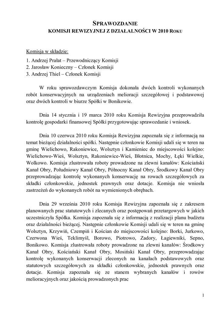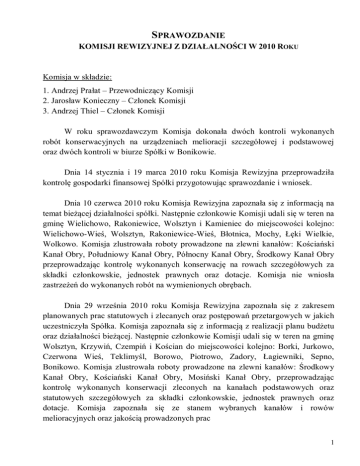 SPRAWOZDANIE KOMISJI REWIZYJNEJ Z DZIAŁALNOŚCI W 2010 ROKU Komisja w składzie: 1. Andrzej Prałat – Przewodniczący Komisji 2. Jarosław Konieczny – Członek Komisji 3. Andrzej Thiel – Członek Komisji W roku sprawozdawczym Komisja dokonała dwóch kontroli wykonanych robót konserwacyjnych na urządzeniach melioracji szczegółowej i podstawowej oraz dwóch kontroli w biurze Spółki w Bonikowie. Dnia 14 stycznia i 19 marca 2010 roku Komisja Rewizyjna przeprowadziła kontrolę gospodarki finansowej Spółki przygotowując sprawozdanie i wniosek. Dnia 10 czerwca 2010 roku Komisja Rewizyjna zapoznała się z informacją na temat bieżącej działalności spółki. Następnie członkowie Komisji udali się w teren na gminę Wielichowo, Rakoniewice, Wolsztyn i Kamieniec do miejscowości kolejno: Wielichowo-Wieś, Wolsztyn, Rakoniewice-Wieś, Błotnica, Mochy, Łęki Wielkie, Wolkowo. Komisja zlustrowała roboty prowadzone na zlewni kanałów: Kościański Kanał Obry, Południowy Kanał Obry, Północny Kanał Obry, Środkowy Kanał Obry przeprowadzając kontrolę wykonanych konserwację na rowach szczegółowych za składki członkowskie, jednostek prawnych oraz dotacje. Komisja nie wniosła zastrzeżeń do wykonanych robót na wymienionych obrębach. Dnia 29 września 2010 roku Komisja Rewizyjna zapoznała się z zakresem planowanych prac statutowych i zlecanych oraz postępowań przetargowych w jakich uczestniczyła Spółka. Komisja zapoznała się z informacją z realizacji planu budżetu oraz działalności bieżącej. Następnie członkowie Komisji udali się w teren na gminę Wolsztyn, Krzywiń, Czempiń i Kościan do miejscowości kolejno: Borki, Jurkowo, Czerwona Wieś, Teklimyśl, Borowo, Piotrowo, Zadory, Łagiewniki, Sepno, Bonikowo. Komisja zlustrowała roboty prowadzone na zlewni kanałów: Środkowy Kanał Obry, Kościański Kanał Obry, Mosiński Kanał Obry, przeprowadzając kontrolę wykonanych konserwacji zleconych na kanałach podstawowych oraz statutowych szczegółowych za składki członkowskie, jednostek prawnych oraz dotacje. Komisja zapoznała się ze stanem wybranych kanałów i rowów melioracyjnych oraz jakością prowadzonych prac 1 W dniu 16 stycznia i 10 marca 2011 roku Komisja Rewizyjna przebywała na terenie biura Spółki w Bonikowie dokonując kontroli gospodarki finansowej Spółki, w trakcie której zapoznała się z następującymi sprawami i dokumentami: - informacją o działalności spółki w 2010 roku, - wykonaniem przychodów i kosztów, - zakresem wykonanych prac statutowych i zlecanych, - informacją o przetargach w jakich uczestniczyła Spółka, - zakresem dotacji samorządowych, - bilansem i rachunkiem zysków i strat za 2010 rok, - fakturami zakupów i sprzedaży, - raportami pracy sprzętu i narzędzi, - ewidencją przejazdów pracowników, - stanem środków na koniec roku, - zobowiązaniami wobec spółki, - inwentaryzacją stanu mienia, - dokumentacją inwestycji w Bonikowie, - umowami najmu i dzierżawy nieruchomości spółki, - rozliczeniem nieruchomości z poboru wody, ścieków i wywozu nieczystości, - dokumentami ze sprzedaży nieruchomości w Świętnie, - wykazem ściągalności składek członkowskich za 2010 rok, Po wysłuchaniu wyjaśnień i odpowiedzi dyrektora na zadane pytania przez członków Komisja nie wniosła uwag. Majątek obrotowy Spółki na koniec 2010 roku wyniósł 626.309,12 zł, w tym: - środki pieniężne – 280.723,05 zł - należności z tytułu wykonanych robót – 244.197,18 zł - należności od rolników indywidualnych – 101.388,89 zł Na przychody ze składek członkowskich w kwocie łącznej 444.987 zł złożyły się wpłaty bieżące za 2010 roku w wymiarze 287.599 zł (od członków indywidualnych i jednostek prawnych) oraz kwota 57.388 zł zaległych. Łącznie ściągalność składek za 2010 rok wyniosła 82%. Komisja Rewizyjna po kontroli stwierdziła, co następuje: 1. Koszty materiałów pędnych zużywanych przez sprzęt mechaniczny nie przekroczyły przyjętych norm eksploatacyjnych. 2. Prowadzone są przez Spółkę postępowania windykacyjne i sądowe w stosunku do dłużników. 3. Spółka podjęła również współpracę z Krajowym Rejestrem Dłużników. 4. Zmieniony został stosunek kosztów pracy ręcznej do kosztów pracy maszynowej. 5. Prowadzona jest aktualizacja ewidencji członków Spółki. 2 Komisja Rewizyjna podjęła następujące wnioski: 1. Poczynione zmiany organizacyjne obniżyły koszty ogólne prowadzonej działalności statutowej, należy działać dalej w tym kierunku. 2. Po zakończeniu aktualizacji ewidencji należy w dalszej kolejności obligować właścicieli gruntów zmeliorowanych do członkowstwa lub konserwacji. 3. Należy rozważyć możliwość zakupu sprzętu kosiarki ciągnikowej lub odmularki. 4. Największych dłużników należy zgłosić do Krajowego Rejestru Dłużników. 5. Wykonanie budżetu Spółki w 2010 roku Komisja ocenia dobrze w odniesieniu do trudnych warunków wykonawczych i finansowych w jakich przyszło Spółce działać. W oparciu o dokonane czynności kontrolne Komisja Rewizyjna składa wniosek o zatwierdzenie przez Walne Zgromadzenie bilansu Spółki oraz sprawozdania finansowego i rzeczowego z wykonania budżetu za 2010 rok przedstawionego przez Zarząd Spółki. Komisja Rewizyjna wnioskuje o udzielenie Zarządowi Spółki absolutorium za działalność w 2010 roku. Podpisali członkowie Komisji Rewizyjnej: 3