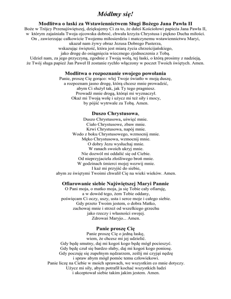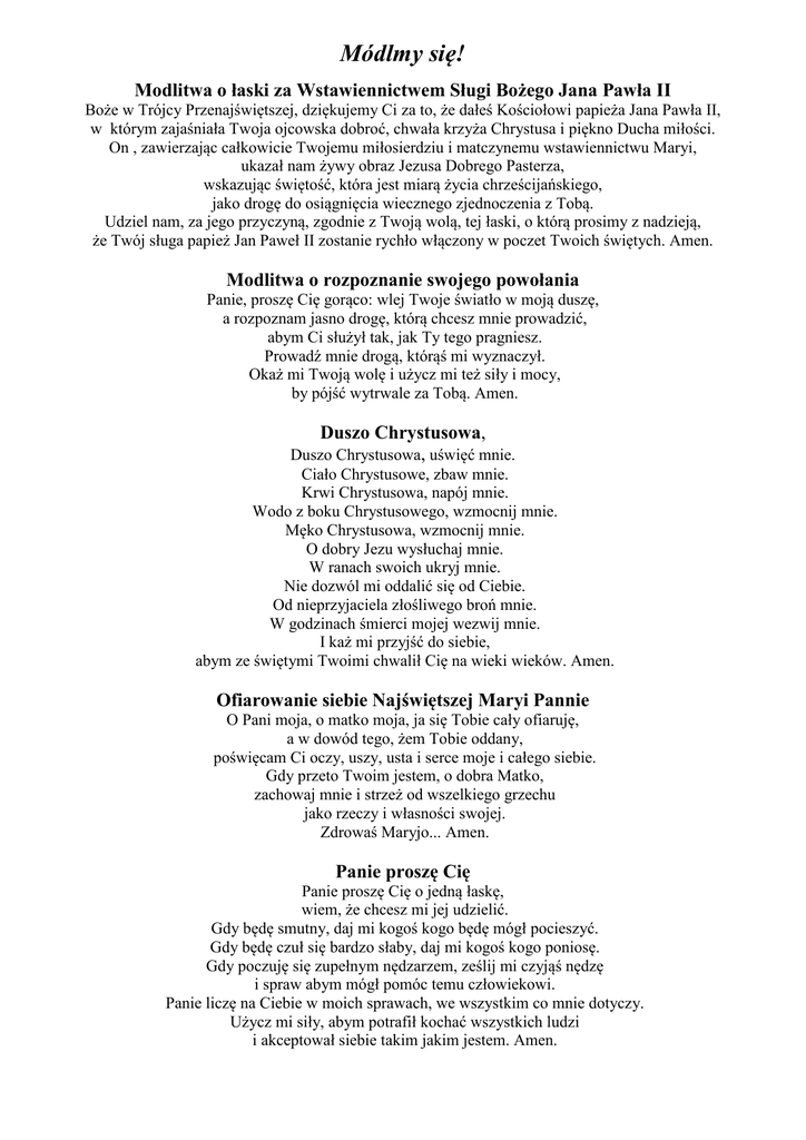 Módlmy się! Modlitwa o łaski za Wstawiennictwem Sługi Bożego Jana Pawła II Boże w Trójcy Przenajświętszej, dziękujemy Ci za to, że dałeś Kościołowi papieża Jana Pawła II, w którym zajaśniała Twoja ojcowska dobroć, chwała krzyża Chrystusa i piękno Ducha miłości. On , zawierzając całkowicie Twojemu miłosierdziu i matczynemu wstawiennictwu Maryi, ukazał nam żywy obraz Jezusa Dobrego Pasterza, wskazując świętość, która jest miarą życia chrześcijańskiego, jako drogę do osiągnięcia wiecznego zjednoczenia z Tobą. Udziel nam, za jego przyczyną, zgodnie z Twoją wolą, tej łaski, o którą prosimy z nadzieją, że Twój sługa papież Jan Paweł II zostanie rychło włączony w poczet Twoich świętych. Amen. Modlitwa o rozpoznanie swojego powołania Panie, proszę Cię gorąco: wlej Twoje światło w moją duszę, a rozpoznam jasno drogę, którą chcesz mnie prowadzić, abym Ci służył tak, jak Ty tego pragniesz. Prowadź mnie drogą, którąś mi wyznaczył. Okaż mi Twoją wolę i użycz mi też siły i mocy, by pójść wytrwale za Tobą. Amen. Duszo Chrystusowa, Duszo Chrystusowa, uświęć mnie. Ciało Chrystusowe, zbaw mnie. Krwi Chrystusowa, napój mnie. Wodo z boku Chrystusowego, wzmocnij mnie. Męko Chrystusowa, wzmocnij mnie. O dobry Jezu wysłuchaj mnie. W ranach swoich ukryj mnie. Nie dozwól mi oddalić się od Ciebie. Od nieprzyjaciela złośliwego broń mnie. W godzinach śmierci mojej wezwij mnie. I każ mi przyjść do siebie, abym ze świętymi Twoimi chwalił Cię na wieki wieków. Amen. Ofiarowanie siebie Najświętszej Maryi Pannie O Pani moja, o matko moja, ja się Tobie cały ofiaruję, a w dowód tego, żem Tobie oddany, poświęcam Ci oczy, uszy, usta i serce moje i całego siebie. Gdy przeto Twoim jestem, o dobra Matko, zachowaj mnie i strzeż od wszelkiego grzechu jako rzeczy i własności swojej. Zdrowaś Maryjo... Amen. Panie proszę Cię Panie proszę Cię o jedną łaskę, wiem, że chcesz mi jej udzielić. Gdy będę smutny, daj mi kogoś kogo będę mógł pocieszyć. Gdy będę czuł się bardzo słaby, daj mi kogoś kogo poniosę. Gdy poczuję się zupełnym nędzarzem, ześlij mi czyjąś nędzę i spraw abym mógł pomóc temu człowiekowi. Panie liczę na Ciebie w moich sprawach, we wszystkim co mnie dotyczy. Użycz mi siły, abym potrafił kochać wszystkich ludzi i akceptował siebie takim jakim jestem. Amen. Modlitwa o misjonarski zapał. . . Panie Jezu, Zbawicielu świata, obudź w każdym z nas prawdziwy misjonarski zapał, by głosić Ciebie tym, którzy Cię jeszcze nie poznali i tym, którzy przestali już wierzyć. Umacniaj w nas odpowiedzialność za misję, pobudzaj w naszych sercach pragnienie modlitwy za misjonarzy i daj zrozumieć, że naszym pierwszym obowiązkiem w szerzeniu wiary jest prawdziwe chrześcijańskie życie. Amen. Modlitwa do Archanioła Michała Święty Michale Archaniele broń nas w walce. Przeciw niegodziwości i zasadzkom złego ducha bądź nam obroną. Niech mu rozkaże Bóg, pokornie prosimy. A Ty Książę wojska niebieskiego, szatana i inne złe duchy, które na zgubę dusz krążą po świecie mocą Bożą strąć do piekła. Amen. Modlitwa na szlaku damasceńskim Panie, z głębi serca dziękuje Ci za to, że udzieliłeś mi łaski wędrowania szlakiem damasceńskim. Powierzam się Tobie: daj mi wolne, proste i pokorne serce, Które będzie umiało przyjąć Twoje światło i Twoją miłość, a przede wszystkim serce prawe i gotowe, by odpowiedzieć na Twoje wezwanie, jakie by ono nie było. Udziel mi dary Twego Ducha Świętego, Abym umiał w godny sposób przeżyć otrzymane powołanie, z należną pokorą, łagodnością i cierpliwością i abym umiał rozpoznać i zrozumieć miłość Chrystusa, która przez wiarę mieszka w moim sercu. Pomóż mi, Panie, niech Twoje Słowo coraz bardziej kształtuje mnie wewnętrznie, niech stanie się dla mnie życiem przeżywanym jako codzienne świadectwo Twojej miłości i Twojej wierności, za przykładem Pawła, który za śmierć poczytywał wszystko poza Chrystusem ukrzyżowanym. Stwórz w moim sercu miejsce na słuchanie w milczeniu, by mocniej Twoja bliskość. Przekształć mnie wewnętrznie na Twoje podobieństwo, jeśli taka jest Twoja wola. Ofiaruję Ci moje najcenniejsze pragnienia: pozwól mi zrozumieć jasno, jakie są Twoje plany wobec mnie. Amen. O rozpoznanie Drogi życiowej Boże przenikasz mnie i znasz. Stworzyłeś mnie dla szczęścia - pomóż mi je znaleźć. Ukaż mi moją drogę życia. Spraw, abym wybrał to, coś Ty dla mnie zamierzył i do czego sposobił jeszcze w łonie matki. Chcę być Ci posłusznym we wszystkim. Pójdę gdzie mnie poślesz. Ufam Tobie, bo wiem, że mnie kochasz i chcesz mego dobra. Poprowadź mnie po ścieżkach Twoich. Panie Jezu Chryste Panie Jezu Chryste, Ty wezwałeś mnie, abym szedł z Tobą do Ojca. Chcę iść z Tobą, chcę żyć z Ciebie i dla Ciebie. Bądź moim światłem, bądź moją siłą Bądź moim mistrzem, którego słucham i za którym idę. Wyryj głęboko w moim sercu słowo Twoje. Niech patrzę na przykład, który Ty mi dałeś. Napełnij mnie Twoim życiem, abym uwielbił Ojca i służył braciom, jak Ty nakazałeś. Wybaw mnie od grzechu. Przełam we mnie to, co się opiera Tobie. Daj mi Ducha Twego i spraw, aby Twe obietnice wypełniły się we mnie. Chcę żyć przez Ciebie, z Tobą i w Tobie - w miłości Ducha Świętego ku chwale Ojca. Amen. O łaskę powołania Panie Jezu znasz moje serce, rozumiesz moje tęsknoty. Wiesz, że jest zdolne kochać. Dziś proszę Cię o łaskę powołania. Jeżeli jestem godny, to ześlij ją dla mnie. Jeżeli mnie widzisz gdzie indziej, to proszę Cię o nią dla innych. Potrzebujesz naszych rąk ,by dobrze czynić, naszych serc, by kochać, naszych ust, by głosić Ewangelię. Potrzebujesz naszych nóg, by docierać do każdego. Wejrzyj, Panie, na moją młodość, nie dopuść, bym się zagubił, daj mi gorliw