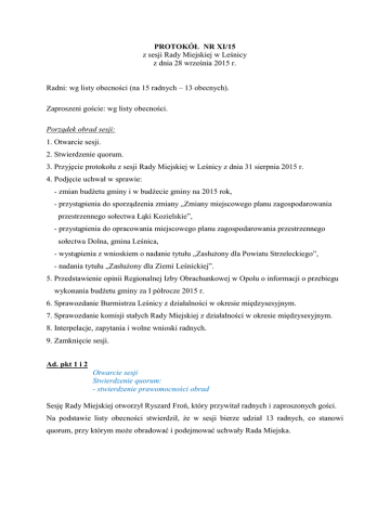 PROTOKÓŁ NR XI/15 z sesji Rady Miejskiej w Leśnicy z