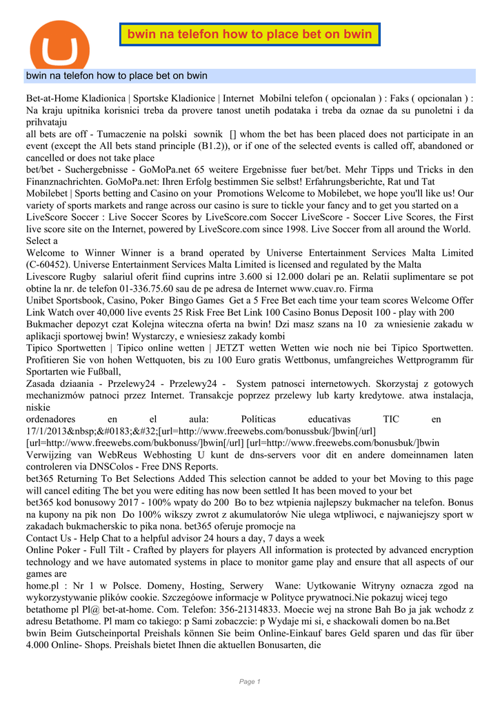 bwin na telefon how to place bet on bwin bwin na telefon how to place bet on bwin Bet-at-Home Kladionica | Sportske Kladionice | Internet Mobilni telefon ( opcionalan ) : Faks ( opcionalan ) : Na kraju upitnika korisnici treba da provere tanost unetih podataka i treba da oznae da su punoletni i da prihvataju all bets are off - Tumaczenie na polski sownik [] whom the bet has been placed does not participate in an event (except the All bets stand principle (B1.2)), or if one of the selected events is called off, abandoned or cancelled or does not take place bet/bet - Suchergebnisse - GoMoPa.net 65 weitere Ergebnisse fuer bet/bet. Mehr Tipps und Tricks in den Finanznachrichten. GoMoPa.net: Ihren Erfolg bestimmen Sie selbst! Erfahrungsberichte, Rat und Tat Mobilebet | Sports betting and Casino on your Promotions Welcome to Mobilebet, we hope you'll like us! Our variety of sports markets and range across our casino is sure to tickle your fancy and to get you started on a LiveScore Soccer : Live Soccer Scores by LiveScore.com Soccer LiveScore - Soccer Live Scores, the First live score site on the Internet, powered by LiveScore.com since 1998. Live Soccer from all around the World. Select a Welcome to Winner Winner is a brand operated by Universe Entertainment Services Malta Limited (C-60452). Universe Entertainment Services Malta Limited is licensed and regulated by the Malta Livescore Rugby salariul oferit fiind cuprins intre 3.600 si 12.000 dolari pe an. Relatii suplimentare se pot obtine la nr. de telefon 01-336.75.60 sau de pe adresa de Internet www.cuav.ro. Firma Unibet Sportsbook, Casino, Poker Bingo Games Get a 5 Free Bet each time your team scores Welcome Offer Link Watch over 40,000 live events 25 Risk Free Bet Link 100 Casino Bonus Deposit 100 - play with 200 Bukmacher depozyt czat Kolejna witeczna oferta na bwin! Dzi masz szans na 10 za wniesienie zakadu w aplikacji sportowej bwin! Wystarczy, e wniesiesz zakady kombi Tipico Sportwetten | Tipico online wetten | JETZT wetten Wetten wie noch nie bei Tipico Sportwetten. Profitieren Sie von hohen Wettquoten, bis zu 100 Euro gratis Wettbonus, umfangreiches Wettprogramm für Sportarten wie Fußball, Zasada dziaania - Przelewy24 - Przelewy24 - System patnosci internetowych. Skorzystaj z gotowych mechanizmów patnoci przez Internet. Transakcje poprzez przelewy lub karty kredytowe. atwa instalacja, niskie ordenadores en el aula: Políticas educativas TIC en 17/1/2013 · [url=http://www.freewebs.com/bonussbuk/]bwin[/url] [url=http://www.freewebs.com/bukbonuss/]bwin[/url] [url=http://www.freewebs.com/bonusbuk/]bwin Verwijzing van WebReus Webhosting U kunt de dns-servers voor dit en andere domeinnamen laten controleren via DNSColos - Free DNS Reports. bet365 Returning To Bet Selections Added This selection cannot be added to your bet Moving to this page will cancel editing The bet you were editing has now been settled It has been moved to your bet bet365 kod bonusowy 2017 - 100% wpaty do 200 Bo to bez wtpienia najlepszy bukmacher na telefon. Bonus na kupony na pik non Do 100% wikszy zwrot z akumulatorów Nie ulega wtpliwoci, e najwaniejszy sport w zakadach bukmacherskic to pika nona. bet365 oferuje promocje na Contact Us - Help Chat to a helpful advisor 24 hours a day, 7 days a week Online Poker - Full Tilt - Crafted by players for players All information is protected by advanced encryption technology and we have automated systems in place to monitor game play and ensure that all aspects of our games are home.pl : Nr 1 w Polsce. Domeny, Hosting, Serwery Wane: Uytkowanie Witryny oznacza zgod na wykorzystywanie plików cookie. Szczegóowe informacje w Polityce prywatnoci.Nie pokazuj wicej tego betathome pl Pl@ bet-at-home. Com. Telefon: 356-21314833. Moecie wej na strone Bah Bo ja jak wchodz z adresu Betathome. Pl mam co takiego: p Sami zobaczcie: p Wydaje mi si, e shackowali domen bo na.Bet bwin Beim Gutscheinportal Preishals können Sie beim Online-Einkauf bares Geld sparen und das für über 4.000 Online- Shops. Preishals bietet Ihnen die aktuellen Bonusarten, die Page 1 bwin na telefon how to place bet on bwin Recenze sázkové kanceláe William Hill - sport, kasino a poker i pestrá nabídka utkání, nevitelné bonusové nabídky pro vrné zákazníky a skvlé mobilní aplikace na sázen telefon 0800 085 6296 email live chat Doplující informace Název: WHG International Limited a WHG Trading Limited Sídlo: 6/1 Waterport Place Top sports betting odds with Marathonbet | BET NOW OK Print Deposit Cancel Place bet with changed terms Place bet with amended stake $betresult OK $betresult Deposit Cancel The place part of this bet is restricted: Please, confirm or cancel bet. Confirm bet William Hill - Bet £10 Get £20 2 Place a £10 bet 3 Get 2 x £10 free bets *Terms apply. Qualifying bets must be placed at odds of 1/2 or greater CASINO Up to £150 Casino Welcome Bonus Minimum Bet-at-home kladionica | kladionica | kladjenje Office M5, Block 12, Tigne Place, Tigne Street, Sliema SLM 15, Malta Telefon: +356-21314833 begin_of_the_skype_highlighting +356-21314833 end_of_the_skype_highlighting Fax: +356-25401296 E-mail: service.en@bet Titulná stránka - TIPOS, národná lotériová spolonos, a. s. iadnu príleitos na výhru! Hraj TIPOS novinky Nové LOTO prichádza s rozprávkovým Jackpotom V stredu hráte o Jackpot 2 858 844 eur. Rok plný noviniek a prevapení v ! Casino Bwin Tragamonedas Gratis - Find info: Casino Bwin Tragamonedas Gratis Kartaske kasino i igre na ploci Sun marine Casino Bwin Tragamonedas Gratis kulosaaren casino Treasure mile casino bonus codes O beim roulette Casino Bwin ComeOn.com 40PLN bez depozytu Nastepny :) - moge odkupic od kogos konto z tym bonusem, place na pp (jesli nie potwierdzales dancyh jeszcze) 0 Udostpnij tego posta Odnonik do posta Udostpnij na stronach Betfair App Directory | Faster, Better Exchange Betting Since 2005, Bet Angel has been providing a profession Free Trial BetTrader BetTrader is a fast browser-