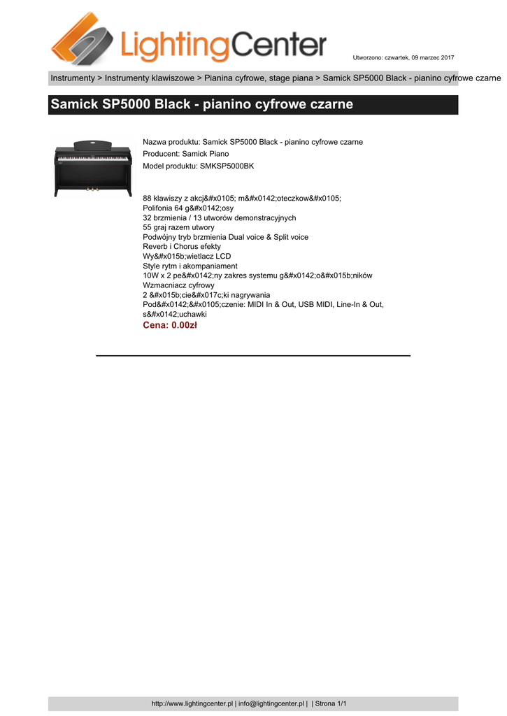 Utworzono: czwartek, 09 marzec 2017 Instrumenty > Instrumenty klawiszowe > Pianina cyfrowe, stage piana > Samick SP5000 Black - pianino cyfrowe czarne Samick SP5000 Black - pianino cyfrowe czarne Nazwa produktu: Samick SP5000 Black - pianino cyfrowe czarne Producent: Samick Piano Model produktu: SMKSP5000BK 88 klawiszy z akcją młoteczkową Polifonia 64 głosy 32 brzmienia / 13 utworów demonstracyjnych 55 graj razem utwory Podwójny tryb brzmienia Dual voice & Split voice Reverb i Chorus efekty Wyświetlacz LCD Style rytm i akompaniament 10W x 2 pełny zakres systemu głośników Wzmacniacz cyfrowy 2 ścieżki nagrywania Podłączenie: MIDI In & Out, USB MIDI, Line-In & Out, słuchawki Cena: 0.00zł http://www.lightingcenter.pl | [email protected] | | Strona 1/1