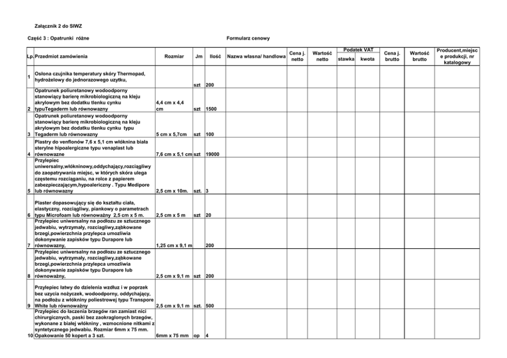 Załącznik 2 do SIWZ Część 3 : Opatrunki różne Formularz