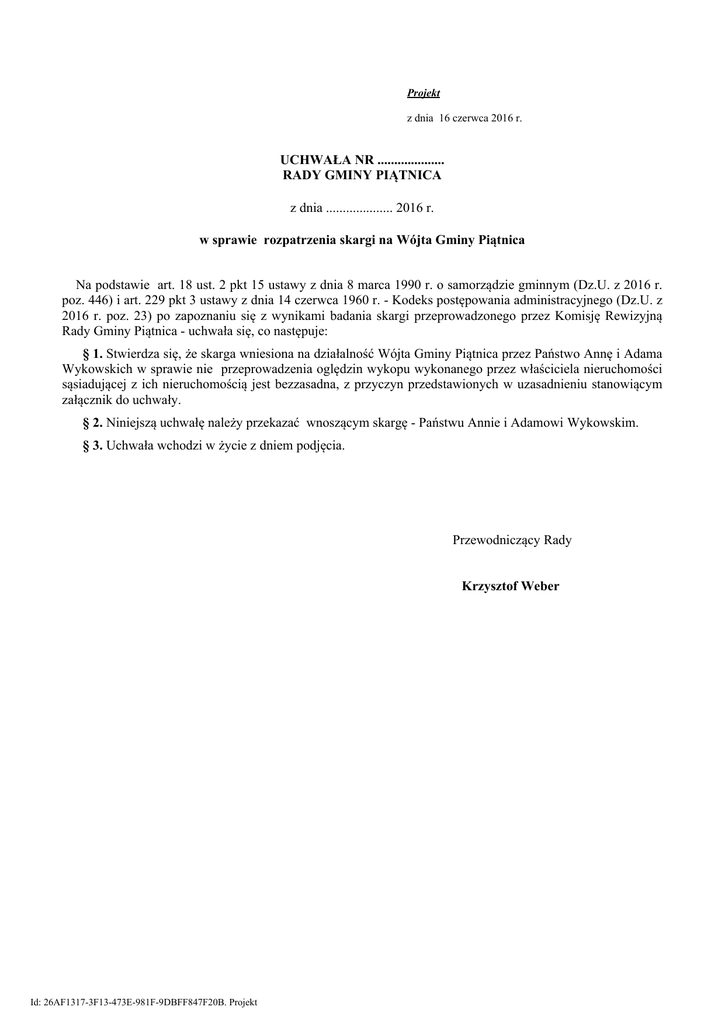 Projekt z dnia 16 czerwca 2016 r. UCHWAŁA NR .................... RADY GMINY PIĄTNICA z dnia .................... 2016 r. w sprawie rozpatrzenia skargi na Wójta Gminy Piątnica Na podstawie art. 18 ust. 2 pkt 15 ustawy z dnia 8 marca 1990 r. o samorządzie gminnym (Dz.U. z 2016 r. poz. 446) i art. 229 pkt 3 ustawy z dnia 14 czerwca 1960 r. - Kodeks postępowania administracyjnego (Dz.U. z 2016 r. poz. 23) po zapoznaniu się z wynikami badania skargi przeprowadzonego przez Komisję Rewizyjną Rady Gminy Piątnica - uchwała się, co następuje: § 1. Stwierdza się, że skarga wniesiona na działalność Wójta Gminy Piątnica przez Państwo Annę i Adama Wykowskich w sprawie nie przeprowadzenia oględzin wykopu wykonanego przez właściciela nieruchomości sąsiadującej z ich nieruchomością jest bezzasadna, z przyczyn przedstawionych w uzasadnieniu stanowiącym załącznik do uchwały. § 2. Niniejszą uchwałę należy przekazać wnoszącym skargę - Państwu Annie i Adamowi Wykowskim. § 3. Uchwała wchodzi w życie z dniem podjęcia. Przewodniczący Rady Krzysztof Weber Id: 26AF1317-3F13-473E-981F-9DBFF847F20B. Projekt Załącznik do Uchwały Nr .................... Rady Gminy Piątnica z dnia 10 czerwca 2016 r. W dniu 31 maja 2016 r. do Rady Gminy Piątnica wpłynęła skarga z dnia 31 maja 2016 r. Państwo Anny i Adama Wykowskich na działalność Wójta Gminy Piątnica w sprawie nie przeprowadzenia oględzin wykopu wykonanego przez właściciela nieruchomości sąsiadującej z ich nieruchomością. Przewodniczący Rady Gminy Piątnica pismem RG.0004.13.2016 z dnia 2 czerwca 2016 r. przekazał do zbadania skargę Komisji Rewizyjnej Rady Gminy Piątnica. Następnie Przewodniczący Komisji Rewizyjnej pismem RG.0012.6.3.2016 z dnia 2 czerwca 2016 r. zwrócił się do Wójta Gminy Piątnica o ustosunkowanie się na piśmie do zarzutów podnoszonych w skardze z uwzględnieniem przepisów prawnych w zakresie objętym skargą. W dniu 10 czerwca 2016 r. Komisja Rewizyjna w celu przygotowania materiałów do rozpatrzenia przez Radę Gminy Piątnica, zbadała i przeanalizowała skargę Państwa Anny i Adama Wykowskich na działalność Wójta Gminy Piątnica. Komisja Rewizyjna badając skargę: 1/ analizowała zarzuty podnoszone w skardze; 2/ zapoznała się z dokumentami w sprawie; 3/ analizowała wyjaśnienia Wójta złożone na piśmie; 4/ wysłuchała ustnych wyjaśnień: - Wójta Gminy Piątnica, - Zastępcy Wójta Gminy Piątnica, - Pani Joanny Fiedosiuk - podinspektor w Urzędzie Gminy Piątnica, - Pani Anny Wykowskiej - składającej skargę. Komisja Rewizyjna rozpatrując powyższą skargę ustaliła, co następuje. W dniu 29 kwietnia 2016 r. Państwo Anna i Adam Wykowscy poinformowali Wójta o działaniach włascicieli działki sąsiedniej - Państwa A. i Z. F., którzy wykonali wykop na swojej działce działce, by ułatwić przejazd przez działkę sprzętem rolniczym. Zażądali interwencji w tej sprawie. W tym dniu Wójt wydał polecenie pracownikowi Wydziału Gospodarki Przestrzennej i Terenowej podinspektor Pani Joannie Fiedosiuk, by udała się na miejsce interwencji i sprawdziła, czy działania Państwa F. spowodowały zakłócenia spływu wód powierzchniowych, gdyż tylko w tym wypadku Wójt był organem własciwym do rozpatrzenia sprawy na podstawie art. 29 ustawy z dnia 18 lipca 2001 r. Prawo wodne (Dz.U. z 2015 r. poz. 469 z późn. zm.). Po kilkukrotnych próbach telefonicznego skontaktowania się z Państwem F. (w dniach: 2,10,11 i 13 maja) ustalono, że pracownik Urzędu Gminy uda się na wizję w dniu 16 maja o godz. 14.30. W dniu 16 maja 2016 r. Państwo Wykowscy stawili się do Urzędu Gminy i zostali poinformowani o tym spotkaniu. Jednak ze względu na konflikt z Państwem F. woleliby, aby wizja w terenie odbyła się na ich działce w innym terminie. Ustalono termin spotkania na 17 maja br. godz. 14.30. Jak wyjaśnił Wójt z powodu licznych obowiązków służbowych w dniu 17 maja, a szczególnie po godz. 14-tej Pani Fiedosiuk, poinformowała telefonicznie Panią Annę Wykowską, że nie będzie mogła być obecna tego dnia i przesunęła oględziny za zgodą Pani Wykowskiej na 19 maja na godz. 14.30. W dniu 18 maja 2016 r. przeprowadzona została przez podinspektor Joannę Fiedosiuk wizja na działce nr 518 będącej własnością Państwa A. i Z. F. w związku z ustną skargą Państwa Anny i Adama Wykowskich (notatka służbowa z dn. 18 maja 2016 r.). W oględzinach tych uczestniczyła Pani A.F. która stwierdziła, że po dokonanych pomiarach geodezyjnych wybrali część ziemi na swojej działce, by ułatwić przejazd przez stodołę sprzętem rolniczym. W oględzinach uczestniczył też Pan Adam Wykowski. W czasie wizji Pani Fiedosiuk nie stwierdziła, by prace prowadzone przez właścicieli Id: 26AF1317-3F13-473E-981F-9DBFF847F20B. Projekt doprowadziły do zakłócenia spływu wód powierzchniowych, o czym poinformowała Panią F. i Pana Wykowskiego. Podczas wizji dochodziło do utarczek słownych pomiędzy sąsiadami. W dniu 19 maja br. do Urzędu Gminy wpłynęło pismo Państwa Anny i Adama Wykowskich w sprawie dokonania kontroli wykopu wykonanego przez Państwo A. i Z. F . Według wnioskodawców wykop ten naruszył ich własność i spowodował zagrożenie dla życia i zdrowia. Podniesiono też zagrożenie stabilności budynku stodoły skarżących. Wójt pismem GPT.6331.3.2016 z dnia 3 czerwca 2016 r. przekazał przedmiotowe pismo według właściwości do Powiatowego Inspektoratu Nadzoru Budowlanego w Łomży. Pan Wójt na posiedzeniu Komisji poinformował, że podczas zgłaszania Przez Państwo Annę i Adama Wykowskich sprawy wykonania wykopu informował, że Państwo A. i Z. F. to krewni ze strony żony, co podnoszą w skardze skarżący. Jednakże fakt ten nie miał wpływu na podejmowane działania. Reausumując Komisja Rewizyjna nie stwierdza nieprawidłowości w postępowaniu Wójta Gminy Piątnica, gdyż był organem własciwym do roz