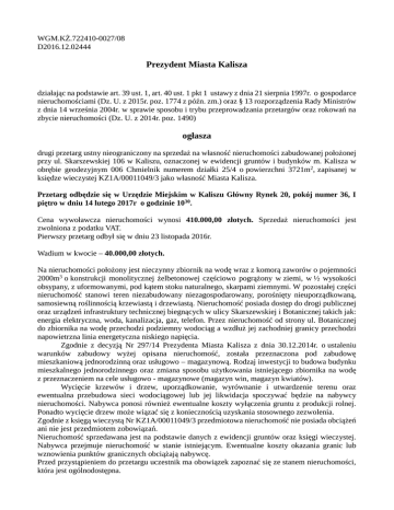 WGM.KŻ.722410-0027/08 D2016.12.02444 Prezydent Miasta Kalisza działając na podstawie art. 39 ust. 1, art. 40 ust. 1 pkt 1 ustawy z dnia 21 sierpnia 1997r. o gospodarce nieruchomościami (Dz. U. z 2015r. poz. 1774 z późn. zm.) oraz § 13 rozporządzenia Rady Ministrów z dnia 14 września 2004r. w sprawie sposobu i trybu przeprowadzania przetargów oraz rokowań na zbycie nieruchomości (Dz. U. z 2014r. poz. 1490) ogłasza drugi przetarg ustny nieograniczony na sprzedaż na własność nieruchomości zabudowanej położonej przy ul. Skarszewskiej 106 w Kaliszu, oznaczonej w ewidencji gruntów i budynków m. Kalisza w obrębie geodezyjnym 006 Chmielnik numerem działki 25/4 o powierzchni 3721m2, zapisanej w księdze wieczystej KZ1A/00011049/3 jako własność Miasta Kalisza. Przetarg odbędzie się w Urzędzie Miejskim w Kaliszu Główny Rynek 20, pokój numer 36, I piętro w dniu 14 lutego 2017r o godzinie 1030. Cena wywoławcza nieruchomości wynosi 410.000,00 złotych. Sprzedaż nieruchomości jest zwolniona z podatku VAT. Pierwszy przetarg odbył się w dniu 23 listopada 2016r. Wadium w kwocie – 40.000,00 złotych. Na nieruchomości położony jest nieczynny zbiornik na wodę wraz z komorą zaworów o pojemności 2000m3 o konstrukcji monolitycznej żelbetonowej częściowo pogrążony w ziemi, w ½ wysokości obsypany, z uformowanymi, pod kątem stoku naturalnego, skarpami ziemnymi. W pozostałej części nieruchomość stanowi teren niezabudowany niezagospodarowany, porośnięty nieuporządkowaną, samosiewną roślinnością krzewiastą i drzewiastą. Nieruchomość posiada dostęp do drogi publicznej oraz urządzeń infrastruktury technicznej biegnących w ulicy Skarszewskiej i Botanicznej takich jak: energia elektryczna, woda, kanalizacja, gaz, telefon. Przez nieruchomość od strony ul. Botanicznej do zbiornika na wodę przechodzi podziemny wodociąg a wzdłuż jej zachodniej granicy przechodzi napowietrzna linia energetyczna niskiego napięcia. Zgodnie z decyzją Nr 297/14 Prezydenta Miasta Kalisza z dnia 30.12.2014r. o ustaleniu warunków zabudowy wyżej opisana nieruchomość, została przeznaczona pod zabudowę mieszkaniową jednorodzinną oraz usługowo – magazynową. Rodzaj inwestycji to budowa budynku mieszkalnego jednorodzinnego oraz zmiana sposobu użytkowania istniejącego zbiornika na wodę z przeznaczeniem na cele usługowo - magazynowe (magazyn win, magazyn kwiatów). Wycięcie krzewów i drzew, uporządkowanie, wyrównanie i utwardzenie terenu oraz ewentualna przebudowa sieci wodociągowej lub jej likwidacja spoczywać będzie na nabywcy nieruchomości. Nabywca ponosi również ewentualne koszty wyłączenia gruntu z produkcji rolnej. Ponadto wycięcie drzew może wiązać się z koniecznością uzyskania stosownego zezwolenia. Zgodnie z księgą wieczystą Nr KZ1A/00011049/3 przedmiotowa nieruchomość nie posiada obciążeń ani nie jest przedmiotem zobowiązań. Nieruchomość sprzedawana jest na podstawie danych z ewidencji gruntów oraz księgi wieczystej. Nabywca przejmuje nieruchomość w stanie istniejącym. Ewentualne koszty okazania granic lub wznowienia punktów granicznych obciążają nabywcę. Przed przystąpieniem do przetargu uczestnik ma obowiązek zapoznać się ze stanem nieruchomości, która jest ogólnodostępna. Przed przystąpieniem do przetargu konieczne jest okazanie komisji przetargowej dowodu tożsamości przez uczestnika przetargu, a w przypadku: podmiotów innych niż osoby fizyczne konieczne jest dodatkowo przedłożenie aktualnego dokumentu (oryginał), z którego wynika, upoważnienie do reprezentowania tego podmiotu, a gdy działa pełnomocnik, konieczne jest przedłożenie pełnomocnictwa w formie aktu notarialnego; małżonków do dokonywania czynności przetargowych konieczna jest obecność obojga małżonków lub jednego z nich ze stosownym pełnomocnictwem (oryginał) drugiego małżonka, zawierającym zgodę na uczestnictwo w przetargu w celu odpłatnego nabycia nieruchomości; pełnomocników osób fizycznych poza przypadkami wyżej wskazanymi, konieczne jest przedłożenie pełnomocnictwa w formie aktu notarialnego. Osoba będąca cudzoziemcem w rozumieniu ustawy z dnia 24 marca 1920 roku o nabywaniu nieruchomości przez cudzoziemców (Dz. U. z 2014r. poz. 1380) zobowiązana jest w dniu zawarcia umowy przeniesienia własności nieruchomości będącej przedmiotem przetargu przedłożyć wydane na zasadach i w sytuacjach przewidzianych ustawą zezwolenie właściwego ministra na nabycie tej nieruchomości, chyba, że zajdą przewidziane powołaną ustawą przesłanki wyłączające wymóg uzyskania takiego zezwolenia. Warunkiem przystąpienia do przetargu jest uiszczenie wadium w pieniądzu w wyżej określonej wysokości nie później niż do dnia 8 lutego 2017r. Tytuł wpłaty wadium winien jednoznacznie wskazywać uczestnika przetargu oraz nieruchomość, której wpłata dotyczy. Za termin wniesienia wadium uważa się dzień wpływu wadium na wskazany rachunek bankowy. Wadium należy wnieść na rachunek bankowy Urzędu Miejskiego w Kaliszu Główny Rynek 20 nr: mBank SA Nr 72 1140 1993 0000 5502 3500 1006. Osobom, które nie wygrały przetargu wadium zostanie zwrócone niezwłocznie, nie później niż przed upływem 3 dni od dnia zakończenia lub odwołania przetargu, natomiast wadium wpłacone przez uczestnika, który przetarg wygrał zalicza się na poczet ceny nabycia nieruchomości. O wysokości postąpienia decydują uczestnicy przetargu, z tym że postąpienie nie może wynosić mniej niż 1 % ceny wywoławczej, z zaokrągleniem w górę do pełnych dziesiątek złotych. Uczestnik, który przetarg wygrał związany jest wylicytowaną ceną do upływu terminu zawarcia umowy notarialnej. Cena ta płatna jest w taki sposób, aby środki finansowe znajdowały się na koncie Urzędu Miejskiego w Kaliszu nie później niż dwa dni przed dniem zawarcia umowy notarialnej przenoszącej własność. Jeżeli osoba u