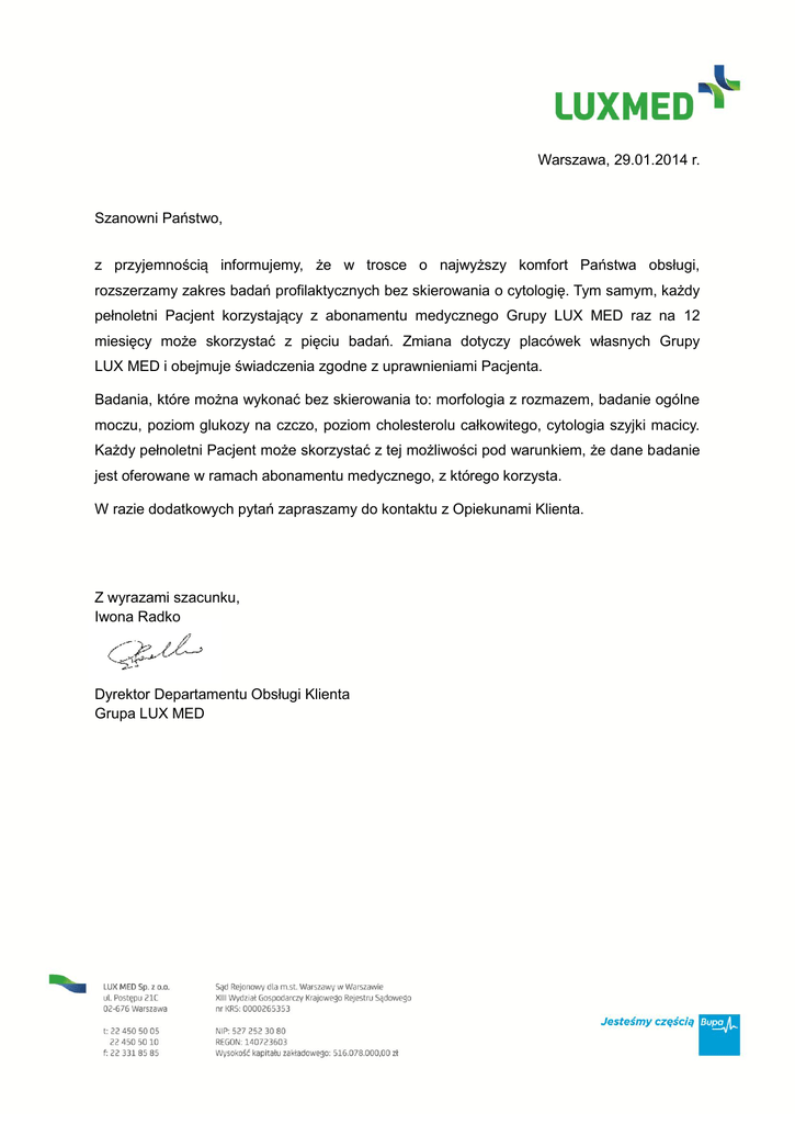 Warszawa, 29.01.2014 r. Szanowni Państwo, z przyjemnością informujemy, że w trosce o najwyższy komfort Państwa obsługi, rozszerzamy zakres badań profilaktycznych bez skierowania o cytologię. Tym samym, każdy pełnoletni Pacjent korzystający z abonamentu medycznego Grupy LUX MED raz na 12 miesięcy może skorzystać z pięciu badań. Zmiana dotyczy placówek własnych Grupy LUX MED i obejmuje świadczenia zgodne z uprawnieniami Pacjenta. Badania, które można wykonać bez skierowania to: morfologia z rozmazem, badanie ogólne moczu, poziom glukozy na czczo, poziom cholesterolu całkowitego, cytologia szyjki macicy. Każdy pełnoletni Pacjent może skorzystać z tej możliwości pod warunkiem, że dane badanie jest oferowane w ramach abonamentu medycznego, z którego korzysta. W razie dodatkowych pytań zapraszamy do kontaktu z Opiekunami Klienta. Z wyrazami szacunku, Iwona Radko Dyrektor Departamentu Obsługi Klienta Grupa LUX MED