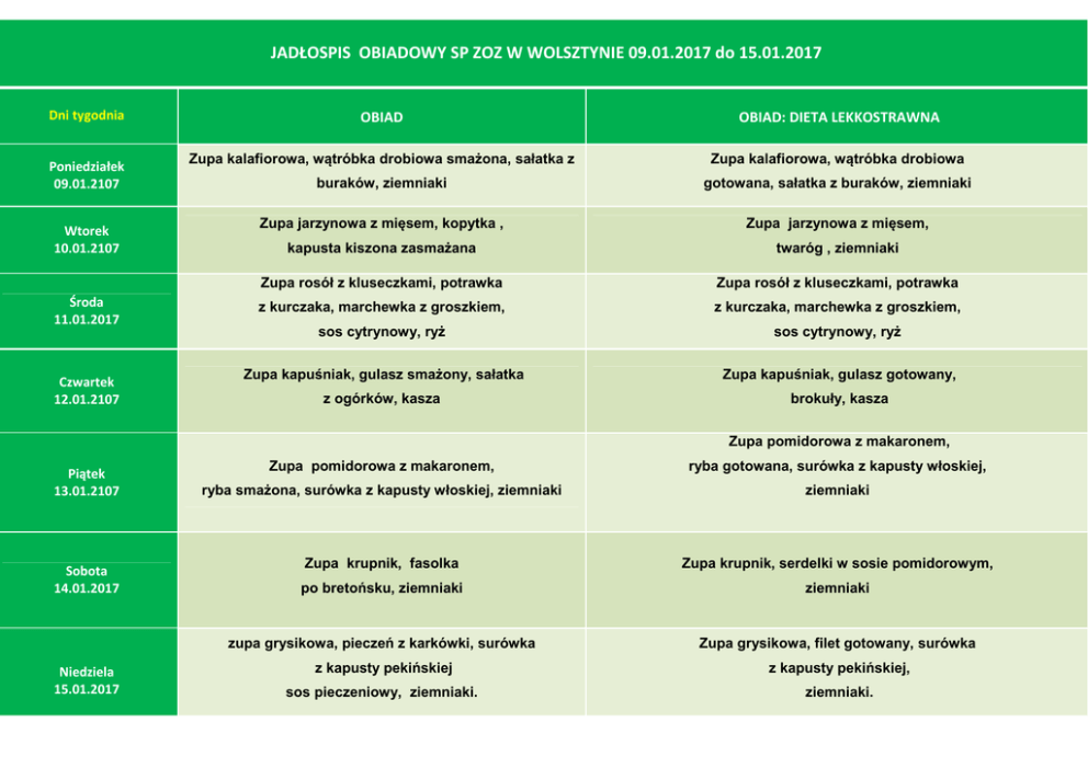 JADŁOSPIS OBIADOWY SP ZOZ W WOLSZTYNIE 09.01.2017 do 15.01.2017 Dni tygodnia Poniedziałek 09.01.2107 Wtorek 10.01.2107 Środa 11.01.2017 Czwartek 12.01.2107 OBIAD OBIAD: DIETA LEKKOSTRAWNA Zupa kalafiorowa, wątróbka drobiowa smażona, sałatka z Zupa kalafiorowa, wątróbka drobiowa buraków, ziemniaki gotowana, sałatka z buraków, ziemniaki Zupa jarzynowa z mięsem, kopytka , Zupa jarzynowa z mięsem, kapusta kiszona zasmażana twaróg , ziemniaki Zupa rosół z kluseczkami, potrawka Zupa rosół z kluseczkami, potrawka z kurczaka, marchewka z groszkiem, z kurczaka, marchewka z groszkiem, sos cytrynowy, ryż sos cytrynowy, ryż Zupa kapuśniak, gulasz smażony, sałatka Zupa kapuśniak, gulasz gotowany, z ogórków, kasza brokuły, kasza Zupa pomidorowa z makaronem, Piątek 13.01.2107 Sobota 14.01.2017 Niedziela 15.01.2017 Zupa pomidorowa z makaronem, ryba gotowana, surówka z kapusty włoskiej, ryba smażona, surówka z kapusty włoskiej, ziemniaki ziemniaki Zupa krupnik, fasolka Zupa krupnik, serdelki w sosie pomidorowym, po bretońsku, ziemniaki ziemniaki zupa grysikowa, pieczeń z karkówki, surówka Zupa grysikowa, filet gotowany, surówka z kapusty pekińskiej z kapusty pekińskiej, sos pieczeniowy, ziemniaki. ziemniaki.
