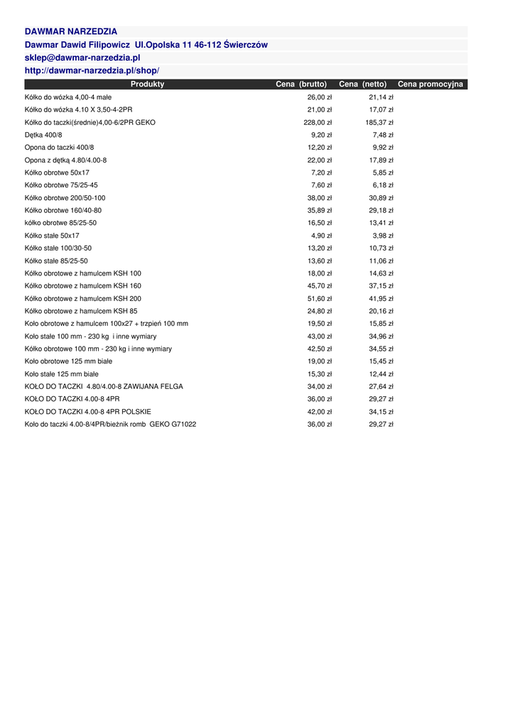 DAWMAR NARZEDZIA Dawmar Dawid Filipowicz Ul.Opolska 11 46-112 Świerczów [email protected] http://dawmar-narzedzia.pl/shop/ Produkty Cena (brutto) Cena (netto) Kółko do wózka 4,00-4 małe 26,00 zł 21,14 zł Kółko do wózka 4.10 X 3,50-4-2PR 21,00 zł 17,07 zł 228,00 zł 185,37 zł 9,20 zł 7,48 zł Opona do taczki 400/8 12,20 zł 9,92 zł Opona z dętką 4.80/4.00-8 22,00 zł 17,89 zł 7,20 zł 5,85 zł Kółko do taczki(średnie)4,00-6/2PR GEKO Dętka 400/8 Kółko obrotwe 50x17 Kółko obrotwe 75/25-45 7,60 zł 6,18 zł Kółko obrotwe 200/50-100 38,00 zł 30,89 zł Kółko obrotwe 160/40-80 35,89 zł 29,18 zł kółko obrotwe 85/25-50 16,50 zł 13,41 zł 4,90 zł 3,98 zł Kółko stałe 100/30-50 13,20 zł 10,73 zł Kółko stałe 85/25-50 13,60 zł 11,06 zł Kółko obrotowe z hamulcem KSH 100 18,00 zł 14,63 zł Kółko obrotowe z hamulcem KSH 160 45,70 zł 37,15 zł Kółko obrotowe z hamulcem KSH 200 51,60 zł 41,95 zł Kółko obrotowe z hamulcem KSH 85 24,80 zł 20,16 zł Koło obrotowe z hamulcem 100x27 + trzpień 100 mm 19,50 zł 15,85 zł Koło stałe 100 mm - 230 kg i inne wymiary 43,00 zł 34,96 zł Kółko obrotowe 100 mm - 230 kg i inne wymiary 42,50 zł 34,55 zł Koło obrotowe 125 mm białe 19,00 zł 15,45 zł Koło stałe 125 mm białe 15,30 zł 12,44 zł KOŁO DO TACZKI 4.80/4.00-8 ZAWIJANA FELGA 34,00 zł 27,64 zł KOŁO DO TACZKI 4.00-8 4PR 36,00 zł 29,27 zł KOŁO DO TACZKI 4.00-8 4PR POLSKIE 42,00 zł 34,15 zł Koło do taczki 4.00-8/4PR/bieżnik romb GEKO G71022 36,00 zł 29,27 zł Kółko stałe 50x17 Cena promocyjna