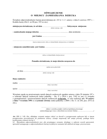 OŚWIADCZENIE O MIEJSCU ZAMIESZKANIA DZIECKA Świadom odpowiedzialności karnej przewidzianej art. 233 § 1 i 2 ustawy z dnia 6 czerwca 1997 r. – Kodeks karny (Dz.U. nr 88 poz. 553 ze zm.) niniejszym oświadczam, że od dnia …………………………….… faktycznym miejscem: (dzień, miesiąc, rok) - zamieszkania mojego dziecka …………………………….............. .data urodzenia ……………….. jest Gmina ……………………………… ………………………………………………………………………………………………….. (nazwa miejscowości, ulica, nr domu/lokalu, kod pocztowy, nr telefonu) - miejscem zameldowania jest Gmina …………………………………………………………. ………………………………………………………………………………………….. (ulica, nr domu/lokalu, kod pocztowy) Ponadto oświadczam, że moje dziecko uczęszcza do ………………………………………………………………………………………………… (pełna nazwa placówki) od dnia ……………………………………………………………………………………….. (dzień, miesiąc rok) Dane rodziców: matka …………………………………………………………………………………….. (imię i nazwisko) ojciec ……………………………………………………………………………………… (imię i nazwisko) Wyrażam zgodę na przetwarzanie moich danych osobowych zgodnie ustawą z dnia 29 sierpnia 197 r. o ochronie danych osobowych (tekst jednolity – Dz. U z 2014 r. poz. 1182 ze zm.) w związku z gromadzeniem i przetwarzaniem danych osobowych wyłącznie w celu realizacji art. 79 ustawy z dnia 7 września 1991 r. o systemie oświaty (tekst jednolity z 2004 r. Dz. U. nr 256, poz. 2572 ze zm.), ………………………………………………………. (data i czytelny podpis rodzica/opiekuna prawnego zamieszkującego wraz z dzieckiem na terenie Gminy…………………………) Art. 233 § 1 Kk. Kto, składając zeznanie mające służyć za dowód w postępowaniu sądowym lub w innym postępowaniu prowadzonym na podstawie ustawy, zeznaje nieprawdę lub zataja prawdę, podlega karze pozbawienia wolności do lat 3. §2. Warunkiem odpowiedzialności jest, aby przyjmujący zeznanie, działając w zakresie swoich uprawnień, uprzedził zaznającego o odpowiedzialności karnej za fałszywe zaznanie lub odebrał od niego przyrzeczenie.