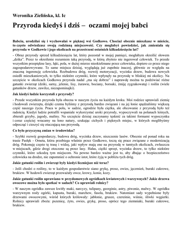 Weronika Zielińska, kl. Ic Przyroda kiedyś i dziś – oczami mojej babci Babciu, urodziłaś się i wychowałaś w pięknej wsi Godkowo. Chociaż obecnie mieszkasz w mieście, to często odwiedzasz swoją rodzinną miejscowość. Czy mogłabyś powiedzieć, jak zmieniała się przyroda w Godkowie i jego okolicach na przestrzeni ostatnich kilkudziesięciu lat? - Obraz przyrody sprzed kilkudziesięciu lat, który pozostał w mojej pamięci, mogłabym określić słowem „dzika”. Przez to określenie rozumiem taką przyrodę, w którą zbytnio nie ingerował człowiek. To przede wszystkim przepiękne lasy, łąki, pola, w dużej mierze nieokiełznane przez człowieka, dopiero co przez niego zagospodarowywane. Te same miejsca dzisiaj, wyglądają już zupełnie inaczej, głównie ze względu na znaczną ingerencję człowieka. Rozbudowa dróg, rozwój motoryzacji, wycinka drzew, budowa nowych osiedli mieszkaniowych, to tylko niektóre czynniki, które wpłynęły na przyrodę w bliskiej mi okolicy. Na szczęście w okolicach Godkowa przyroda nadal „ma się dobrze” i naprawdę można tu podziwiać różne gatunki zwierząt (dziki, sarny, jelenie, lisy, żurawie, bociany, borsuki, żmiję zygzakowatą) i roślin (wiele gatunków drzew, zawilce, niezapominajki). Jak kiedyś ludzie korzystali z przyrody? - Przede wszystkim przyroda była obecna w naszym życiu na każdym kroku. Moi rodzice uprawiali ziemię i hodowali zwierzęta, dzięki czemu byliśmy z przyrodą bardzo związani i na jej łonie spędzaliśmy większą część naszego życia. Praca w polu, w sadzie, ogrodzie była ciężka, ale obcowanie z przyrodą było też radością. Kiedyś ludzie potrafili wspaniale wykorzystać uroki przyrody, wypoczywali na polanach leśnych, zbierali grzyby, jagody, maliny. Na szczęście dzisiaj zaczynamy tęsknić za takimi formami wypoczynku i coraz częściej wracamy na łono natury, szukając cichych i pięknych miejsc, w których moglibyśmy odpocząć i cieszyć się otaczającą nas przyrodą. Co było przyczyną zmian w środowisku? - Szybki rozwój gospodarczy, budowa dróg, wycinka drzew, niszczenie lasów. Obecnie od ponad roku na trasie Pasłęk - Orneta, która przebiega właśnie przez Godkowo, toczą się prace związane z modernizacją dróg. Pokonuję często tę trasę i widzę, jaki wpływ mają one na przyrodę w tamtych okolicach, zwłaszcza w miejscach, gdzie drogi otoczone są przez lasy. Hałas, ciężki sprzęt, wycinka drzew, to tylko niektóre czynniki, które szkodzą tym miejscom. Na pewno bardzo ważne jest to, aby dbając o bezpieczeństwo człowieka na drodze, nie zapomnieć o ochronie istot, które żyją w pobliżu tych dróg. Jakie gatunki roślin i zwierząt były kiedyś liczniejsze niż teraz? - Jeśli chodzi o rośliny, to w każdym gospodarstwie siano grykę, proso, owies, jęczmień, buraki cukrowe, brukiew. W hodowli zwierząt przeważały owce, krowy, konie, kozy. Jakie gatunki roślin uprawiano w przydomowych ogródkach kwiatowych i warzywnych? Jakie drzewa owocowe można było spotkać w sadach? Co uprawiali rolnicy? - W naszym ogródku zawsze kwitły maki, narcyzy, tulipany, georginie, astry, piwonie, malwy. W ogródku warzywnym rosły ogórki, kapusta, buraki, marchew, fasola, brukiew. Natomiast sady wypełnione były drzewami owocowymi, wśród których królowały: jabłonie, grusze, czereśnie, wiśnie, śliwki węgierki. Rolnicy uprawiali zboża: pszenicę, żyto, owies, grykę, proso, oprócz tego ziemniaki, buraki cukrowe, brukiew. Czy według Ciebie, Babciu, dzisiejsza przyroda jest piękniejsza od dawnej? - Chyba bliższa mi jest ta przyroda z dawnych lat, dzika, nieokiełznana przez człowieka, chociaż ja również potrafię czerpać radość z tej przyrody, która dzisiaj mnie otacza. Mam kawałek własnej ziemi, którą uprawiam, mam ogródek kwiatowy i warzywny, chętnie sięgam po nowe gatunki kwiatów, którymi bardzo lubię się otaczać. Dziękuję za rozmowę.