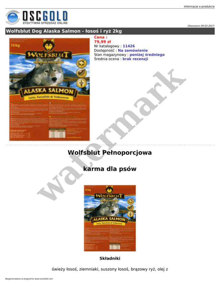 Informacje o produkcie Utworzono 09-03-2017 Wolfsblut Dog Alaska Salmon - łosoś i ryż 2kg Cena : 79,99 zł er m ar k Nr katalogowy : 11426 Dostępność : Na zamówienie Stan magazynowy : poniżej średniego Średnia ocena : brak recenzji at Wolfsblut Pełnoporcjowa w karma dla psów Składniki świeży łosoś, ziemniaki, suszony łosoś, brązowy ryż, olej z Wygenerowano w programie www.oscGold.com łososia, ryż (kiełki), rośliny morskie, żurawina, jaja, ekstrakt z juki (MOS), Mannooligosacharydy (FOS), fruktooligosacharydy, sole mineralne i witaminy Białko 25 % Tłuszcz 15 % Błonnik 2% Popiół 6% Wilgotność 10 % Energia 3.590 kcal/kg Omega 6 4% Omega 3 1,5 % Witamina A 15000 IU Witamina D 1000 IU Witamina E 500 mg/kg Witamina B1 5 .5 mg/kg Witamina B2 10 mg/kg Witamina B3 30 mg/kg Niacyna 2 0 mg/kg Witamina B6 4 mg/kg Witamina B9 0,8 mg/kg Biotyna 0,6 mg/kg Witamina B 12 0,04 mg/kg 400 mg/kg Tauryna 0, 3 % Wapń 1,1 % Fosfor 0,8 % Potas 0,9 % Sód 0,3 % Magnez 0,1 8 % Żelazo 7 5 mg/kg Miedź 11 mg/kg Mangan 30 mg/kg Cynk 95 mg/kg Jod 0,4 mg/kg Selen 0,1 5 mg/kg w at Cholina er m ar k Analiza składu Dawkowanie: Waga psa Dawka 1 – 5 kg 30 – 80 gr 5 – 15 kg 80 – 160 gr 15 – 25 kg 160 – 240 gr 25 – 35 kg 240 – 320 gr 35 – 50 kg 320 – 430 gr 50 – 70 kg 430 – 580 gr