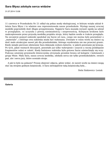 Sara Błysz zdobyła serca widzów 31.07.2014 13:06 11 czerwca w Przedszkolu Nr 21 odbył się pokaz mody ekologicznej, w którym wzięła udział 4letnia Sara Błysz i to właśnie ona reprezentowała nasze przedszkole. Występ naszej uroczej modelki poprzedziły dość długie przygotowania. Najpierw Sara musiała wyrazić zgodę na udział w przeglądzie, co uczyniła z pewną nieśmiałością i niepewnością. Kolejnym krokiem było zaakceptowanie przez przyszłą modelkę projektu stroju, który będzie nosiła w trakcie przeglądu. Na szczęście pomysł sukienki spodobał się Sarze od razu, czego nie można było powiedzieć o „materiale”, z którego owa sukienka miała być wykonana. Zwinięte w rulon worki na śmieci są dość mało atrakcyjne nawet jak dla przedszkolaka, którego wyobraźnia nie ma przecież granic. Kiedy minęło pierwsze zdziwienie Sara dokonała wyboru kolorów, w jakich powstanie jej kreacja. Po tych, jakże ważnych decyzjach, pozostało już tylko wykrojenie i uszycie a raczej posklejanie fragmentów sukni w całość. Kiedy baśniowa sukienka była gotowa Sarze uśmiechnęły się oczy. Podczas ostatniej przymiarki dziewczynka otrzymała gromkie brawa od kolegów i koleżanek z grupy Misie. Mała Sara, nasza urocza modelka, zdobyła serca nie tylko przedszkolaków, swoich pań, ale i serca jury, które oceniało stroje. A jak to było na pokazie? Proszę obejrzeć zdjęcia, gdzie widać, że nawet worki na śmieci mogą stać się strojem godnym księżniczki. A Sara niewątpliwie taką księżniczką była… Stela Sinkiewicz- Lesiuk Galeria