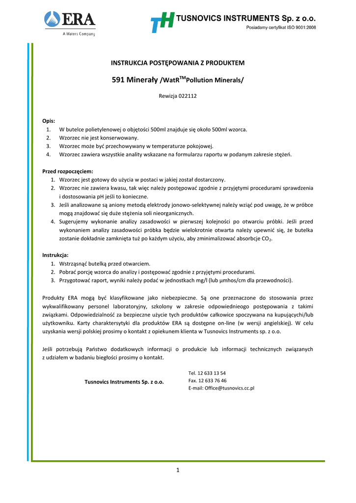 INSTRUKCJA POSTĘPOWANIA Z PRODUKTEM 591 Minerały /WatRTMPollution Minerals/ Rewizja 022112 Opis: 1. 2. 3. 4. W butelce polietylenowej o objętości 500ml znajduje się około 500ml wzorca. Wzorzec nie jest konserwowany. Wzorzec może być przechowywany w temperaturze pokojowej. Wzorzec zawiera wszystkie anality wskazane na formularzu raportu w podanym zakresie stężeń. Przed rozpoczęciem: 1. Wzorzec jest gotowy do użycia w postaci w jakiej został dostarczony. 2. Wzorzec nie zawiera kwasu, tak więc należy postępować zgodnie z przyjętymi procedurami sprawdzenia i dostosowania pH jeśli to konieczne. 3. Jeśli analizowane są aniony metodą elektrody jonowo-selektywnej należy wziąć pod uwagę, że w próbce mogą znajdować się duże stężenia soli nieorganicznych. 4. Sugerujemy wykonanie analizy zasadowości w pierwszej kolejności po otwarciu próbki. Jeśli przed wykonaniem analizy zasadowości próbka będzie wielokrotnie otwarta należy upewnić się, że butelka zostanie dokładnie zamknięta tuż po każdym użyciu, aby zminimalizować absorbcje CO 2. Instrukcja: 1. Wstrząsnąć butelką przed otwarciem. 2. Pobrać porcję wzorca do analizy i postępować zgodnie z przyjętymi procedurami. 3. Przygotować raport, wyniki należy podać w jednostkach mg/l (lub µmhos/cm dla przewodności). Produkty ERA mogą być klasyfikowane jako niebezpieczne. Są one przeznaczone do stosowania przez wykwalifikowany personel laboratoryjny, szkolony w zakresie odpowiednieogo postępowania z takimi związkami. Odpowiedzialność za bezpieczne użycie tych produktów całkowice spoczywana na kupującychi/lub użytkowniku. Karty charaktersytyki dla produktów ERA są dostępne on-line (w wersji angielskiej). W celu uzyskania wersji polskiej prosimy o kontakt z opiekunem klienta w Tusnovics Instruments sp. z o.o. Jeśli potrzebują Państwo dodatkowych informacji o produkcie lub informacji technicznych związanych z udziałem w badaniu biegłości prosimy o kontakt. Tel. 12 633 13 54 Fax. 12 633 76 46 E-mail: [email protected] Tusnovics Instruments Sp. z o.o. 1