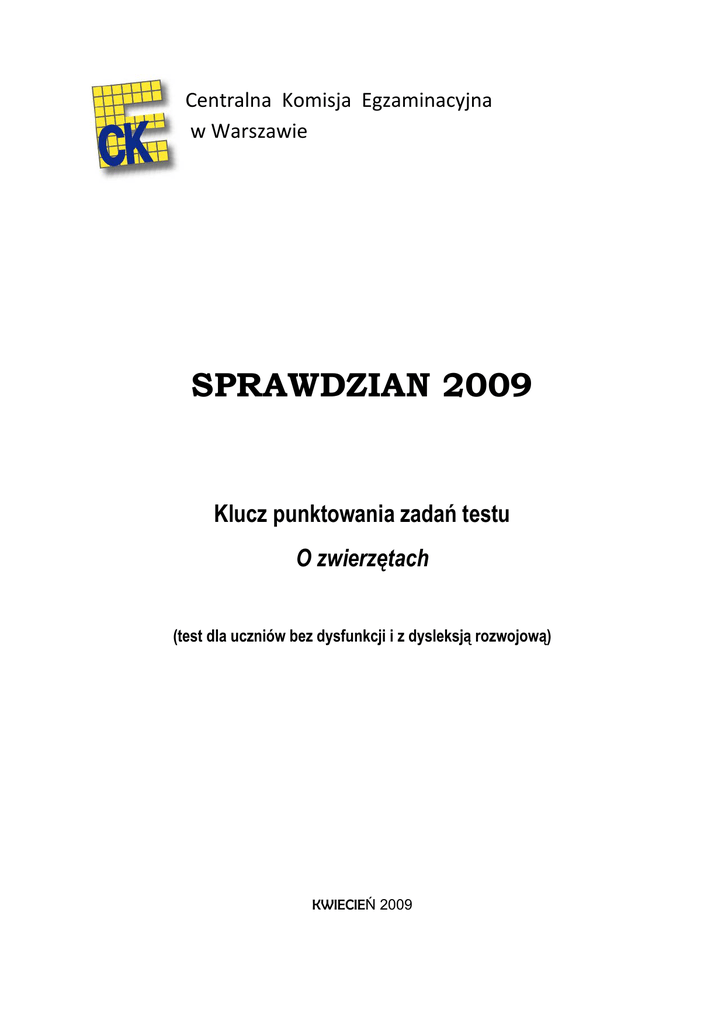 Centralna Komisja Egzaminacyjna w Warszawie SPRAWDZIAN 2009 Klucz punktowania zadań testu O zwierzętach (test dla uczniów bez dysfunkcji i z dysleksją rozwojową) KWIECIEŃ 2009 Zadanie 1. Obszar standardów czytanie Czynność Standard Poprawna odpowiedź (1 p.) odczytywanie tekstu popularnonaukowego (1.1) określenie tematu tekstu C odczytywanie tekstu popularnonaukowego (1.1) wnioskowanie na podstawie kilku informacji D odczytywanie tekstu popularnonaukowego (1.1) wyjaśnienie celu użycia zwrotu do czytelnika B odczytywanie tekstu popularnonaukowego (1.1) odczytanie informacji podanej wprost C doliczenie do podanej daty czasu trwania procesu i ustalenie daty jego zakończenia D obliczenie różnicy długości, gdy dane są wyrażone w różnych jednostkach C obliczenie czasu trwania zdarzenia A wyznaczenie skali planu A opisywanie sytuacji za pomocą wyrażenia arytmetycznego (3.5) ustalenie sposobu obliczenia reszty pieniędzy B sprawdzanie wyników z warunkami zadania (3.9) wskazanie liczby spełniającej warunki zadania A Zadanie 2. czytanie Zadanie 3. czytanie Zadanie 4. czytanie Zadanie 5. wykorzystywanie wykonywanie obliczeń dotyczących wiedzy w praktyce czasu (5.3) Zadanie 6. wykorzystywanie wykonywanie obliczeń dotyczących wiedzy w praktyce długości (5.3) Zadanie 7. wykorzystywanie wykonywanie obliczeń dotyczących wiedzy w praktyce czasu (5.3) Zadanie 8. wykorzystywanie wykorzystanie w sytuacji wiedzy w praktyce praktycznej własności liczb (5.5) Zadanie 9. rozumowanie Zadanie 10. rozumowanie 1 Zadanie 11. wykorzystywanie wykonywanie obliczeń dotyczących wiedzy w praktyce czasu (5.3) obliczenie czasu trwania zdarzenia C posługiwanie się źródłem informacji (4.1) wnioskowanie na podstawie informacji B posługiwanie się źródłem informacji (4.1) dostrzeżenie wspólnej cechy w kilku informacjach B Zadanie 12. korzystanie z informacji Zadanie 13. korzystanie z informacji Zadanie 14. czytanie odczytywanie tekstu literackiego (1.1) odczytanie głównej myśli utworu C czynne posługiwanie się terminem narrator (1.2) C Zadanie 15. czytanie rozpoznanie narratora Zadanie 16. czytanie odczytywanie tekstu literackiego (1.1) określenie cechy charakteru wskazanej postaci D odczytywanie tekstu literackiego (1.1) wyjaśnienie znaczenia wyrazu na podstawie kontekstu D odczytywanie danych z diagramu (1.4) odczytanie danych z diagramu słupkowego D odczytywanie danych z diagramu (1.4) porównanie danych odczytanych z diagramu słupkowego C rozpoznawanie własności liczb (3.6) A Zadanie 17. czytanie Zadanie 18. czytanie Zadanie 19. czytanie Zadanie 20. rozumowanie określenie ułamka danej wielkości 2 Ogólna zasada oceniania zadań otwartych Zaleca się życzliwe ocenianie, czyli tolerowanie drobnych nieścisłości lub niejasności, ale zakazuje się nadinterpretacji, czyli przypisywania uczniowi wiedzy, która nie została ujawniona w odpowiedziach. Zadanie 21. rozumowanie rozpoznawanie charakterystycznych cech i własności środowiska (3.6) Poprawna odpowiedź: pszenica mysz uzupełnienie łańcucha pokarmowego lis orzeł (1 p.) Uwaga! Jeśli uczeń w drugim ogniwie łańcucha napisze: mysz, a w trzecim: żaba śmieszka, to choć nie było takiej odpowiedzi do wyboru, rozwiązanie należy uznać za poprawne. Żaba śmieszka może zjadać małe myszki w gniazdach. Zadanie 22. Część 1. korzystanie z informacji analizowanie i wybieranie ofert mediów zgodnie ze wskazanymi kryteriami (4.2) wybór na podstawie analizy ofert Poprawna odpowiedź: Amelia (1 p.) Część 2. korzystanie z informacji posługiwanie się źródłem informacji (4.1) wnioskowanie na podstawie informacji Poprawna odpowiedź: wskazanie przynamniej jednego elementu położenia wspólnego dla wszystkich pensjonatów: - w pobliżu zbiornika wodnego (jeziora, rzeki, morza, zalewu) - w pobliżu miejsc, w których można wypoczywać aktywnie - w pobliżu miejsc atrakcyjnych turystycznie lub określenie cechy położenia każdego pensjonatu z osobna. (1 p.) Przykłady poprawnych odpowiedzi: • Pensjonaty leżą nad wodą. • Wszystkie pensjonaty są nad jeziorami. • Wszystkie są położone nad morzem/jeziorem/oceanem. • „Malwa” jest najbliżej wody, a „Amelia” najdalej. • Leżą niedaleko jezior. Są tam trasy rowerowe i turystyczne. • Jest tam wiele tras do spacerów, jazdy na rowerze lub na koniu. • Niedaleko każdego jest jakaś atrakcja turystyczna. • Wszystkie leżą nad wodą., W „Malwie” i „Zaciszu” można jeździć konno, natomiast w „Zaciszu” i „Amelii” są wycieczki rowerowe. • Wszystkie są nad wodą, a dwa w pobliżu stadniny. • „Malwa” znajduje się w pobliżu stadniny, „Zacisze” blisko tras rowerowych, a „Amelia” obok szlaku pieszego. • Jeden jest nad jeziorem, obok stadniny, drugi nad wodą przy trasie rowerowej, trzeci przy pieszym szlaku. 3 Niepoprawna odpowiedź: podanie informacji niewynikających z ofert lub informacji niedotyczących położenia pensjonatów, lub niepodanie informacji dotyczących położenia wszystkich pensjonatów, lub oprócz poprawnych informacji podanie sprzecznych z nimi informacji niepoprawnych, lub niepowiązanie informacji z położeniem pensjonatów. (0 p.) Przykłady niepoprawnych odpowiedzi: • Są 100, 150 lub 200 m n.p.m. • Są położone blisko siebie. • Wszędzie można zabrać psa. • Leżą nad Morzem Bałtyckim. • Pensjonaty znajdują się na Mazurach. • Leżą w pobliżu stadniny. • Pensjonaty leżą nad morzem, w górach. • Wszystkie są nad wodą lub w pobliżu tras rowerowych. • W każdym można miło spędzać czas. • Są atrakcyjne. Zadanie 23. Etap 1. rozumowanie ustalanie sposobu rozwiązania zadania i prezentacji tego rozwiązania (3.8) ustalenie sposobu obliczenia pola równoległoboku Poprawna odpowiedź: 75 m·120 m, 75 ·120 (1 p.) Etap 2. wykorzystywanie wykonywanie obliczeń dotyczących powiedzy w praktyce wierzchni (5.3) Poprawna odpowiedź: 9000 (m2 ) o