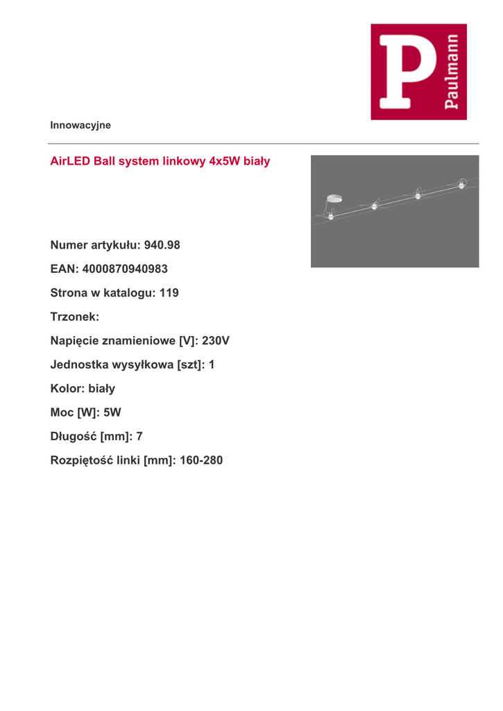 Innowacyjne AirLED Ball system linkowy 4x5W biały Numer artykułu: 940.98 EAN: 4000870940983 Strona w katalogu: 119 Trzonek: Napięcie znamieniowe [V]: 230V Jednostka wysyłkowa [szt]: 1 Kolor: biały Moc [W]: 5W Długość [mm]: 7 Rozpiętość linki [mm]: 160-280