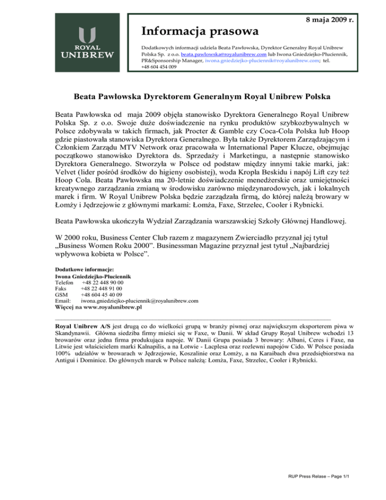 8 maja 2009 r. Informacja prasowa Dodatkowych informacji udziela Beata Pawłowska, Dyrektor Generalny Royal Unibrew Polska Sp. z o.o. [email protected] lub Iwona Gniedziejko-Płuciennik, PR&Sponsorship Manager, [email protected]; tel. +48 604 454 009 Beata Pawłowska Dyrektorem Generalnym Royal Unibrew Polska Beata Pawłowska od maja 2009 objęła stanowisko Dyrektora Generalnego Royal Unibrew Polska Sp. z o.o. Swoje duże doświadczenie na rynku produktów szybkozbywalnych w Polsce zdobywała w takich firmach, jak Procter & Gamble czy Coca-Cola Polska lub Hoop gdzie piastowała stanowiska Dyrektora Generalnego. Była także Dyrektorem Zarządzającym i Członkiem Zarządu MTV Network oraz pracowała w International Paper Klucze, obejmując początkowo stanowisko Dyrektora ds. Sprzedaży i Marketingu, a następnie stanowisko Dyrektora Generalnego. Stworzyła w Polsce od podstaw między innymi takie marki, jak: Velvet (lider pośród środków do higieny osobistej), woda Kropla Beskidu i napój Lift czy też Hoop Cola. Beata Pawłowska ma 20-letnie doświadczenie menedżerskie oraz umiejętności kreatywnego zarządzania zmianą w środowisku zarówno międzynarodowych, jak i lokalnych marek i firm. W Royal Unibrew Polska będzie zarządzała firmą, do której należą browary w Łomży i Jędrzejowie z głównymi markami: Łomża, Faxe, Strzelec, Cooler i Rybnicki. Beata Pawłowska ukończyła Wydział Zarządzania warszawskiej Szkoły Głównej Handlowej. W 2000 roku, Business Center Club razem z magazynem Zwierciadło przyznał jej tytuł „Business Women Roku 2000”. Businessman Magazine przyznał jest tytuł „Najbardziej wpływowa kobieta w Polsce”. Dodatkowe informacje: Iwona Gniedziejko-Płuciennik Telefon +48 22 448 90 00 Faks +48 22 448 91 00 GSM +48 604 45 40 09 Email: [email protected] Więcej na www.royalunibrew.pl ––––––––––––––––––––––––––––––––––––––––––––––––––––––––––––––––––––––––––––––––––––– Royal Unibrew A/S jest drugą co do wielkości grupą w branży piwnej oraz największym eksporterem piwa w Skandynawii. Główna siedziba firmy mieści się w Faxe, w Danii. W skład Grupy Royal Unibrew wchodzi 13 browarów oraz jedna firma produkująca napoje. W Danii Grupa posiada 3 browary: Albani, Ceres i Faxe, na Litwie jest właścicielem marki Kalnapilis, a na Łotwie - Lacplesa oraz rozlewni napojów Cido. W Polsce posiada 100% udziałów w browarach w Jędrzejowie, Koszalinie oraz Łomży, a na Karaibach dwa przedsiębiorstwa na Antigui i Dominice. Do głównych marek w Polsce należą: Łomża, Faxe, Strzelec, Cooler i Rybnicki. RUP Press Relase – Page 1/1