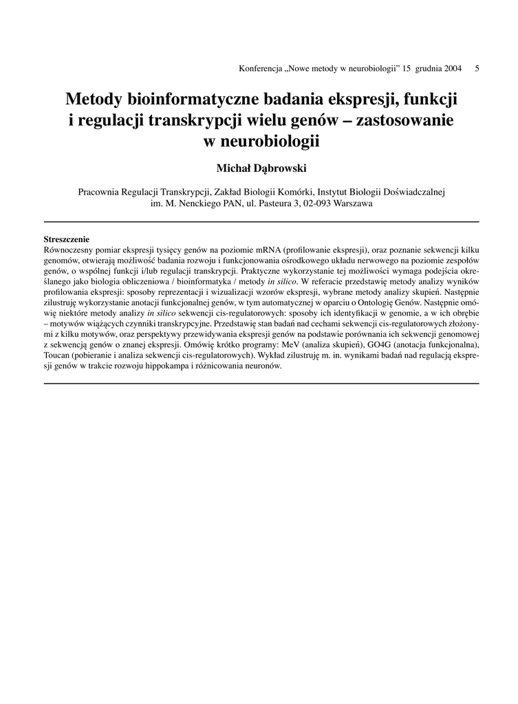 Konferencja „Nowe metody w neurobiologii” 15 grudnia 2004 5 Metody bioinformatyczne badania ekspresji, funkcji i regulacji transkrypcji wielu genów – zastosowanie w neurobiologii Michał Dąbrowski Pracownia Regulacji Transkrypcji, Zakład Biologii Komórki, Instytut Biologii Doświadczalnej im. M. Nenckiego PAN, ul. Pasteura 3, 02-093 Warszawa Streszczenie Równoczesny pomiar ekspresji tysięcy genów na poziomie mRNA (profilowanie ekspresji), oraz poznanie sekwencji kilku genomów, otwierają możliwość badania rozwoju i funkcjonowania ośrodkowego układu nerwowego na poziomie zespołów genów, o wspólnej funkcji i/lub regulacji transkrypcji. Praktyczne wykorzystanie tej możliwości wymaga podejścia określanego jako biologia obliczeniowa / bioinformatyka / metody in silico. W referacie przedstawię metody analizy wyników profilowania ekspresji: sposoby reprezentacji i wizualizacji wzorów ekspresji, wybrane metody analizy skupień. Następnie zilustruję wykorzystanie anotacji funkcjonalnej genów, w tym automatycznej w oparciu o Ontologię Genów. Następnie omówię niektóre metody analizy in silico sekwencji cis-regulatorowych: sposoby ich identyfikacji w genomie, a w ich obrębie – motywów wiążących czynniki transkrypcyjne. Przedstawię stan badań nad cechami sekwencji cis-regulatorowych złożonymi z kilku motywów, oraz perspektywy przewidywania ekspresji genów na podstawie porównania ich sekwencji genomowej z sekwencją genów o znanej ekspresji. Omówię krótko programy: MeV (analiza skupień), GO4G (anotacja funkcjonalna), Toucan (pobieranie i analiza sekwencji cis-regulatorowych). Wykład zilustruję m. in. wynikami badań nad regulacją ekspresji genów w trakcie rozwoju hippokampa i różnicowania neuronów.