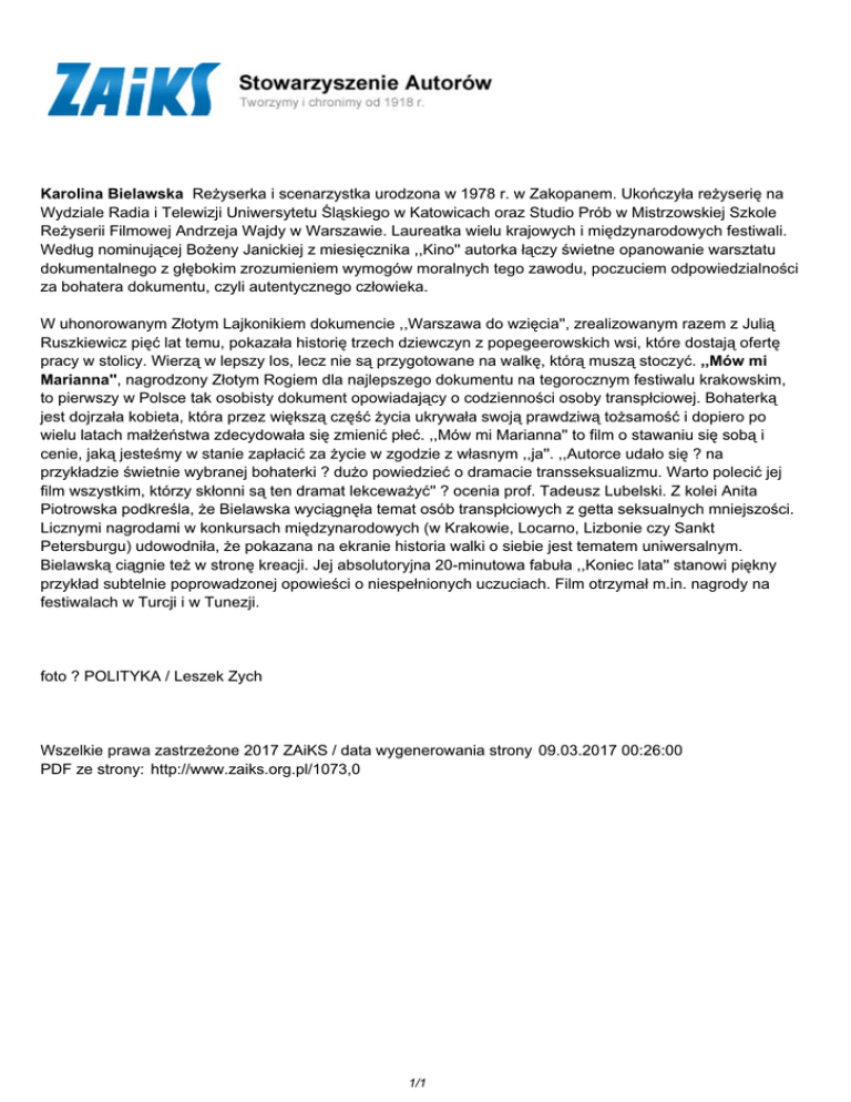Karolina Bielawska Reżyserka i scenarzystka urodzona w 1978 r. w Zakopanem. Ukończyła reżyserię na Wydziale Radia i Telewizji Uniwersytetu Śląskiego w Katowicach oraz Studio Prób w Mistrzowskiej Szkole Reżyserii Filmowej Andrzeja Wajdy w Warszawie. Laureatka wielu krajowych i międzynarodowych festiwali. Według nominującej Bożeny Janickiej z miesięcznika ,,Kino'' autorka łączy świetne opanowanie warsztatu dokumentalnego z głębokim zrozumieniem wymogów moralnych tego zawodu, poczuciem odpowiedzialności za bohatera dokumentu, czyli autentycznego człowieka. W uhonorowanym Złotym Lajkonikiem dokumencie ,,Warszawa do wzięcia'', zrealizowanym razem z Julią Ruszkiewicz pięć lat temu, pokazała historię trzech dziewczyn z popegeerowskich wsi, które dostają ofertę pracy w stolicy. Wierzą w lepszy los, lecz nie są przygotowane na walkę, którą muszą stoczyć. ,,Mów mi Marianna'', nagrodzony Złotym Rogiem dla najlepszego dokumentu na tegorocznym festiwalu krakowskim, to pierwszy w Polsce tak osobisty dokument opowiadający o codzienności osoby transpłciowej. Bohaterką jest dojrzała kobieta, która przez większą część życia ukrywała swoją prawdziwą tożsamość i dopiero po wielu latach małżeństwa zdecydowała się zmienić płeć. ,,Mów mi Marianna'' to film o stawaniu się sobą i cenie, jaką jesteśmy w stanie zapłacić za życie w zgodzie z własnym ,,ja''. ,,Autorce udało się ? na przykładzie świetnie wybranej bohaterki ? dużo powiedzieć o dramacie transseksualizmu. Warto polecić jej film wszystkim, którzy skłonni są ten dramat lekceważyć'' ? ocenia prof. Tadeusz Lubelski. Z kolei Anita Piotrowska podkreśla, że Bielawska wyciągnęła temat osób transpłciowych z getta seksualnych mniejszości. Licznymi nagrodami w konkursach międzynarodowych (w Krakowie, Locarno, Lizbonie czy Sankt Petersburgu) udowodniła, że pokazana na ekranie historia walki o siebie jest tematem uniwersalnym. Bielawską ciągnie też w stronę kreacji. Jej absolutoryjna 20-minutowa fabuła ,,Koniec lata'' stanowi piękny przykład subtelnie poprowadzonej opowieści o niespełnionych uczuciach. Film otrzymał m.in. nagrody na festiwalach w Turcji i w Tunezji. foto ? POLITYKA / Leszek Zych Wszelkie prawa zastrzeżone 2017 ZAiKS / data wygenerowania strony 09.03.2017 00:26:00 PDF ze strony: http://www.zaiks.org.pl/1073,0 1/1