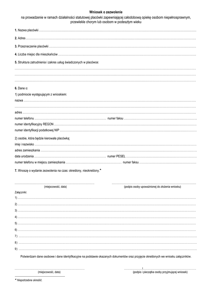 Wniosek o zezwolenie na prowadzenie w ramach działalności statutowej placówki zapewniającej całodobową opiekę osobom niepełnosprawnym, przewlekle chorym lub osobom w podeszłym wieku 1. Nazwa placówki . ... ... ... ... ... .... ... ... ... ... ... ... ... ... ... ... ... .... ... ... ... ... ... ... ... ... ... ... ... .... ... ... ... ... ... ... ... ... ... ... ... .... ... ... . 2. Adres .. ... ... ... ... ... ... ... ... . .... ... ... ... ... ... ... ... ... ... ... ... .... ... ... ... ... ... ... ... ... ... ... ... .... ... ... ... ... ... ... ... ... ... ... ... .... ... ... . 3. Przeznaczenie placówki ... ... . .... ... ... ... ... ... ... ... ... ... ... ... .... ... ... ... ... ... ... ... ... ... ... ... .... ... ... ... ... ... ... ... ... ... ... ... .... ... ... . 4. Liczba miejsc dla mieszkańców ... ... ... ... ... ... .. . ... ... ... ... . .... ... ... ... ... ... ... ... ... ... ... ... .... ... ... ... ... ... ... ... ... ... ... ... .... ... ... ... 5. Struktura zatrudnienia i zakres usług świadczonych w placówce: .... ... ... ... ... ... ... ... ... ... ... ... .... ... ... ... ... ... ... ... ... ... ... ... .... ... ... ... ... ... ... ... ... ... ... ... .... ... ... ... ... ... ... ... ... ... ... ... .... ... ... . .... ... ... ... ... ... ... ... ... ... ... ... .... ... ... ... ... ... ... ... ... ... ... ... .... ... ... ... ... ... ... ... ... ... ... ... .... ... ... ... ... ... ... ... ... ... ... ... .... ... ... . .... ... ... ... ... ... ... ... ... ... ... ... .... ... ... ... ... ... ... ... ... ... ... ... .... ... ... ... ... ... ... ... ... ... ... ... .... ... ... ... ... ... ... ... ... ... ... ... .... ... ... . 6. Dane o: 1) podmiocie występującym z wnioskiem: nazwa .. ... ... ... ... ... ... ... ... ... .... ... ... ... ... ... ... ... ... ... ... ... .... ... ... ... ... ... ... ... ... ... ... ... .... ... ... ... ... ... ... ... ... ... ... ... .... ... ... . .... ... ... ... ... ... ... ... ... ... ... ... .... ... ... ... ... ... ... ... ... ... ... ... .... ... ... ... ... ... ... ... ... ... ... ... .... ... ... ... ... ... ... ... ... ... ... ... .... ... ... . adres .... ... ... ... ... ... ... ... ... .. .... ... ... ... ... ... ... ... ... ... ... ... .... ... ... ... ... ... ... ... ... ... ... ... .... ... ... ... ... ... ... ... ... ... ... ... .... ... ... . numer telefonu .... ... ... ... ... ... . .... ... ... ... ... ... ... ... ... ... ... ... .... .. numer faksu ... ... ... .. ... . .... ... ... ... ... ... ... ... ... ... ... ... .... ... ... .. numer identyfikacyjny REGON .. .... ... ... ... ... ... ... ... ... ... ... ... .... ... ... ... ... ... ... ... ... ... ... ... .... ... ... ... ... ... ... ... ... ... ... ... .... ... ... .. numer identyfikacji podatkowej NIP .. ... ... ... ... ... ... ... ... ... ... ... .... ... ... ... ... ... ... ... ... ... ... ... .... ... ... ... ... ... ... ... ... ... ... ... .... ... ... . 2) osobie, która będzie kierowała placówką: imię i nazwisko .. ... ... ... ... ... .. .... ... ... ... ... ... ... ... ... ... ... ... .... ... ... ... ... ... ... ... ... ... ... ... .... ... ... ... ... ... ... ... ... ... ... ... .... ... ... .. adres zamieszkania . ... ... ... ... . .... ... ... ... ... ... ... ... ... ... ... ... .... ... ... ... ... ... ... ... ... ... ... ... .... ... ... ... ... ... ... ... ... ... ... ... .... ... ... .. data urodzenia ... ... ... ... ... ... .. .... ... ... ... ... ... ... ... ... ... ... ... .... .. numer PESEL ... ... ... ... . .... ... ... ... ... ... ... ... ... ... ... ... .... ... ... .. numer telefonu w miejscu zamieszkania .. ... ... ... .. . ... ... ... ... ... .... ... ... ... ... ... . numer faksu . .... ... ... ... ... ... ... ... ... ... ... ... .... ... ... .. 7. Wnoszę o wydanie zezwolenia na czas: określony, nieokreślony.♣ .... ... ... ... ... ... ... ... ... ... ... ... .... ... ... ... ... ... ... ... ... ... .. (miejscowość, data) .... ... ... ... ... ... ... ... ... ... ... ... .... ... ... ... ... ... ... ... ... ... ... ... (podpis osoby upowaŜnionej do złoŜenia wniosku) Załączniki: 1) . . . . . . . . . . . . . . . . . . . . . . . . . . . . . . . . . . . . . . . . . . . . . . . . . . . . . . . . . . . . . . . . . . . . . . . . . . . . . . . . . . . . . . . . . . . . . . . . . . . . . . . . . . . . . . . . . . . . . . . . . . . . . . . . . . . . . . . . . . . . . . . . . . . . . . . . . . . . . . . . . . . . . . . . 2) . . . . . . . . . . . . . . . . . . . . . . . . . . . . . . . . . . . . . . . . . . . . . . . . . . . . . . . . . . . . . . . . . . . . . . . . . . . . . . . . . . . . . . . . . . . . . . . . . . . . . . . . . . . . . . . . . . . . . . . . . . . . . . . . . . . . . . . . . . . . . . . . . . . . . . . . . . . . . . . . . . . . . . . . 3) . . . . . . . . . . . . . . . . . . . . . . . . . . . . . . . . . . . . . . . . . . . . . . . . . . . . . . . . . . . . . . . . . . . . . . . . . . . . . . . . . . . . . . . . . . . . . . . . . . . . . . . . . . . . . . . . . . . . . . . . . . . . . . . . . . . . . . . . . . . . . . . . . . . . . . . . . . . . . . . . . . . . . . . . 4) . . . . . . . . . . . . . . . . . . . . . . . . . . . . . . . . . . . . . . . . . . . . . . . . . . . . . . . . . . . . . . . . . . . . . . . . . . . . . . . . . . . . . . . . . . . . . . . . . . . . . . . . . . . . . . . . . . . . . . . . . . . . . . . . . . . . . . . . . . . . . . . . . . . . . . . . . . . . . . . . . . . . . . . . 5) . . . . . . . . . . . . . . . . . . . . . . . . . . . . . . . . . . . . . . . . . . . . . . . . . . . . . . . . . . . . . . . . . . . . . . . . . . . . . . . . . . . . . . . . . . . . . . . . . . . . . . . . . . . . . . . . . . . . . . . . . . . . . . . . . . . . . . . . . . . . . . . . . . . . . . . . . . . . . . . . . . . . . . . . 6) . . . . . . . . . . . . . . . . . . . . . . . . . . . . . . . . . . . . . . . . . . . . . . . . . . . . . . . . . . . . . . . . . . . . . . . . . . . . . 