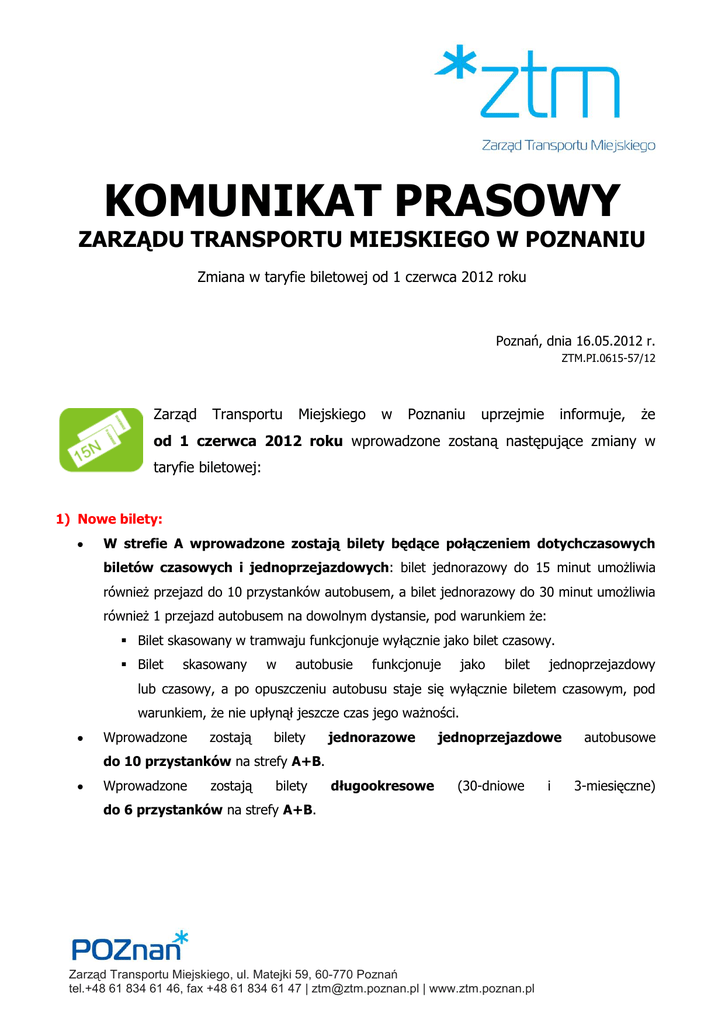 KOMUNIKAT PRASOWY ZARZĄDU TRANSPORTU MIEJSKIEGO W POZNANIU Zmiana w taryfie biletowej od 1 czerwca 2012 roku Poznań, dnia 16.05.2012 r. ZTM.PI.0615-57/12 Zarząd Transportu Miejskiego w Poznaniu uprzejmie informuje, że od 1 czerwca 2012 roku wprowadzone zostaną następujące zmiany w taryfie biletowej: 1) Nowe bilety: W strefie A wprowadzone zostają bilety będące połączeniem dotychczasowych biletów czasowych i jednoprzejazdowych: bilet jednorazowy do 15 minut umożliwia również przejazd do 10 przystanków autobusem, a bilet jednorazowy do 30 minut umożliwia również 1 przejazd autobusem na dowolnym dystansie, pod warunkiem że: Bilet skasowany w tramwaju funkcjonuje wyłącznie jako bilet czasowy. Bilet skasowany w autobusie funkcjonuje jako bilet jednoprzejazdowy lub czasowy, a po opuszczeniu autobusu staje się wyłącznie biletem czasowym, pod warunkiem, że nie upłynął jeszcze czas jego ważności. Wprowadzone zostają bilety jednorazowe jednoprzejazdowe autobusowe do 10 przystanków na strefy A+B. Wprowadzone zostają bilety długookresowe (30-dniowe do 6 przystanków na strefy A+B. Zarząd Transportu Miejskiego, ul. Matejki 59, 60-770 Poznań tel.+48 61 834 61 46, fax +48 61 834 61 47 | [email protected] | www.ztm.poznan.pl i 3-miesięczne) 2) Zlikwidowane bilety: na linie pospieszne – od 1 czerwca 2012 roku na liniach pospiesznych obowiązuje opłata taka jak na liniach normalnych. bilety miesięczne (na miesiąc kalendarzowy) - pozostają bilety 30-dniowe. krótkookresowe grupowe 3) Oferty promocyjne dla posiadaczy biletów krótko i długookresowych: Bilet 24-godzinny, który zostanie skasowany między 20:00 w piątek a 24:00 w sobotę, zachowuje ważność do końca weekendu tj. do 24:00 w niedzielę. Oferta „3+1” dla rodzin. W przypadku, gdy oboje rodzice posiadają bilety imienne sieciowe normalne i jedno z ich dzieci posiada bilet imienny sieciowy ulgowy, rodzinie przysługuje jeden bezpłatny imienny bilet ulgowy dla kolejnego dziecka, ważny na okres odpowiadający najkrótszemu z posiadanych biletów oraz w najtańszej strefie wśród posiadanych biletów. Przykład: rodzice posiadają bilety normalne na sieć: 3- i 12-miesięczny ważne w strefach A+B, a jedno z dzieci posiada bilet ulgowy na sieć na 6 miesięcy ważny w strefie B. Rodzinie przysługuje jeden bezpłatny bilet 3-miesięczny ulgowy ważny w strefie B dla kolejnego dziecka. Oferta „weekendowa”. Osoba posiadająca normalny bilet imienny sieciowy może bezpłatnie przewozić pod swoją opieką dzieci w wieku do 15 lat w soboty, niedziele i święta na liniach dziennych w ramach odpowiedniej strefy biletowej. Oferta „12+1”. Osoba, która będzie kupowała bilety imienne sieciowe 30-dniowe przez 12 kolejnych miesięcy (łączna przerwa pomiędzy okresami ich obowiązywania w skali 12 miesięcy nie będzie większa niż 5 dni), ma prawo do otrzymania jednego bezpłatnego biletu imiennego sieciowego 30-dniowego w najtańszej strefie biletowej spośród tych na które kupowała bilety w ciągu wcześniejszych 12-miesięcy. Szczegółowe informacje dotyczące zmian w taryfie biletowej dostępne są na stronie ZTM (www.ztm.poznan.pl) w zakładce Bilety -> Zmiana cennika od 01.06.2012 Z poważaniem Zdzisława Andrzejewska Z-ca dyrektora ds. Handlowych