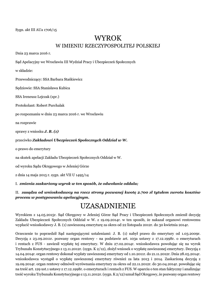 Sygn. akt III AUa 1706/15 WYROK W IMIENIU RZECZYPOSPOLITEJ POLSKIEJ Dnia 23 marca 2016 r. Sąd Apelacyjny we Wrocławiu III Wydział Pracy i Ubezpieczeń Społecznych w składzie: Przewodniczący: SSA Barbara Staśkiewicz Sędziowie: SSA Stanisława Kubica SSA Ireneusz Lejczak (spr.) Protokolant: Robert Purchalak po rozpoznaniu w dniu 23 marca 2016 r. we Wrocławiu na rozprawie sprawy z wniosku J. B. (1) przeciwko Zakładowi Ubezpieczeń Społecznych Oddział w W. o prawo do emerytury na skutek apelacji Zakładu Ubezpieczeń Społecznych Oddział w W. od wyroku Sądu Okręgowego w Jeleniej Górze z dnia 14 maja 2015 r. sygn. akt VII U 1495/14 I. zmienia zaskarżony wyrok w ten sposób, że odwołanie oddala; II. zasądza od wnioskodawcy na rzecz strony pozwanej kwotę 2.700 zł tytułem zwrotu kosztów procesu w postępowaniu apelacyjnym. UZASADNIENIE Wyrokiem z 14.05.2015r. Sąd Okręgowy w Jeleniej Górze Sąd Pracy i Ubezpieczeń Społecznych zmienił decyzję Zakładu Ubezpieczeń Społecznych Oddział w W. z 19.09.2014r. w ten sposób, że nakazał organowi rentowemu wypłacić wnioskodawcy J. B. (1) zawieszoną emeryturę za okres od 22 listopada 2012r. do 30 kwietnia 2014r. Orzeczenie to poprzedził Sąd następującymi ustaleniami: J. B. (1) nabył prawo do emerytury od 1.03.2009r. Decyzją z 23.09.2011r. pozwany organ rentowy - na podstawie art. 103a ustawy z 17.12.1998r. o emeryturach i rentach z FUS - zawiesił wypłatę tej emerytury. W dniu 27.02.2014r. wnioskodawca powołując się na wyrok Trybunału Konstytucyjnego z 13.11.2012r. (sygn. K 2/12), złożył wniosek o wypłatę zawieszonej emerytury. Decyzją z 14.04.2014r. organ rentowy dokonał wypłaty zawieszonej emerytury od 1.10.2011r. do 21.11.2012r. Dnia 28.05.2014r. wnioskodawca wystąpił o wypłatę zawieszonej emerytury również za lata 2013 i 2014. Zaskarżoną decyzją z 19.09.2014r. organ rentowy odmówił wyrównania emerytury za okres od 22.11.2012r. do 30.04.2014r. powołując się na treść art. 129 ust.1 ustawy z 17.12.1998r. o emeryturach i rentach z FUS. W oparciu o ten stan faktyczny i analizując treść wyroku Trybunału Konstytucyjnego z 13.11.2012r. (sygn. K 2/12) uznał Sąd Okręgowy, że pozwany organ rentowy bezpodstawnie odmówił wnioskodawcy wypłaty emerytury za żądany okres. Podkreślił Sąd, że cytowane orzeczenie Trybunału Konstytucyjnego w pełni dotyczy sytuacji wnioskodawcy, co oznaczało, iż zawieszenie jego świadczenia było bezprawne. Realizując powyższe orzeczenie Trybunału Konstytucyjnego ustawodawca uchwalił ustawę z 13.12.2013r. o ustaleniu i wypłacie emerytur, do których prawo uległo zawieszeniu w okresie od 1.12.2011r. do 21.11.2012r. Wskazywało to na to, że organ rentowy nie wypłacając wnioskodawcy emerytury za późniejszy okres jej zawieszenia pozostawał w zwłoce z jej wypłatą. Nie była przy tym zasadna argumentacja strony pozwanej o braku wniosku ze strony wnioskodawcy o wypłatę zawieszonego świadczenia ponieważ właściwy wniosek złożył J. B. w marcu 2009r. wnosząc o ustalenie prawa do emerytury i od tej daty organ rentowy był zobowiązany do regularnej wypłaty należnego świadczenia. Zawinione zawieszenie przez organ rentowy wypłaty świadczenia wyłączało zastosowanie art. 129 ustawy emerytalnej i uzasadniało jego roszczenie. Wyrok ten zaskarżyła apelacją strona pozwana w całości, zarzucając mu naruszenia prawa materialnego, tj. art. 129 ust. 1 ustawy emerytalnej mocą której świadczenia wypłaca się nie wcześniej niż od miesiąca złożenia wniosku oraz przepisów ustawy z 13.12.2013r. o ustaleniu i wypłacie emerytur, do których prawo uległo zawieszeniu w okresie od 1.12.2011r. do 21.11.2012r. przez nakazanie organowi rentowemu wypłacenia emerytury wnioskodawcy za okres po 22.11.2012r. W oparciu o te zarzuty domagała się apelująca zmiany zaskarżonego wyroku i oddalenia odwołania ewentualnie jego uchylenia i przekazania sprawy sądowi I instancji do ponownego rozpoznania. W odpowiedzi na apelację wnioskodawca wniósł o jej oddalenie. Sąd Apelacyjny zważył, co następuje: Apelacja była zasadna, choć naruszenie innych niż wskazane w apelacji przepisów decydowało o wadliwości zaskarżonego wyroku. Z prawidłowych ustaleń Sądu Okręgowego wynikało, że prawomocna decyzja pozwanego organu z 23.09.2011r., zawieszająca emeryturę wnioskodawcy, nie została ani przez niego zaskarżona w drodze odwoławczej do sądu powszechnego, ani też nie został zgłoszony wniosek o wznowienie postępowania administracyjnego w trybie art. 145a kpa. Prawomocna decyzja zatem wywoływała skutek prawny do czasu złożenia przez wnioskodawcę wniosku o wznowienie wypłaty zawieszonego świadczenia. Wznowienie wypłaty zawieszonych świadczeń reguluje art. 135 ustawy z 17.12.1998r. o emeryturach i rentach z Funduszu Ubezpieczeń Społecznych (tj. Dz.U. z 2013r., poz. 1440 ze zm.). Zgodnie z tym przepisem w razie ustania przyczyny powodującej wstrzymanie wypłaty świadczenia, wypłatę wznawia się od miesiąca ustania tej przyczyny, jednak nie wcześniej niż od miesiąca, w którym zgłoszono wniosek o wznowienie wypłaty lub wydano z urzędu decyzję o jej wznowieniu. Nie podlegało kwestii, że przyczyną powodującą ustanie zawieszenia emerytury wnioskodawcy było przytoczone w uzasadnieniu zaskarżonego wyroku orzeczenie Trybunału Konstytucyjnego z 13.11.2012r. Organ rentowy nie wydał też z urzędu decyzji o wznowieniu wypłaty świadczenia. Początkową zatem datą wznowienia wypłaty zawieszonej emerytury musiała być - w myśl cytowanego art. 138 ust.1 - data zgłoszenia wniosku o wypłatę, czyli 27.02.2014r. Wskazać też należało, że w sprawie nie mógł mieć zastosowania przepis art. 135 ust. 3 cyt. ustawy. Nie można bowiem było uznać, że wstrzymująca wypłatę emerytury decyzja z 23.09.2011r. wydana została wskutek błędu organu rentowego. W dacie wydana tej decyzji obowiązywał art. 103