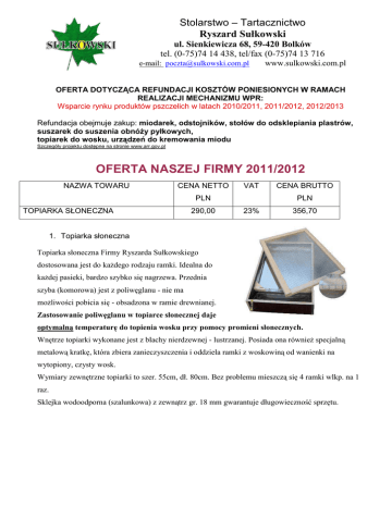 Stolarstwo – Tartacznictwo Ryszard Sułkowski ul. Sienkiewicza 68, 59-420 Bolków tel. (0-75)74 14 438, tel/fax (0-75)74 13 716 e-mail: [email protected] www.sulkowski.com.pl OFERTA DOTYCZĄCA REFUNDACJI KOSZTÓW PONIESIONYCH W RAMACH REALIZACJI MECHANIZMU WPR: Wsparcie rynku produktów pszczelich w latach 2010/2011, 2011/2012, 2012/2013 Refundacja obejmuje zakup: miodarek, odstojników, stołów do odsklepiania plastrów, suszarek do suszenia obnóży pyłkowych, topiarek do wosku, urządzeń do kremowania miodu Szczegóły projektu dostępne na stronie www.arr.gov.pl OFERTA NASZEJ FIRMY 2011/2012 NAZWA TOWARU CENA NETTO VAT PLN TOPIARKA SŁONECZNA 290,00 CENA BRUTTO PLN 23% 356,70 1. Topiarka słoneczna Topiarka słoneczna Firmy Ryszarda Sułkowskiego dostosowana jest do każdego rodzaju ramki. Idealna do każdej pasieki, bardzo szybko się nagrzewa. Przednia szyba (komorowa) jest z poliwęglanu - nie ma możliwości pobicia się - obsadzona w ramie drewnianej. Zastosowanie poliwęglanu w topiarce słonecznej daje optymalną temperaturę do topienia wosku przy pomocy promieni słonecznych. Wnętrze topiarki wykonane jest z blachy nierdzewnej - lustrzanej. Posiada ona również specjalną metalową kratkę, która zbiera zanieczyszczenia i oddziela ramki z woskowiną od wanienki na wytopiony, czysty wosk. Wymiary zewnętrzne topiarki to szer. 55cm, dł. 80cm. Bez problemu mieszczą się 4 ramki wlkp. na 1 raz. Sklejka wodoodporna (szalunkowa) z zewnątrz gr. 18 mm gwarantuje długowieczność sprzętu.
