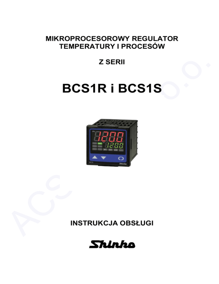 MIKROPROCESOROWY REGULATOR TEMPERATURY I PROCESÓW o. o . Z SERII AC SE Sp . z BCS1R i BCS1S INSTRUKCJA OBSŁUGI SPIS TREŚCI 1 MODEL I NAZWA. .............................................................................................................................. 5 1.1 JAK CZYTAĆ TABLICZKĘ ZNAMIONOWĄ? .............................................................................................................5 2 NAZWY I FUNKCJE WYŚWIETLACZY, KONTROLEK I KLAWISZY ............................................... 5 3 MONTAŻ. ............................................................................................................................................ 6 PODŁĄCZENIE. .................................................................................................................................. 7 4.1 4.2 5 o. o 4 WYBÓR MIEJSCA MONTAŻU. ..............................................................................................................................6 WYMIARY ZEWNĘTRZNE. ..................................................................................................................................6 WYMIARY OTWORU MONTAŻOWEGO. .................................................................................................................6 MONTAŻ W PANELU. .........................................................................................................................................7 . 3.1 3.2 3.3 3.4 ZACISKI PODŁĄCZENIOWE .................................................................................................................................8 KOŃCÓWKI KABLOWE PRZEWODÓW PODŁĄCZENIOWYCH ....................................................................................8 SCHEMAT PROGRAMOWANIA. ....................................................................................................... 9 5.1 5.2 5.3 5.4 KODY UŻYTE W TEJ INSTRUKCJI OBSŁUGI .........................................................................................................10 WSKAZANIA STARTOWE PO WŁĄCZENIU ZASILANIA. ..........................................................................................10 OPIS DZIAŁANIA ALARMU A1 I A2. ....................................................................................................................10 ALARM PRZERWANIA PĘTLI REGULACJI ............................................................................................................11 OBSŁUGA REGULATORA. ............................................................................................................. 11 7 PODSTAWOWE USTAWIENIA ........................................................................................................ 11 7.1 7.2 USTAWIENIE WARTOŚCI ZADANEJ ....................................................................................................................11 WYKONYWANIE AUTO-TUNINGU (AT) ...............................................................................................................11 WYJAŚNIENIE PARAMETRÓW REGULACJI. ............................................................................... 12 Sp . 8 z 6 8.1 PARAMETRY REGULACJI PID...........................................................................................................................12 8.1.1 ZAKRES PROPORCJONALNOŚCI (P). ............................................................................................................12 8.1.2 CZAS ZDWOJENIA (I). ..................................................................................................................................12 8.1.3 CZAS WYPRZEDZENIA (D). ..........................................................................................................................12 8.1.4 ARW (ANTI-RESET WINDUP) ......................................................................................................................12 8.2 AUTOMATYCZNY DOBÓR NASTAW PID (AUTO-TUNING). ....................................................................................12 8.3 AUTOMATYCZNE KASOWANIE OFFSETU (FUNKCJA AUTO-RESET). ......................................................................13 8.4 RĘCZNA KOREKTA NASTAW PID. .....................................................................................................................14 SE SPECYFIKACJA TECHNICZNA. ..................................................................................................... 15 AC 9 INSTRUKCJA OBSŁUGI BCS1R i BCS1S WSTĘP Dziękujemy za wybór naszego mikroprocesorowego regulatora z serii BCS1. Instrukcja zawiera opis sposobu montażu, funkcji, ustawień i uwagi dotyczące użytkowania regulatora. Nie dopuścić do wypadku w wyniku niewłaściwego użytkowania regulatora, upewnij się, że operator otrzymał niniejszą instrukcję obsługi. ZWRÓĆ UWAGĘ o. o . Przyrząd ten powinien być używany zgodnie z specyfikacją opisaną w niniejszej instrukcji obsługi. Jeżeli nie jest używany zgodnie ze specyfikacją, może działać źle lub spowodować zagrożenie. Nie zapomnij postępować zgodnie z uwagami i ostrzeżeniami. Jeżeli nie będą one przestrzegane, może nastąpić poważny uraz lub wadliwe działanie. Specyfikacja przyrządu i zawartości tej instrukcji obsługi mogą ulec zmianie bez ostrzeżenia. Dbamy o to, aby w instrukcji obsługi nie było błędów, jeśli jednak są jakiekolwiek wątpliwości, błędy lub pytania, proszę nas o tym poinformować. Przyrząd jest przewidziany do montażu panelowego. Jeżeli jest to niemożliwe, muszą zostać zachowane szczególne środki ostrożności, upewnij się, że operator nie może dotknąć zacisków elektrycznych lub innych części pod wysokim napięciem. Jakiekolwiek nielegalne zmiany lub kopiowanie tego dokumentu, częściowo lub w całości, jest zakazane. Shinko Technos CO., Ltd. nie ponosi odpowiedzialność za jakiekolwiek uszkodzenia lub zniszczenia wywołane używaniem tego pro