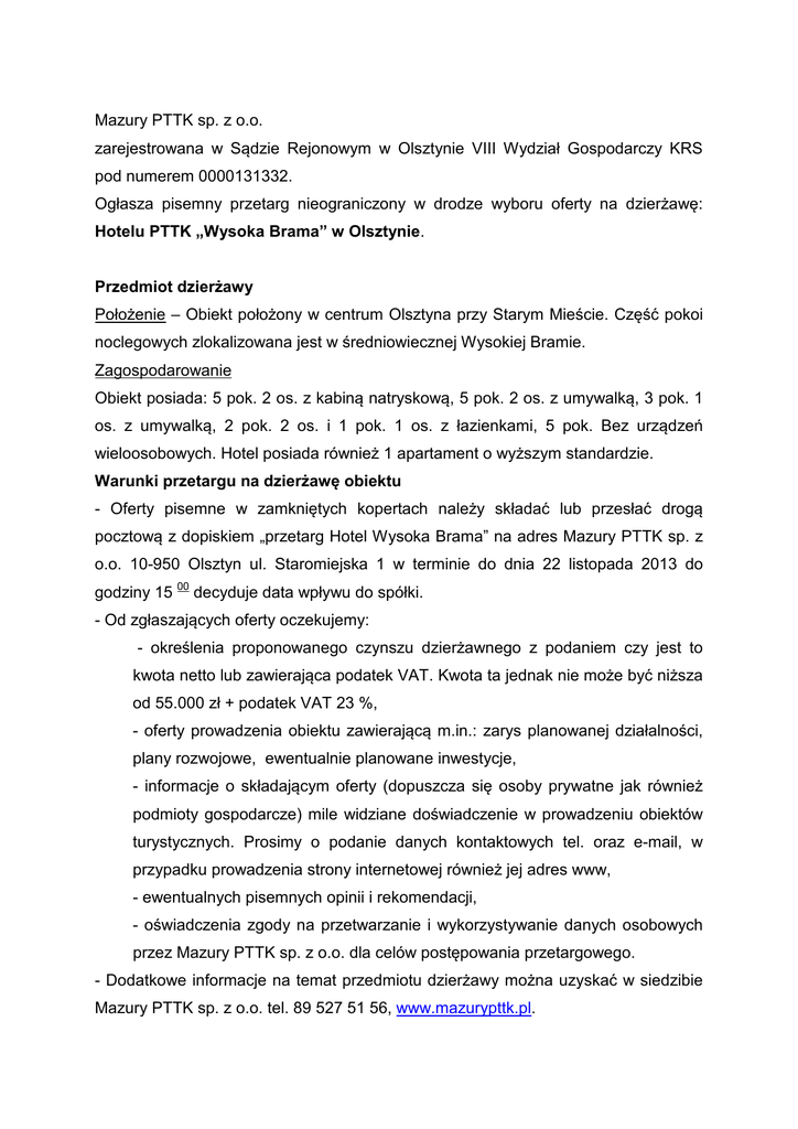 Mazury PTTK sp. z o.o. zarejestrowana w Sądzie Rejonowym w Olsztynie VIII Wydział Gospodarczy KRS pod numerem 0000131332. Ogłasza pisemny przetarg nieograniczony w drodze wyboru oferty na dzierżawę: Hotelu PTTK „Wysoka Brama” w Olsztynie. Przedmiot dzierżawy Położenie – Obiekt położony w centrum Olsztyna przy Starym Mieście. Część pokoi noclegowych zlokalizowana jest w średniowiecznej Wysokiej Bramie. Zagospodarowanie Obiekt posiada: 5 pok. 2 os. z kabiną natryskową, 5 pok. 2 os. z umywalką, 3 pok. 1 os. z umywalką, 2 pok. 2 os. i 1 pok. 1 os. z łazienkami, 5 pok. Bez urządzeń wieloosobowych. Hotel posiada również 1 apartament o wyższym standardzie. Warunki przetargu na dzierżawę obiektu - Oferty pisemne w zamkniętych kopertach należy składać lub przesłać drogą pocztową z dopiskiem „przetarg Hotel Wysoka Brama” na adres Mazury PTTK sp. z o.o. 10-950 Olsztyn ul. Staromiejska 1 w terminie do dnia 22 listopada 2013 do godziny 15 00 decyduje data wpływu do spółki. - Od zgłaszających oferty oczekujemy: - określenia proponowanego czynszu dzierżawnego z podaniem czy jest to kwota netto lub zawierająca podatek VAT. Kwota ta jednak nie może być niższa od 55.000 zł + podatek VAT 23 %, - oferty prowadzenia obiektu zawierającą m.in.: zarys planowanej działalności, plany rozwojowe, ewentualnie planowane inwestycje, - informacje o składającym oferty (dopuszcza się osoby prywatne jak również podmioty gospodarcze) mile widziane doświadczenie w prowadzeniu obiektów turystycznych. Prosimy o podanie danych kontaktowych tel. oraz e-mail, w przypadku prowadzenia strony internetowej również jej adres www, - ewentualnych pisemnych opinii i rekomendacji, - oświadczenia zgody na przetwarzanie i wykorzystywanie danych osobowych przez Mazury PTTK sp. z o.o. dla celów postępowania przetargowego. - Dodatkowe informacje na temat przedmiotu dzierżawy można uzyskać w siedzibie Mazury PTTK sp. z o.o. tel. 89 527 51 56, www.mazurypttk.pl. Istniej możliwość obejrzenia ośrodka przed złożeniem oferty w wyznaczonym indywidualnie terminie. - Wydzierżawiający zastrzega sobie prawo prowadzenia dodatkowych rokowań z wybranymi oferentami, swobodnego wyboru oferty oraz unieważnienia przetargu bez podania przyczyn. - O wynikach przetargu jego uczestnicy, powiadomieni zostaną pisemnie na wskazany w ofercie adres.