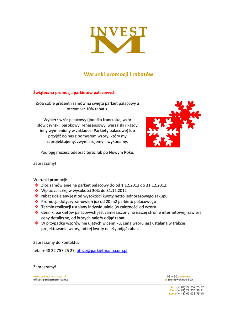 Warunki promocji i rabatów Świąteczna promocja parkietów pałacowych Zrób sobie prezent i zamów na święta parkiet pałacowy a otrzymasz 10% rabatu. Wybierz wzór pałacowy (jodełka francuska, wzór słowiczyński, barokowy, renesansowy, wersalski i każdy inny wymieniony w zakładce: Parkiety pałacowe) lub przyjdź do nas z pomysłem wzory, który my zaprojektujemy, zwymiarujemy i wykonamy. Podłogę możesz odebrać teraz lub po Nowym Roku. Zapraszamy! Warunki promocji: Złóż zamówienie na parkiet pałacowy do od 1.12.2012 do 31.12.2012. Wpłać zaliczkę w wysokości 30% do 31.12.2012 rabat udzielany jest od wysokości kwoty netto jednorazowego zakupu Promocja dotyczy zamówień już od 20 m2 parkietu pałacowego Termin realizacji ustalany indywidualnie (w zależności od wzoru Cenniki parkietów pałacowych jest zamieszczony na naszej stronie internetowej, zawiera ceny detaliczne, od których należy odjąć rabat W przypadku wzorów nie ujętych w cenniku, cena wzoru jest ustalana w trakcie projektowania wzory, od tej kwoty należy odjąć rabat. Zapraszamy do kontaktu: tel.: + 48 22 757 25 27, [email protected] Zapraszamy! www.parkietmann.com.pl [email protected] 05 – 501 Piaseczno ul. Broniewskiego 50A Tel.: (+ 48) 22 757 25 27 Fax.: (+ 48) 22 750 50 11 Kom.: (+ 48) 60 038 75 48 Promocja – Końcówki partii Promocyjne ceny obowiązują przy zakupie tylko i wyłącznie parkietów wymienionych na stronie www.parkietmann.com.pl w zakładce ‘Promocje’, w ściśle określonych ilościach, podanych przy danej wyprzedaży promocyjnej. Przy zamówieniu ilości mniejszej lub większej ilości niż ta wskazana, obowiązują ceny wg cennika firmowego - www.parkietmann.com.pl zakładka Cennik. Podane ceny są cenami netto. W przypadku pytań, zapraszamy do kontaktu: tel.: + 48 22 757 25 27, [email protected] Zapraszamy! www.parkietmann.com.pl [email protected] 05 – 501 Piaseczno ul. Broniewskiego 50A Tel.: (+ 48) 22 757 25 27 Fax.: (+ 48) 22 750 50 11 Kom.: (+ 48) 60 038 75 48