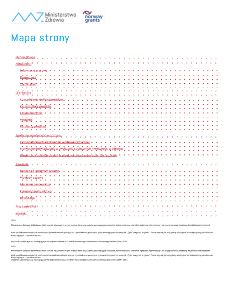 Mapa strony Strona główna Aktualności Informacje prasowe Prasa o nas Wyniki prac O projekcie Uzasadnienie realizacji projektu Cel i rezultaty projektu Grupa docelowa Wsparcie Partnerzy projektu Społeczne nierówności w zdrowiu Opis społecznych nierówności w zdrowiu w Europie Norweskie doświadczenia w zwalczaniu społecznych nierówności w zdrowiu Prezentacja polskich działań w przeszłości na danym polu i ich rezultaty Szkolenia Koncepcja i program szkoleń Wykłady bazowe Materiały pomocnicze Harmonogram szkoleń Rekrutacja Przydatne linki Kontakt Ministerstwo Zdrowia dokłada wszelkich starań, aby zawarte w tym miejscu dane były rzetelne, wyczerpujące i aktualne. Jednak mają one charakter wyłącznie informacyjny i nie mogą stanowić podstawy do jakichkolwiek roszczeń. Jeżeli opublikowany artykuł nie może zostać prawidłowo odczytany przez czytnik ekranu, prosimy o zgłoszenie tego poprzez przycisk „Zgłoś uwagę do artykułu”. Postaramy się jak najszybciej udostępnić bardziej czytelny plik dla osób korzystających z czytników ekranu. Wsparcie udzielone przez Norwegię poprzez dofinansowanie ze środków Norweskiego Mechanizmu Finansowego na lata 2009 -2014. Ministerstwo Zdrowia dokłada wszelkich starań, aby zawarte w tym miejscu dane były rzetelne, wyczerpujące i aktualne. Jednak mają one charakter wyłącznie informacyjny i nie mogą stanowić podstawy do jakichkolwiek roszczeń. Jeżeli opublikowany artykuł nie może zostać prawidłowo odczytany przez czytnik ekranu, prosimy o zgłoszenie tego poprzez przycisk „Zgłoś uwagę do artykułu”. Postaramy się jak najszybciej udostępnić bardziej czytelny plik dla osób korzystających z czytników ekranu. Wsparcie udzielone przez Norwegię poprzez dofinansowanie ze środków Norweskiego Mechanizmu Finansowego na lata 2009 -2014.