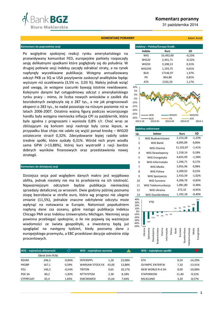 Komentarz poranny 31 października 2014 KOMENTARZ PORANNY WIG - najwyższa aktywność WIG - największe wzrosty 1D -0,23% -0,32% 0,31% 0,01% 1,47% 0,81% 1,17% WIG20 PX 2014-04 WIG250 ATX 2014-07 2014-10 Indeksy sektorowe Lp. Sektor 1D -1,23% Kurs 2,153,28 1 WIG Budownictowo 2 WIG Banki 8,095,89 0,06% 3 WIG Chemia 11,102,07 -1,41% 4 WIG Deweloperzy 1,318,14 0,18% 5 WIG Energetyka 4,655,99 -1,58% 6 WIG Informatyka 1,346,71 0,17% 7 WIG Media 3,955,96 0,98% 8 WIG Paliwa 3,209,92 0,25% 9 WIG Spożywczy 2,433,59 -1,02% 10 WIG Surowce 4,206,78 -0,83% 11 WIG Telekomunikacja 1,081,80 -0,48% 12 WIG Ukraina 272,32 -0,95% 13 WIG Dywidendowy 1,192,18 -0,40% 35% YTD 5% 8% Dywidendowy -5% -5% 14% Telekomunikacja 2% 1% -1% 0% -11% -25% Media Energetyka Banki Surowce Paliwa Chemia -45% Informatyka 40% 30% 20% 10% 0% -10% -20% -30% -40% -50% Deweloperzy Dzisiejsza sesja pod względem danych makro jest wyjątkowo obfita, jednak niestety nie ma to przełożenia na ich istotność. Najważniejszym odczytem będzie publikacja niemieckiej sprzedaży detalicznej za wrzesień. Dwie godziny później poznamy stopę bezrobocia w strefie euro, która wg prognoz nie ulegnie zmianie (11,5%), jednakże znaczne odchylenie odczytu może wpłynąć na notowania w Europie. Natomiast popołudniem napłyną dane zza oceanu, gdzie nastąpi publikacja Indeksu Chicago PMI oraz Indeksu Uniwersytetu Michigan. Niemniej sesja powinna przebiegać spokojnie, o ile nie pojawią się ważniejsze wiadomości ze świata geopolityki, a inwestorzy będą już spoglądać na następny tydzień, kiedy poznamy dane z europejskiego przemysłu, a EBC przedstawi decyzje odnośnie stóp procentowych. WIG BUX 2014-01 Budownictowo Komentarz do dzisiejszej sesji 10% 5% 0% -5% -10% -15% -20% -25% -30% 2013-10 Ukraina Po względnie spokojnej reakcji rynku amerykańskiego na przewidywany komunikat FED, europejskie parkiety rozpoczęły sesję delikatnymi spadkami które pogłębiały się do południa. W drugiej połowie sesji indeksy zaczęły odrabiać straty, a na rynek napłynęły wyczekiwane publikacje. Wstępny annualizowany odczyt PKB za 3Q w USA pozytywnie zaskoczył analityków będąc wyższym niż oczekiwania (3,5% vs. 3,03 %). Należy jednak wziąć pod uwagę, że wstępne szacunki bywają istotnie rewidowane. Kolejnymi danymi był cotygodniowy odczyt z amerykańskiego rynku pracy - mimo, że liczba nowych wniosków o zasiłek dla bezrobotnych zwiększyła się o 287 tys., a nie jak prognozowali eksperci o 283 tys., to nadal pozostaje na niższym poziomie niż w latach 2006-2007. Ostatnia ważną figurą podczas wczorajszego handlu była wstępna niemiecka inflacja CPI za październik, która była zgodna z prognozami i wyniosła 0,8% r/r. Choć wraz ze zbliżającym się końcem sesji nastroje były coraz lepsze, w przypadku blue chips nie udało się wyjść ponad kreskę – WIG20 ostatecznie stracił 0,32%. Zdecydowanie lepiej radziły sobie średnie spółki, które zyskały 0,31%. Wśród nich prym wiodła sama GPW (+13,88%), której kurs wystrzelił z racji bardzo dobrych wyników finansowych oraz przedstawienia nowej strategii. Indeksy – Polska/Europa Środk. Indeks Kurs WIG 53,492,00 WIG20 2,441,71 WIG50 3,108,13 WIG250 1,193,75 BUX 17146,97 PX 964,88 ATX 2192,29 Spożywczy Komentarz do poprzedniej sesji Adam Anioł WIG - największe spadki Obrót (mln PLN) KGHM 246,3 -0,84% INTERSPPL 1,28 23,08% EFH 0,24 -14,29% PKOBP 167,1 0,59% WARSAW STOCK EXC 43,00 13,88% OLYMPIC ENTERTAI 7,10 -13,41% PZU 140,3 -0,54% TRITON 0,65 10,17% NEW WORLD R-A SH 0,09 -10,00% PGE SA 80,2 -1,83% NTTSYSTEM 2,38 8,18% STAPORKOW 11,40 -9,52% CYFRPLSAT 65,4 1,83% EMCINSMED 15,64 7,64% MILKILAND 3,20 -8,57% 1 Komentarz poranny 31 października 2014 NOTOWANIA Z DNIA 30.10.2014 Indeksy – Europa źródło: Bloomberg Indeksy – Świat Euro Stoxx 50 DAX FTSE 250 CAC40 RTS XU100 Europa Niemcy Wlk. Brytania Francja Rosja Turcja 3035,9 9114,84 15298,32 4141,24 1098,68 79898,62 0,45% 0,35% 0,42% 0,74% 3,69% 0,39% 15% 20% 10% 15% 5% S&P500 DJI NASDAQ Shanghai B-share Nikkei 225 Bovespa USA USA USA Chiny Japonia Brazylia 0,62% 1,30% 0,37% 1,22% 4,83% 2,52% 1,994,65 17,195,42 4,566,14 2,420,33 16,413,76 52,336,83 10% 0% -5% 5% -10% 0% -15% -5% -20% -10% -25% -30% DAX -35% 2013-10 XU100 2014-01 CAC40 RTS FTSE250 2014-04 -15% 2014-07 2014-10 Surowce / Metale -20% 2013-10 S&P500 DJIA Shanghai 2013-12 2014-02 Nikkei 2014-04 NASDAQ BOVESPA 2014-08 2014-10 2014-06 Surowce / Towary Ropa Crude $/bbl. Miedź $/t Złoto $/t oz. Srebro $/t oz. Aluminium $/t 86,24 6740,00 1198,85 16,50 2025,00 -1,01% -1,10% -1,10% -3,47% -0,25% 15% Kukurydza Future Pszenica Future Soja Future Cukier Future Kawa Future 374,00 536,00 1029,75 16,30 187,60 -0,33% -0,42% -1,84% 0,00% -1,05% 60% 10% 5% 40% 0% 20% -5% -10% 0% -15% -20% -25% -30% 2013-10 Ropa Future Złoto Future Aluminium Future 2014-01 2014-04 -20% Miedź Future Srebro Future 2014-07 2014-10 Waluty (kursy z godziny 8.30) EUR/PLN USD/PLN CHF/PLN GBP/PLN EUR/USD 10% 8% 6% 4% 2% 0% -2% -4% -6% -8% -10% 2013-10 -40% 2013-10 Kukurydza Future Soja Future Kawa Future 2013-12 2014-02 Pszenica Future Cukier Future 2014-04 YTM Rentowność obligacji 4,2118 3,3516 3,4911 5,3524 1,2567 -0,02% 0,35% -0,07% 0,15% -0,36% 2014-06 101,80 104,75 107,07 111,94 134,96 PS0415 PS0416 PS0417 DS1023 WS0429 1,63 1,70 1,80 2,50 2,78 2014-08 2014-10 YTM* 1,86 1,96 2,03 2,96 3,25 * YTM 30 dni wcześniej 2013-12 2014-02 EUR/PLN GBP/PLN 2014-04 2014-06 USD/PLN EUR/USD 2014-08 CHF/PLN 2014-10 3,50 3,30 3,10 2,90 2,70 2,50 2,30 2,10 1,90 1,70 1,50 YTM YTM* PS0415 PS0416 PS0417 DS1023 WS0429 2 Komentarz poranny 31 października 2014 źródło: Bloomberg KALENDARIUM MAKROEKONOMICZNE Data Godz. Kraj Wydarzenie Okres Prog. Poprz. Odczyt 31.10.2014 09:00 Niemcy Sprzedaż detaliczna m/m Wrzesień -0,90% 2,50% -- 31.10.2014 09:00 Niemcy Sprzedaż detaliczna r/r Wrzesień 1,20% 0,10% -- 31.10.2014 12:00 Eurostrefa Bezrobocie Wrzesień 11,50% 11,50% -- 31.10.2014 12:00 