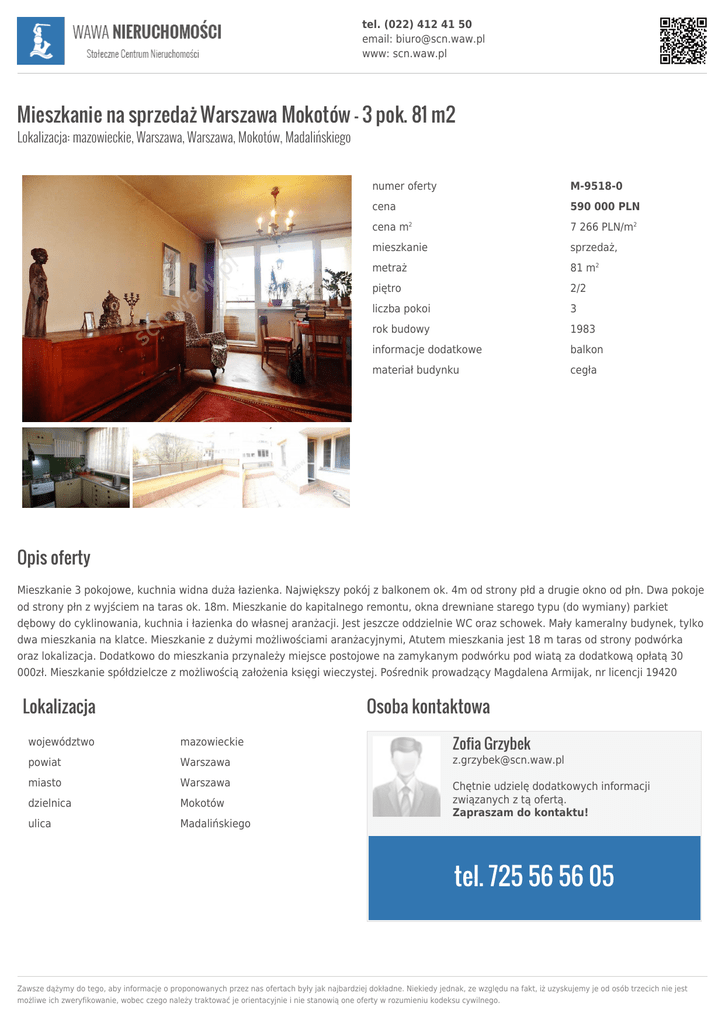 tel. (022) 412 41 50 email: [email protected] www: scn.waw.pl Mieszkanie na sprzedaż Warszawa Mokotów - 3 pok. 81 m2 Lokalizacja: mazowieckie, Warszawa, Warszawa, Mokotów, Madalińskiego numer oferty M-9518-0 cena 590 000 PLN cena m 7 266 PLN/m2 mieszkanie sprzedaż, metraż 81 m2 piętro 2/2 liczba pokoi 3 rok budowy 1983 informacje dodatkowe balkon materiał budynku cegła 2 Opis oferty Mieszkanie 3 pokojowe, kuchnia widna duża łazienka. Największy pokój z balkonem ok. 4m od strony płd a drugie okno od płn. Dwa pokoje od strony płn z wyjściem na taras ok. 18m. Mieszkanie do kapitalnego remontu, okna drewniane starego typu (do wymiany) parkiet dębowy do cyklinowania, kuchnia i łazienka do własnej aranżacji. Jest jeszcze oddzielnie WC oraz schowek. Mały kameralny budynek, tylko dwa mieszkania na klatce. Mieszkanie z dużymi możliwościami aranżacyjnymi, Atutem mieszkania jest 18 m taras od strony podwórka oraz lokalizacja. Dodatkowo do mieszkania przynależy miejsce postojowe na zamykanym podwórku pod wiatą za dodatkową opłatą 30 000zł. Mieszkanie spółdzielcze z możliwością założenia księgi wieczystej. Pośrednik prowadzący Magdalena Armijak, nr licencji 19420 Lokalizacja Osoba kontaktowa Zofia Grzybek województwo mazowieckie powiat Warszawa [email protected] miasto Warszawa dzielnica Mokotów ulica Madalińskiego Chętnie udzielę dodatkowych informacji związanych z tą ofertą. Zapraszam do kontaktu! tel. 725 56 56 05 Zawsze dążymy do tego, aby informacje o proponowanych przez nas ofertach były jak najbardziej dokładne. Niekiedy jednak, ze względu na fakt, iż uzyskujemy je od osób trzecich nie jest możliwe ich zweryfikowanie, wobec czego należy traktować je orientacyjnie i nie stanowią one oferty w rozumieniu kodeksu cywilnego.