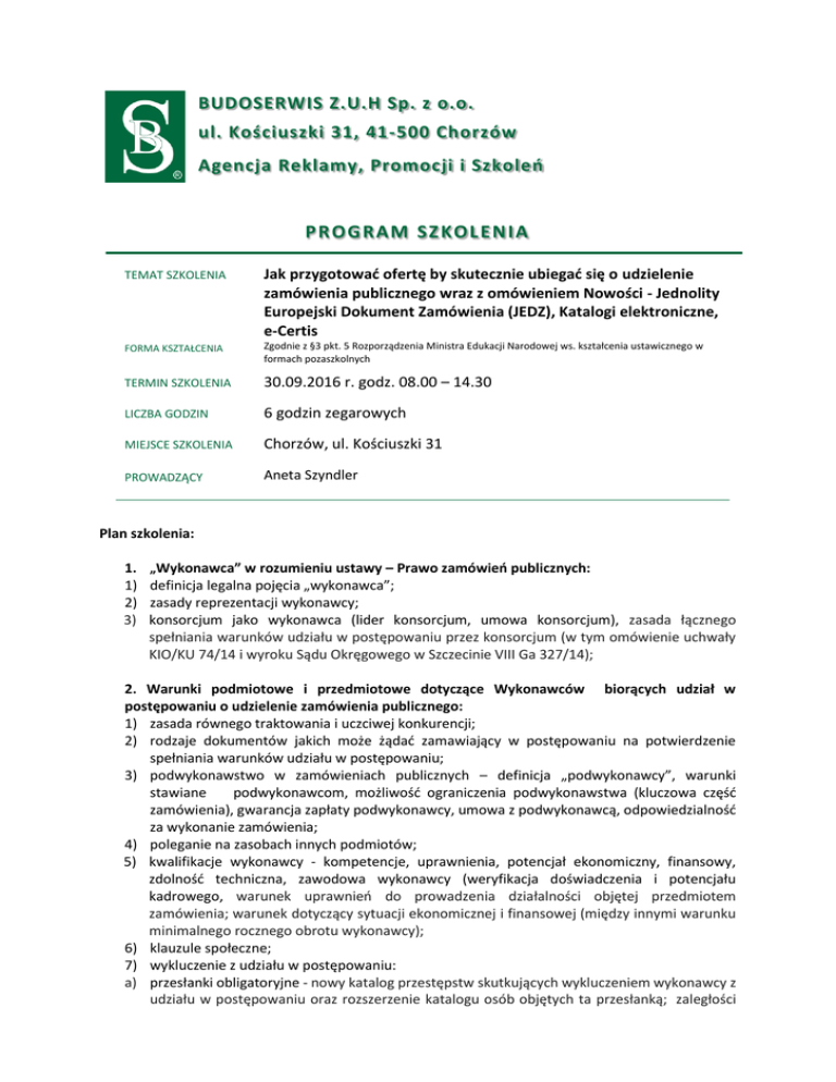 Program szkolenia - Budoserwis Z.U.H. Sp. z o.o.