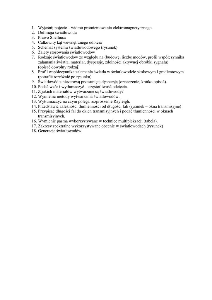 1. 2. 3. 4. 5. 6. 7. Wyjaśnij pojęcie – widmo promieniowania elektromagnetycznego. Definicja światłowodu Prawo Snelliusa Całkowity kąt wewnętrznego odbicia Schemat systemu światłowodowego (rysunek) Zalety stosowania światłowodów Rodzaje światłowodów ze względu na (budowę, liczbę modów, profil współczynnika załamania światła, materiał, dyspersję, zdolności aktywnej obróbki sygnału) (opisać dowolny rodzaj) 8. Profil współczynnika załamania światła w światłowodzie skokowym i gradientowym (potrafić rozróżnić po rysunku) 9. Światłowód z niezerową przesuniętą dyspersją (oznaczenie, krótko opisać). 10. Podać wzór i wytłumaczyć – częstotliwość odcięcia. 11. Z jakich materiałów wytwarzane są światłowody? 12. Wymienić metody wytwarzania światłowodów. 13. Wytłumaczyć na czym polega rozproszenie Rayleigh. 14. Przedstawić zależności tłumienności od długości fali (rysunek – okna transmisyjne) 15. Przypisać długości fal do okien transmisyjnych i podać tłumienności w oknach transmisyjnych. 16. Wymienić pasma wykorzystywane w technice multipleksacji (tabela). 17. Zakresy spektralne wykorzystywane obecnie w światłowodach (rysunek) 18. Generacje światłowodów.