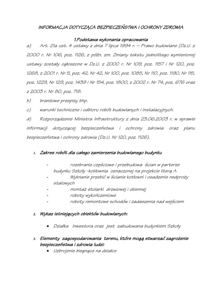 INFORMACJA DOTYCZĄCA BEZPIECZEŃSTWA I OCHRONY ZDROWIA 1.Podstawa wykonania opracowania Art. 21a ust. 4 ustawy z dnia 7 lipca 1994 r. – Prawo budowlane (Dz.U. z a) 2000 r. Nr 106, poz. 1126, z późn. zm. Zmiany tekstu jednolitego wymienionej ustawy zostały ogłoszone w Dz.U. z 2000 r. Nr 109, poz. 1157 i Nr 120, poz. 1268, z 2001 r. Nr 5, poz. 42, Nr 42, Nr 100, poz. 1085, Nr 110, poz. 1190, Nr 115, poz. 1229, Nr 129, poz. 1439 i Nr 154, poz. 1800, z 2002 r. Nr 74, poz. 676 oraz z 2003 r. Nr 80, poz. 718. b) branżowe przepisy bhp. c) warunki techniczne i odbioru robót budowlanych i instalacyjnych. d) Rozporządzenie Ministra Infrastruktury z dnia 23.06.2003 r. w sprawie informacji dotyczącej bezpieczeństwa i ochrony zdrowia oraz planu bezpieczeństwa i ochrony zdrowia (Dz.U. Nr 120, poz. 1126). 1. Zakres robót dla całego zamierzenia budowlanego budynku - 2. rozebranie częściowe i przebudowa ścian w parterze budynku Szkoły -kotłownia oznaczonej na projekcie literą A Wyknanie przebić w ścianie kotłowni i osadzenie nedproży stalowych montaż stolarki drzwiowej i okiennej roboty wykończeniowe roboty remontowe schodów i zadaszenia nad wejściem Wykaz istniejących obiektów budowlanych: Działka Inwestora oraz jest zabudowana budynkiem Szkoły 3. Elementy zagospodarowania terenu, które mogą stwarzać zagrożenie bezpieczeństwa i zdrowia ludzi: Uzbrojenie biegnące na działce Zabudowa istniejąca i będąca w realizacji wokół przebudowywanego budynku 4. Zagrożenia dla bezpieczeństwa i zdrowia ludzi występujących podczas budowy: 4.1. Prowadzenie prac na wysokości powyżej 1,0m, a w szczególności montaż konstrukcji dachowej, krycie blachą, wykonywanie obróbek blacharskich: niebezpieczeństwo upadku z rusztowań bądź dachu; 4.2. Wykonywanie prac z udziałem dźwigu: niebezpieczeństwo związane z zerwaniem się materiału transportowanego i uszkodzeniem dźwigu. 4.3. Wykonanie prac w pobliżu linii mediów –roboty ziemne 5. Sposób prowadzenia instruktażu pracowników przed przystąpieniem do realizacji robót szczególnie niebezpiecznych: 5.1. Przy wykonywaniu konstrukcji ścian: wszyscy pracownicy powinni być zapoznani z przepisami zawartymi w ROZPORZĄDZENIU MINISTRA INFRASTRUKTURY z dnia 6 lutego 2003 roku w sprawie bhp przy wykonywaniu robót budowlanych; Dz. U. nr 47 poz. 401, rozdział 15 roboty montażowe, rozdział 16 – roboty spawalnicze, 5.2. Przy wykonywaniu konstrukcji i pokrycia dachu: wszyscy pracownicy powinni być zapoznani z przepisami zawartymi w ROZPORZĄDZENIU MINISTRA INFRASTRUKTURY z dnia 6 lutego 2003 roku w sprawie bhp przy wykonywaniu robót budowlanych; Dz. U. nr 47 poz. 401, rozdział 9 – roboty na wysokościach, rozdział 15 - roboty montażowe, rozdział 16 – roboty spawalnicze, rozdział 17 – roboty dekarskie i izolacyjne;Zakaz transportu dźwigiem i ręcznie blach trapezowych przy włączonym napięciu linii . 5.3. Przy wykonywaniu prac z użyciem dźwigu: wszyscy pracownicy powinni być zapoznani z przepisami zawartymi w ROZPORZĄDZENIU MINISTRA INFRASTRUKTURY z dnia 6 lutego 2003 roku w sprawie bhp przy wykonywaniu robót budowlanych; Dz. U. nr 47 poz. 401, rozdział 7 – maszyny i inne urządzenia techniczne; 5.4. Przy wykonywaniu prac w pobliżu linii elektroenergetycznej napowietrznej wszyscy pracownicy powinni być zapoznani z przepisami zawartymi w ROZPORZĄDZENIU MINISTRA INFRASTRUKTURY z dnia 6 lutego 2003 roku w sprawie bhp przy wykonywaniu robót budowlanych; Dz. U. nr 47 poz. 401, rozdział 6 – instalacje i urządzenia elektroenergetyczne. - roboty wykonywane pod lub w pobliżu przewodów linii elektroenergetycznych w odległości liczonej poziomo od skrajnych przewodów, mniejszej niż: 3,0 m dla linii o napięciu zmianowym nieprzekraczającym 1kV, 5,0 m dla linii o napięciu zmianowym powyżej 1 kV, lecz nieprzekraczającym 15 kV, 10,0 m dla linii o napięciu zmianowym powyżej 15 kV, lecz nieprzekraczającym 30 kV, ◦ 15,0 m dla linii o napięciu zmianowym powyżej 30 kV, lecz nieprzekraczającym 110 kV 6. Wykaz środków technicznych i organizacyjnych zapobiegających niebezpieczeństwom wynikającym z wykonywania robót budowlanych w strefach szczególnego zagrożenia zdrowia: 61 . . Na pomieszczeniu socjalnym oznaczonym na planie terenu budowy (sporządza kierownik budowy) umieścić wykaz zawierający adresy i numery telefonów: 62 . . Kaski ochronne, umieścić w pomieszczeniu socjalnym oznaczonym na planie j/w; 63 . . Rozmieścić tablice ostrzegawcze i informacyjne; 6.4.prace prowadzić przy dziennym oświetleniu, 6.5.prace winny być kierowane i nadzorowane przez osoby posiadające uprawnienia budowlane branżowe w zakresie sieci i instalacji elektrycznych oraz uprawnienia SEP do wykonywania robót elektrycznych i pomiarów elektrycznych, 6.6 ustalić rodzaje prac, które powinny być wykonywane przez, co najmniej dwie osoby, w celu zapewnienia asekuracji, ze względu na możliwość wystąpienia szczególnego zagrożenia dla zdrowia lub życia ludzkiego, 6.7.składowanie materiałów budowlanych prowadzać w miejscu, w którym nie będą stwarzały zagrożenia dla otoczenia, 6.8.stosować wyłączenie i uziemienie sieci elektroenergetycznej, zapewnić wyposażenie placu budowy w niezbędne środki p.poż., zapewnić wyposażenie budowy w podstawowe środki pierwszej pomocy.