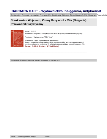 Utworzono Antykwariat : 09 marzec 2017 BARBARA H.U.P. - Wydawnictwo, Księgarnia, Antykwariat > Przyroda i turystyka > Przewodniki > Stankiewicz Wojciech, Zimny Krzysztof - Riła (Bułgaria). Przewodnik tu Stankiewicz Wojciech, Zimny Krzysztof - Riła (Bułgaria). Przewodnik turystyczny Model : 131211 Stankiewicz Wojciech, Zimny Krzysztof - Riła (Bułgaria). Przewodnik turystyczny Producent : Wydawnictwo PTTK "Kraj" Przewodnik z serii: Z plecakiem w góry Europy. Autorzy omawiają ogólne wiadomości o pasmie górskim, jego zagospodarowaniu i turystyce, obszernie omówione 72 szlaki piesze pozwalające poznać bogactwo Riły. Cena : 5,00 zł Brutto ( 4,76 zł Netto) Dostępność: Produkt dostępny w naszym sklepie od 20 marzec 2015 kontakt : - [email protected] Strona 1
