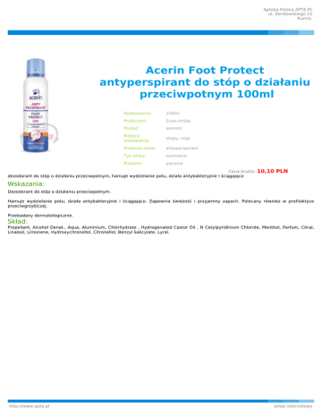 Apteka Polska APTE.PL ul. Derdowskiego 21 Rumia Acerin Foot Protect antyperspirant do stóp o działaniu przeciwpotnym 100ml Opakowanie: 100ml Producent: Scan-Anida Postać: aerozol Miejsce stosowania: stopy, nogi Przeznaczenie: antyperspirant Typ skóry: normalna Problem: pocenie Cena brutto: dezodorant do stóp o działaniu przeciwpotnym, hamuje wydzielanie potu, działa antybakteryjnie i ściągająco 10,10 PLN Wskazania: Dezodorant do stóp o działaniu przeciwpotnym. Hamuje wydzielanie potu, działa antybakteryjnie i ściągająco. Zapewnia świeżość i przyjemny zapach. Polecany również w profilaktyce przeciwgrzybiczej. Przebadany dermatologicznie. Skład: Propellant, Alcohol Denat., Aqua, Aluminium, Chlorhydrate , Hydrogenated Castor Oil , N Cetylpyridinium Chloride, Menthol, Parfum, Citral, Linalool, Limonene, Hydroxycitronellol, Citronellol, Benzyl Salicylate, Lyral. http://www.apte.pl sklep internetowy