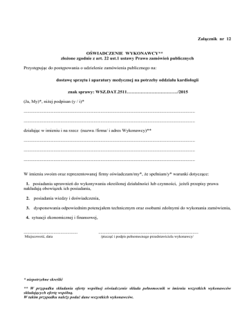 Załącznik nr 12 OŚWIADCZENIE WYKONAWCY** złożone zgodnie z art. 22 ust.1 ustawy Prawo zamówień publicznych Przystępując do postępowania o udzielenie zamówienia publicznego na: dostawę sprzętu i aparatury medycznej na potrzeby oddziału kardiologii znak sprawy: WSZ.DAT.2511……………………………/2015 (Ja, My)*, niżej podpisan (y / i)* ..................................................................................................................................................... ..................................................................................................................................................... działając w imieniu i na rzecz (nazwa /firma/ i adres Wykonawcy)** ..................................................................................................................................................... ..................................................................................................................................................... ..................................................................................................................................................... W imieniu swoim oraz reprezentowanej firmy oświadczam/my*, że spełniam/y* warunki dotyczące: 1. posiadania uprawnień do wykonywania określonej działalności lub czynności, jeżeli przepisy prawa nakładają obowiązek ich posiadania, 2. posiadania wiedzy i doświadczenia, 3. dysponowania odpowiednim potencjałem technicznym oraz osobami zdolnymi do wykonania zamówienia, 4. sytuacji ekonomicznej i finansowej, ............................................... Miejscowość, data ....................................................................................... /pieczęć i podpis pełnomocnego przedstawiciela wykonawcy/ * niepotrzebne skreślić ** W przypadku składania oferty wspólnej oświadczenie składa pełnomocnik w imieniu wszystkich wykonawców składających ofertę wspólną. W takim przypadku należy podać dane wszystkich wykonawców. Załącznik nr 13 OŚWIADCZENIE WYKONAWCY** o braku podstaw do wykluczenia z postępowania o udzielenie zamówienia, z powodu niespełnienia warunków, o których mowa w art. 24 ust.1 ustawy Prawo zamówień publicznych Przystępując do postępowania o udzielenie zamówienia publicznego na: dostawę sprzętu i aparatury medycznej na potrzeby oddziału kardiologii znak sprawy: WSZ.DAT.2511……………………………/2015 (Ja, My)*, niżej podpisan (y / i)* ..................................................................................................................................................... ..................................................................................................................................................... działając w imieniu i na rzecz (nazwa /firma/ i adres Wykonawcy)** ..................................................................................................................................................... ..................................................................................................................................................... ..................................................................................................................................................... Oświadczam/my*, iż nie podlegam/y* wykluczeniu z postępowania o udzielenie zamówienia publicznego na podstawie art. 24 ust. 1 ustawy z dnia 29 stycznia 2004 r. Prawo zamówień publicznych. ............................................... ....................................................................................... Miejscowość, data /pieczęć i podpis pełnomocnego przedstawiciela wykonawcy/ * niepotrzebne skreślić ** W przypadku składania oferty wspólnej oświadczenie to muszą złożyć wszyscy wykonawcy składający ofertę wspólną Załącznik nr 15 .................................................... /Nazwa i adres wykonawcy/ Informacja o Wykonawcach wspólnie ubiegających się o udzielenie zamówienia na dostawę sprzętu i aparatury medycznej na potrzeby oddziału kardiologii znak sprawy: WSZ.DAT.2511……………………………/2015 Wykonawcy wspólnie ubiegający się o udzielenie zamówienia Imię i Nazwisko osoby upoważnionej do reprezentowania Adres Telefon / faks / e-mail (...........................) (.........) (.........) (...........................) (...........................) (.........) (.........) (...........................) (...........................) (.........) (.........) Nazwa (...........................) ............................................... Miejscowość, data ....................................................................................... /pieczęć i podpis pełnomocnego przedstawiciela wykonawcy/ W załączeniu: - pełnomocnictwo udzielone osobie / osobom upoważnionym do reprezentowania składających ofertę wspólną wykonawców Uwaga: powyższy załącznik należy wypełnić w przypadku składania oferty wspólnej. Załącznik nr 14 INFORMACJA WYKONAWCY** ubiegającego się o udzielenie zamówienia publicznego złożone na podstawie art.26 ust.2d ustawy z dnia 29 stycznia 2004 r.-Prawo zamówień publicznych (Dz. U. z 2013 roku, poz. 907 ze zm.) Przystępując do postępowania o udzielenie zamówienia publicznego na: dostawę sprzętu i aparatury medycznej na potrzeby oddziału kardiologii znak sprawy: WSZ.DAT.2511……………………………/2015 (Ja, My)*, niżej podpisan (y / i)* ........................................................................................................................................ ........................................................................................................................................ działając w imieniu i na rzecz (nazwa /firma/ i adres Wykonawcy)* .............................................................................................................