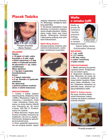 Placek Tadzika ubijamy mikserem ze Śnieżkami. Mieszając, dodajemy tężejącą galaretkę. 4. Na placek wykładamy masę dyniową, na nią krem i przykrywamy drugim plackiem. Wykładamy masę, krem oraz trzeci placek. Smarujemy kremem i dekorujemy polewą oraz wiórkami kokosowymi. Przepis przysłała Marta Rodzeń SKŁADNIKI Ciasto: ● 10 jajek ● 2 szkl. cukru kryształu ● 2 szkl. mąki ● kisiel cytrynowy ● 3 dag maku ● 2 łyżeczki proszku do pieczenia ● 1 op. cukru waniliowego Masa dyniowa: ● 1 kg dyni ● galaretka brzoskwiniowa Krem: ● 1 jogurt naturalny ● 2 op. Śnieżki ● 2 galaretki wiśniowe Do dekoracji: ● gotowa polewa czekoladowa ● wiórki kokosowe PRZYGOTOWANIE 1. Ciasto: z białek ubijamy sztywną pianę, dodajemy cukry i żółtka. Wsypujemy mąkę wymieszaną z proszkiem, kisiel i mak i mieszamy. Ciasto wlewamy na dużą blachę (38x26 cm). Pieczemy ok. 40 minut w temp. 160-180 °C. Przekrawamy na 3 placki. 2. Masa dyniowa: miąższ dyni kroimy w kostkę i smażymy do miękkości, ale nie na „papkę". Pod koniec dodajemy galaretkę brzoskwiniową. 3. Krem: galaretki rozpuszczamy we wrzącej wodzie. Jogurt RADY Marty Rodzeń Zamiast polewy możemy użyć wiórków kokosowych, czekolady i zmielonych orzechów. 1. 2. Wafle o smaku toffi Wafle są proste do zrobienia i bardzo smaczne. Znikają Przepis przysłała z talerza S. Sołtys-Janiec w tempie błyskawicznym. Sylwia Sołtys-Janiec, Gościeradów Ukazowy SKŁADNIKI ● 1 op. wafli ● 1,5 l mleka ● 60 dag cukru ● cukier waniliowy ● łyżka masła PRZYGOTOWANIE 1. Mleko wlewamy do garnka z grubym dnem. Podgrzewamy na małym ogniu. 2. Stopniowo dodajemy cukier. Mieszamy od czasu do czasu, aż powstanie gęsta masa (około 2 godzin). Dodajemy cukier waniliowy i masło. Dokładnie mieszamy na jednolitą masę. Jeszcze ciepłą przekładamy wafle. RADY S. Sołtys-Janiec Do masy możemy dodać wiórki kokosowe, kakao, chałwę lub drobno zmielone orzechy włoskie. 3. Przyślij przepis 57 PP10s5661_slodkie.indd 57 9/16/09 11:40:00 AM
