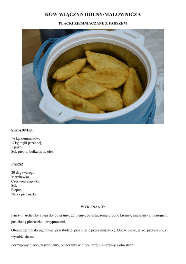 KGW WIĄCZYŃ DOLNY/MALOWNICZA PLACKI ZIEMNIACZANE Z FARSZEM SKŁADNIKI: ½ kg ziemniaków, ¼ kg mąki pszennej, 1 jajko, Sól, pieprz, bułka tarta, olej. FARSZ: 20 dag twarogu, Marchewka, Czerwona papryka, Sól, Pieprz, Natka pietruszki. WYKONANIE: Farsz- marchewkę i paprykę obieramy, gotujemy, po ostudzeniu drobno kroimy, mieszamy z twarogiem, posiekaną pietruszką i przyprawami. Obrane ziemniaki ugotować, przestudzić, przepuścić przez maszynkę. Dodać mąkę, jajko, przyprawy, i wyrobić ciasto. Formujemy placki, faszerujemy, obtaczamy w bułce tartej i smażymy z obu stron. ZIEMNIACZANE PĄCZKI SKŁADNIKI: 1 kg mąki, ½ kg ziemniaków, ½ paczki margaryny, ½ szklanki cukru, 10 dag drożdży, 5 jajek, 1 paczka cukru waniliowego, Olej do smażenia, Marmolada do nadziewania pączków, Cukier puder. WYKONANIE: Ugotowane ziemniaki (jeszcze ciepłe) mieszamy z margaryną, po ostudzeniu przekręcamy przez maszynkę. Zagotować pół szklanki wody z cukrami, przestudzić, dodać drożdże. Na stolnicy wszystkie składniki starannie zagniatamy, formujemy pączki, nadziewając każdy marmoladą. Smażymy w głębokim oleju, gotowe posypujemy cukrem pudrem lub przygotowaną polewą. SMACZNEGO