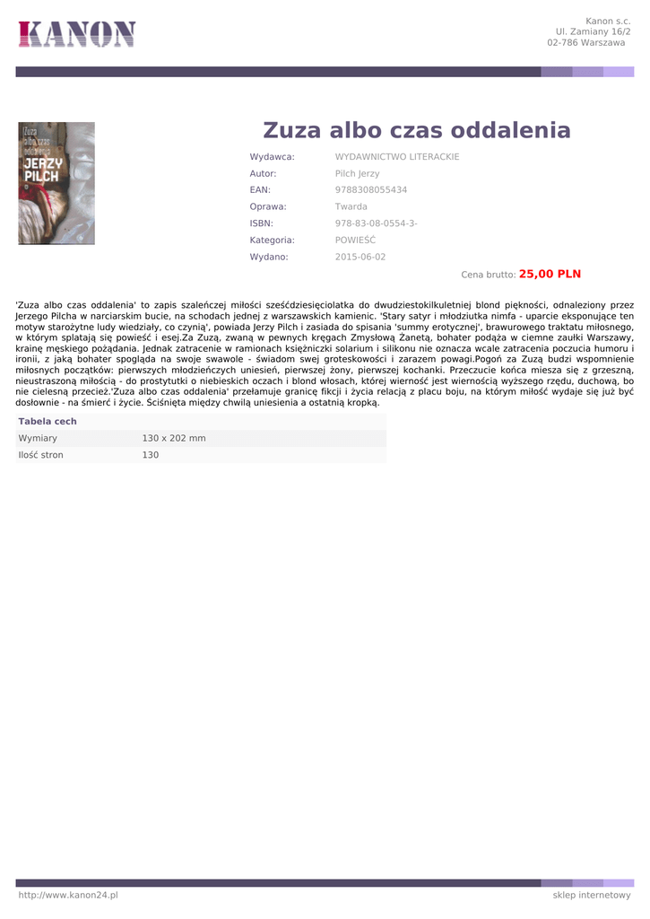 Kanon s.c. Ul. Zamiany 16/2 02-786 Warszawa Zuza albo czas oddalenia Wydawca: WYDAWNICTWO LITERACKIE Autor: Pilch Jerzy EAN: 9788308055434 Oprawa: Twarda ISBN: 978-83-08-0554-3- Kategoria: POWIEŚĆ Wydano: 2015-06-02 Cena brutto: 25,00 PLN 'Zuza albo czas oddalenia' to zapis szaleńczej miłości sześćdziesięciolatka do dwudziestokilkuletniej blond piękności, odnaleziony przez Jerzego Pilcha w narciarskim bucie, na schodach jednej z warszawskich kamienic. 'Stary satyr i młodziutka nimfa - uparcie eksponujące ten motyw starożytne ludy wiedziały, co czynią', powiada Jerzy Pilch i zasiada do spisania 'summy erotycznej', brawurowego traktatu miłosnego, w którym splatają się powieść i esej.Za Zuzą, zwaną w pewnych kręgach Zmysłową Żanetą, bohater podąża w ciemne zaułki Warszawy, krainę męskiego pożądania. Jednak zatracenie w ramionach księżniczki solarium i silikonu nie oznacza wcale zatracenia poczucia humoru i ironii, z jaką bohater spogląda na swoje swawole - świadom swej groteskowości i zarazem powagi.Pogoń za Zuzą budzi wspomnienie miłosnych początków: pierwszych młodzieńczych uniesień, pierwszej żony, pierwszej kochanki. Przeczucie końca miesza się z grzeszną, nieustraszoną miłością - do prostytutki o niebieskich oczach i blond włosach, której wierność jest wiernością wyższego rzędu, duchową, bo nie cielesną przecież.'Zuza albo czas oddalenia' przełamuje granicę fikcji i życia relacją z placu boju, na którym miłość wydaje się już być dosłownie - na śmierć i życie. Ściśnięta między chwilą uniesienia a ostatnią kropką. Tabela cech Wymiary 130 x 202 mm Ilość stron 130 http://www.kanon24.pl sklep internetowy