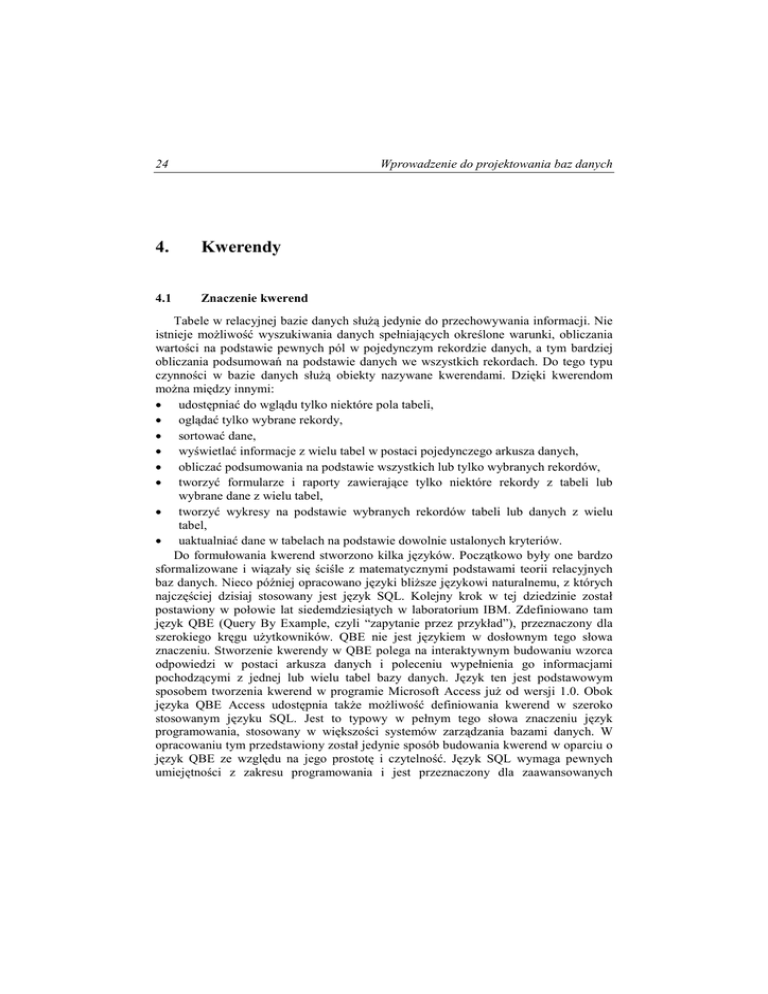 24 Wprowadzenie do projektowania baz danych 4. Kwerendy 4.1 Znaczenie kwerend Tabele w relacyjnej bazie danych słuŜą jedynie do przechowywania informacji. Nie istnieje moŜliwość wyszukiwania danych spełniających określone warunki, obliczania wartości na podstawie pewnych pól w pojedynczym rekordzie danych, a tym bardziej obliczania podsumowań na podstawie danych we wszystkich rekordach. Do tego typu czynności w bazie danych słuŜą obiekty nazywane kwerendami. Dzięki kwerendom moŜna między innymi: • udostępniać do wglądu tylko niektóre pola tabeli, • oglądać tylko wybrane rekordy, • sortować dane, • wyświetlać informacje z wielu tabel w postaci pojedynczego arkusza danych, • obliczać podsumowania na podstawie wszystkich lub tylko wybranych rekordów, • tworzyć formularze i raporty zawierające tylko niektóre rekordy z tabeli lub wybrane dane z wielu tabel, • tworzyć wykresy na podstawie wybranych rekordów tabeli lub danych z wielu tabel, • uaktualniać dane w tabelach na podstawie dowolnie ustalonych kryteriów. Do formułowania kwerend stworzono kilka języków. Początkowo były one bardzo sformalizowane i wiązały się ściśle z matematycznymi podstawami teorii relacyjnych baz danych. Nieco później opracowano języki bliŜsze językowi naturalnemu, z których najczęściej dzisiaj stosowany jest język SQL. Kolejny krok w tej dziedzinie został postawiony w połowie lat siedemdziesiątych w laboratorium IBM. Zdefiniowano tam język QBE (Query By Example, czyli “zapytanie przez przykład”), przeznaczony dla szerokiego kręgu uŜytkowników. QBE nie jest językiem w dosłownym tego słowa znaczeniu. Stworzenie kwerendy w QBE polega na interaktywnym budowaniu wzorca odpowiedzi w postaci arkusza danych i poleceniu wypełnienia go informacjami pochodzącymi z jednej lub wielu tabel bazy danych. Język ten jest podstawowym sposobem tworzenia kwerend w programie Microsoft Access juŜ od wersji 1.0. Obok języka QBE Access udostępnia takŜe moŜliwość definiowania kwerend w szeroko stosowanym języku SQL. Jest to typowy w pełnym tego słowa znaczeniu język programowania, stosowany w większości systemów zarządzania bazami danych. W opracowaniu tym przedstawiony został jedynie sposób budowania kwerend w oparciu o język QBE ze względu na jego prostotę i czytelność. Język SQL wymaga pewnych umiejętności z zakresu programowania i jest przeznaczony dla zaawansowanych Kwerendy 25 uŜytkowników programu Access, stąd teŜ jego prezentacja wykracza poza ramy tej pracy. 4.2 Tworzenie nowej kwerendy Projektowanie kwerend, podobnie jak projektowanie tabel, odbywa się w specjalnym oknie - oknie projektu kwerendy (rys. 4.3). Aby je otworzyć naleŜy w oknie bazy danych (punkt 2.2) wybrać zakładkę Kwerendy, a następnie przycisk Nowy. Pojawi się pole dialogowe (rys. 4.1) zawierające listę umoŜliwiającą wybranie sposobu tworzenia kwerendy. Rys 4.1. Okno dialogowe Nowa kwerenda Wybranie pierwszej z wyświetlonych pozycji listy powoduje przejście do okna projektu kwerendy (rys. 4.3). Wymaga to formułowania kwerendy od podstaw i nie udostępnia narzędzi automatyzujących ten proces. Wybór jednej z pozostałych pozycji uruchamia procedurę kreatora, który pozwala na automatyczne generowanie kwerend. Tworzenie kwerend z zastosowaniem kreatorów jest znacznie prostsze i automatyzuje wiele czynności, ale ogranicza się jedynie do pewnych typowych przypadków i nie pozwala na rozwiązanie wszystkich napotykanych problemów. Ten sposób nie został omówiony w tym opracowaniu, jego opis moŜna znaleźć w plikach pomocy lub literaturze uzupełniającej [1], [5]. W dalszej części tego rozdziału omawiany będzie sposób tworzenia kwerend po wybraniu opcji Widok projektu. Po zaakceptowaniu wyboru opcji przyciskiem OK. i zamknięciu okna Nowa kwerenda na ekranie pojawia się okno projektu kwerendy (rys. 4.3) oraz okno dialogowe Pokazywanie tabeli (rys. 4.2). UmoŜliwia ono wybór tabel lub kwerend źródłowych zawierających dane potrzebne do konstrukcji nowej kwerendy. Okno Pokazywanie tabeli zawiera trzy zakładki umoŜliwiające wybór typu widocznych obiektów. Domyślnie wybrana jest zakładka Tabele i tylko te obiekty są widoczne po otwarciu okna (rys. 4.2). Przełączenie na inną zakładkę pozwala na przeglądanie stworzonych juŜ kwerend (zakładka Kwerendy) lub obu rodzajów obiektów jednocześnie (zakładka Obie). Wyboru obiektów źródłowych dokonuje się przez wskazanie ich na liście i kliknięcie na przycisku Dodaj. Wybrany obiekt pojawia się w 26 Wprowadzenie do projektowania baz danych oknie projektu kwerendy (rys. 4.3). Po dodaniu wszystkich obiektów źródłowych okno dialogowe naleŜy zamknąć klikając na przycisku Zamknij. Rys 4.2. Okno dialogowe PokaŜ tabelę Rys. 4.3 Okno projektu kwerendy Po zamknięciu okno to, w razie potrzeby, moŜe być przywołane na dowolnym etapie projektowania kwerendy przez wybór opcji PokaŜ tabelę z menu Kwerenda, lub naciśnięcie trzynastego przycisku z belki narzędziowej Projekt kwerendy (rys. 4.4). W przypadku pomyłkowego wyboru obiektu źródłowego moŜe on być usunięty z projektu przez wskazanie go myszką i naciśnięcie klawisza DEL lub wybór opcji Usuń tabelę z menu Kwerenda. Okno projektu kwerendy składa się z dwóch części rozdzielonych poziomą linią (rys. 4.3). Część górna to obszar przeznaczony na obiekty źródłowe. Znajdują się w niej wszystkie tabele i kwerendy, które zostały dodane do projektu za pomocą okna Kwerendy 27 Pokazywanie tabeli. Część dolna to tzw. szablon QBE, czyli arkusz, w którym naleŜy zbudować wzorzec odpowiedzi. Pojedyncza kolumna tego arkusza odpowiada jednej kolumnie zestawienia, będącego rezultatem działania kwerendy. Pierwszy górny wiersz zatytułowany Pole przeznaczony jest na nazwę wybranego pola obiektu źródłowego. Rubryka wyposaŜona jest w rozwijaną listę nazw, z której naleŜy dok